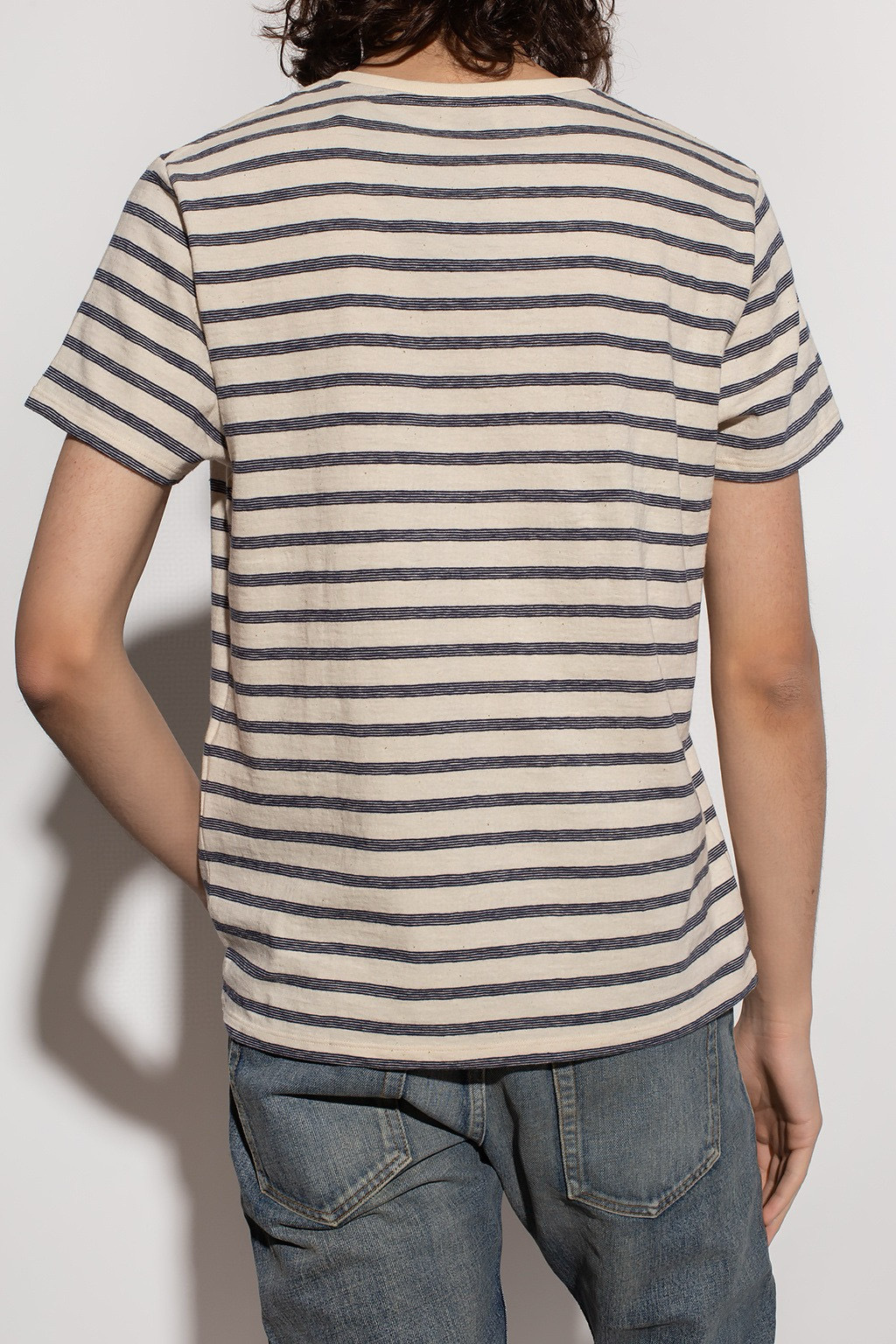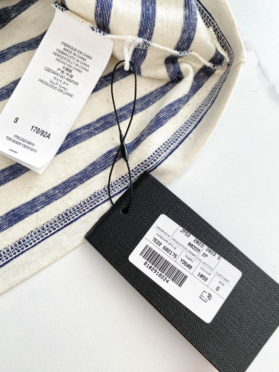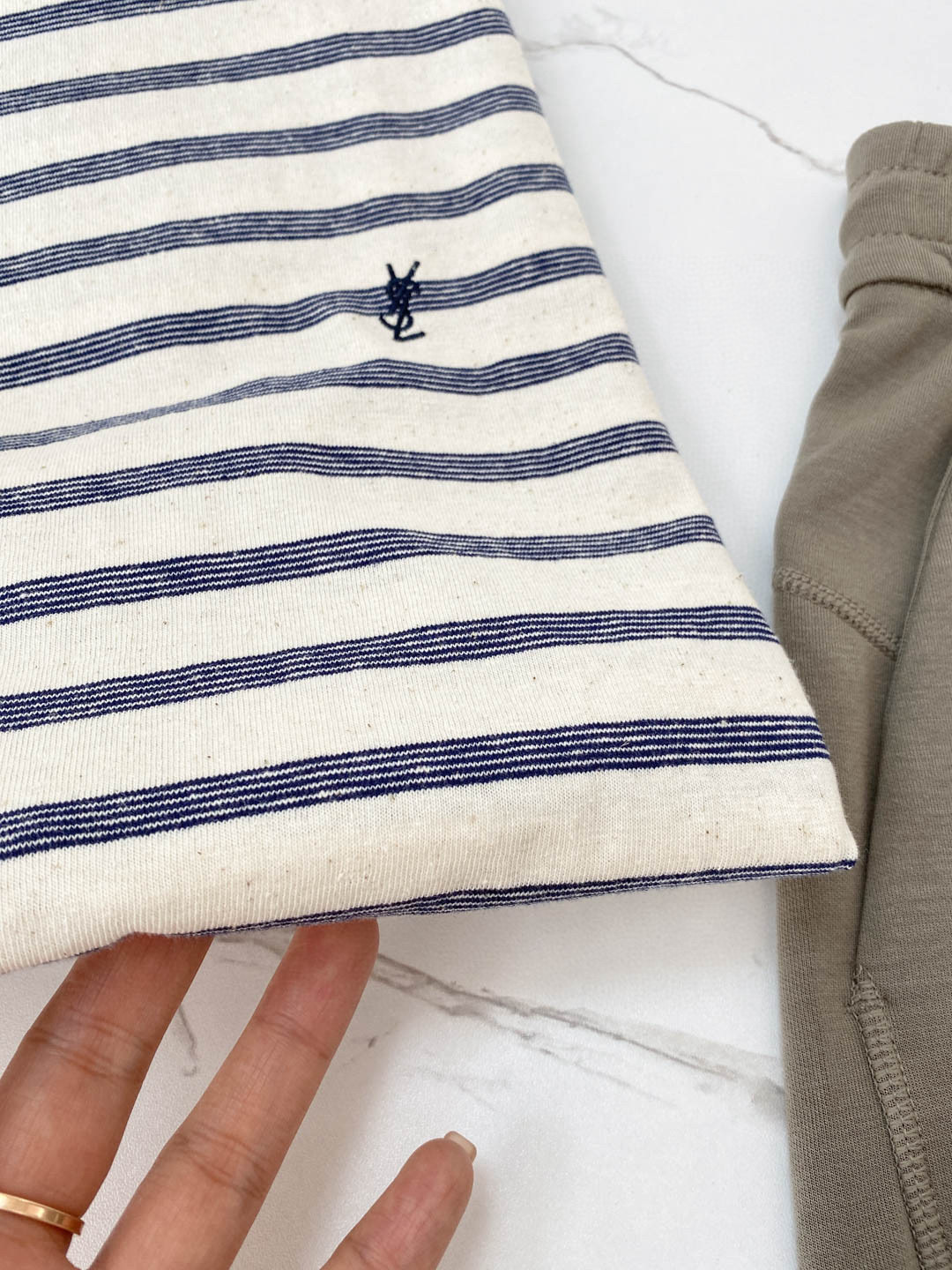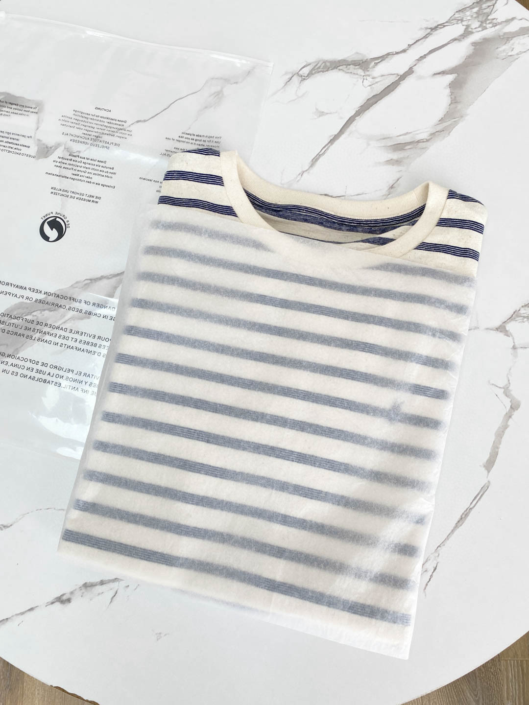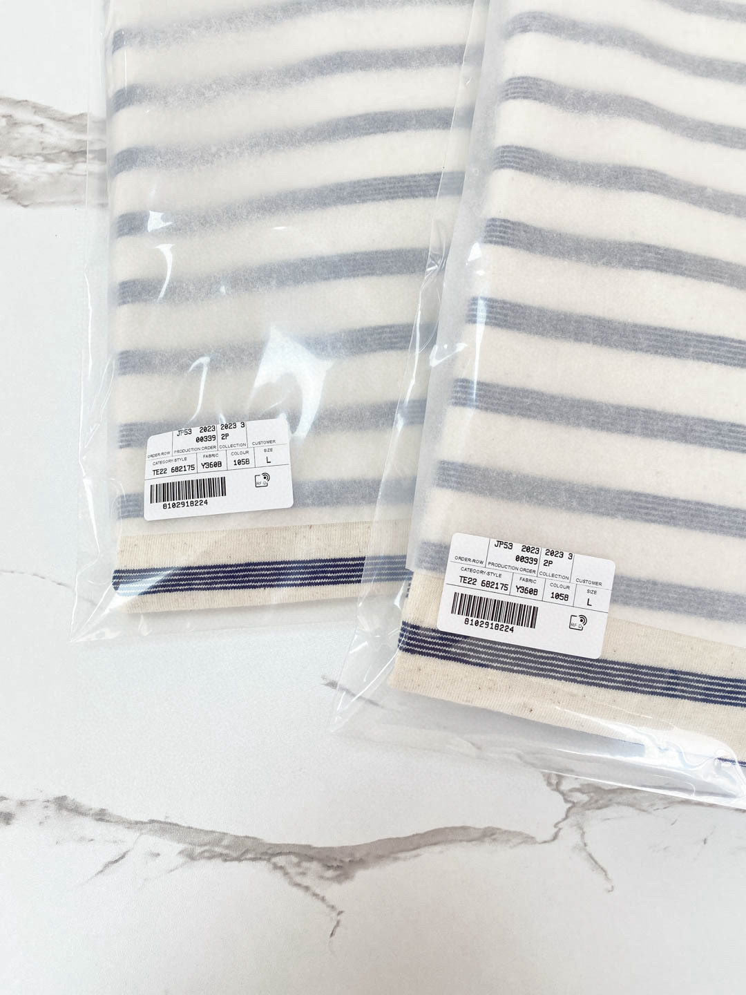 颜色也是那种本质棉麻的自然原胚色,天然未经染色哦,交织的藏青色条纹经德国进口5针机器单边格织针法形成间色效果。
