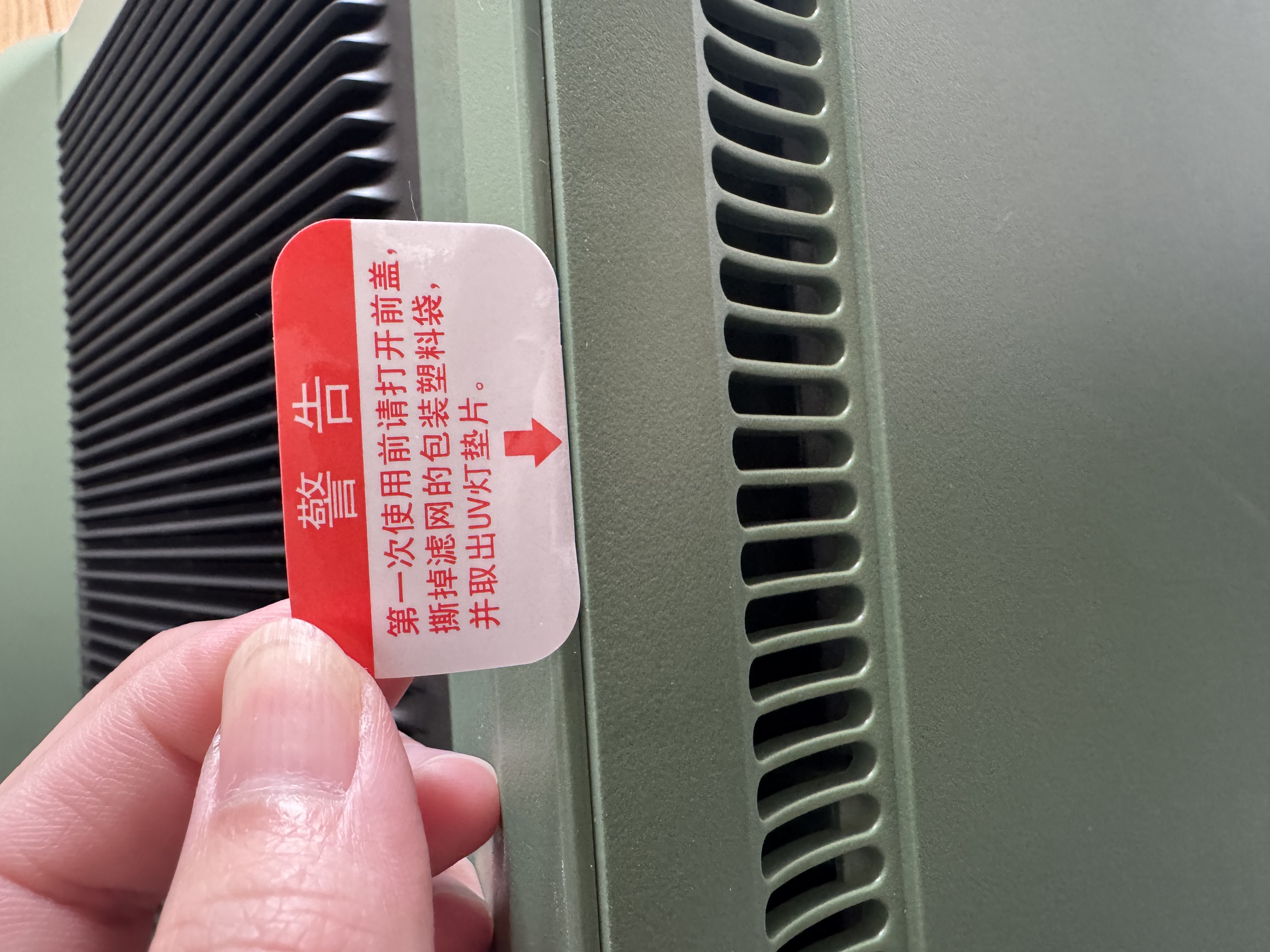 使用机器前,要先做两件事,就是这张小标签上写的“第一次使用前请打开前盖,撕掉滤网的包装塑料袋,并取出UV灯垫片”。