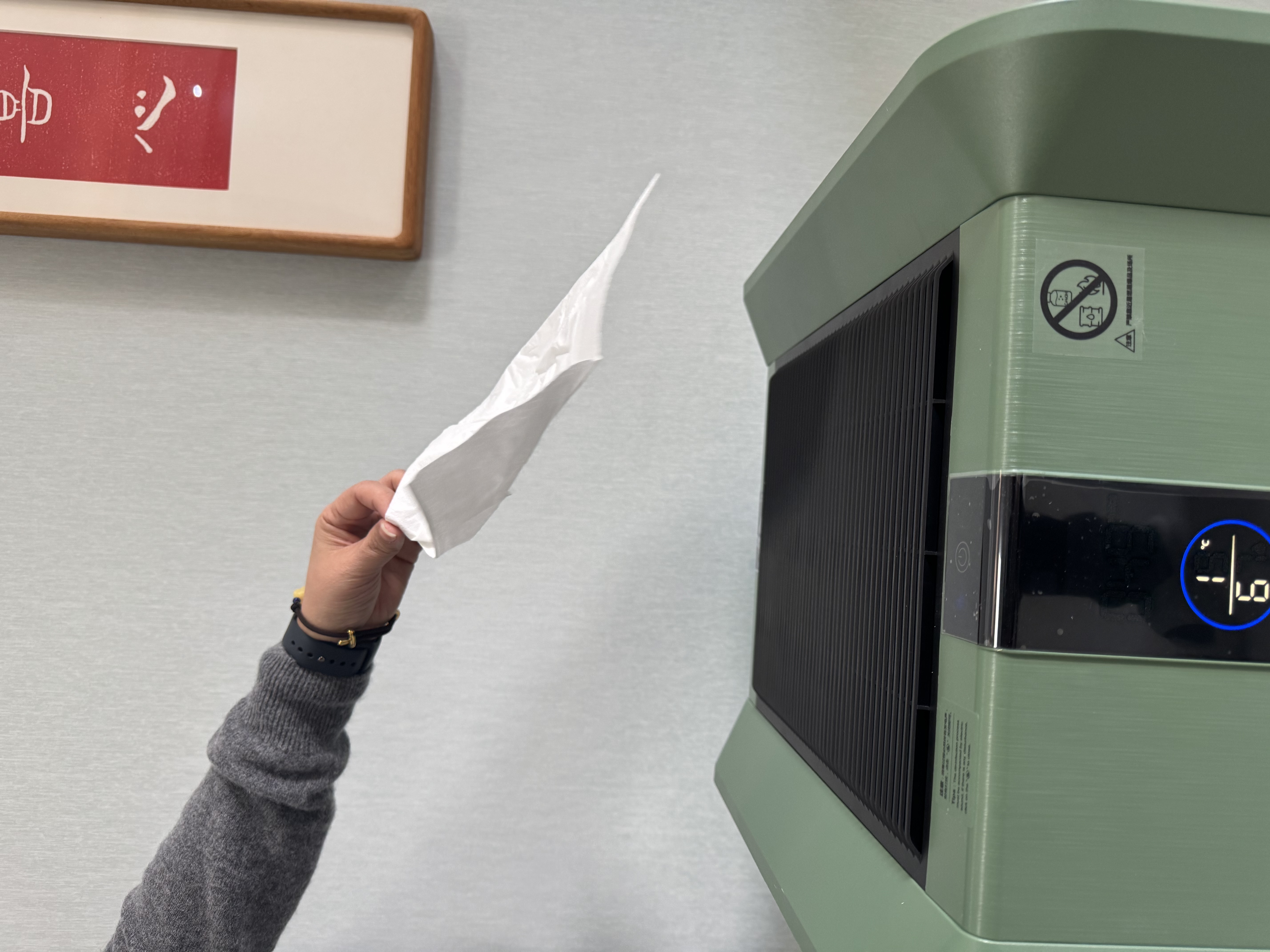 这个时候,我们也不用动它,让它自己工作,眼睛看不出来,其实机器把大量空气吸进去,过滤后再排出来,风量很大,我那了一张餐巾纸放在机器上面,直接被吹起来。
