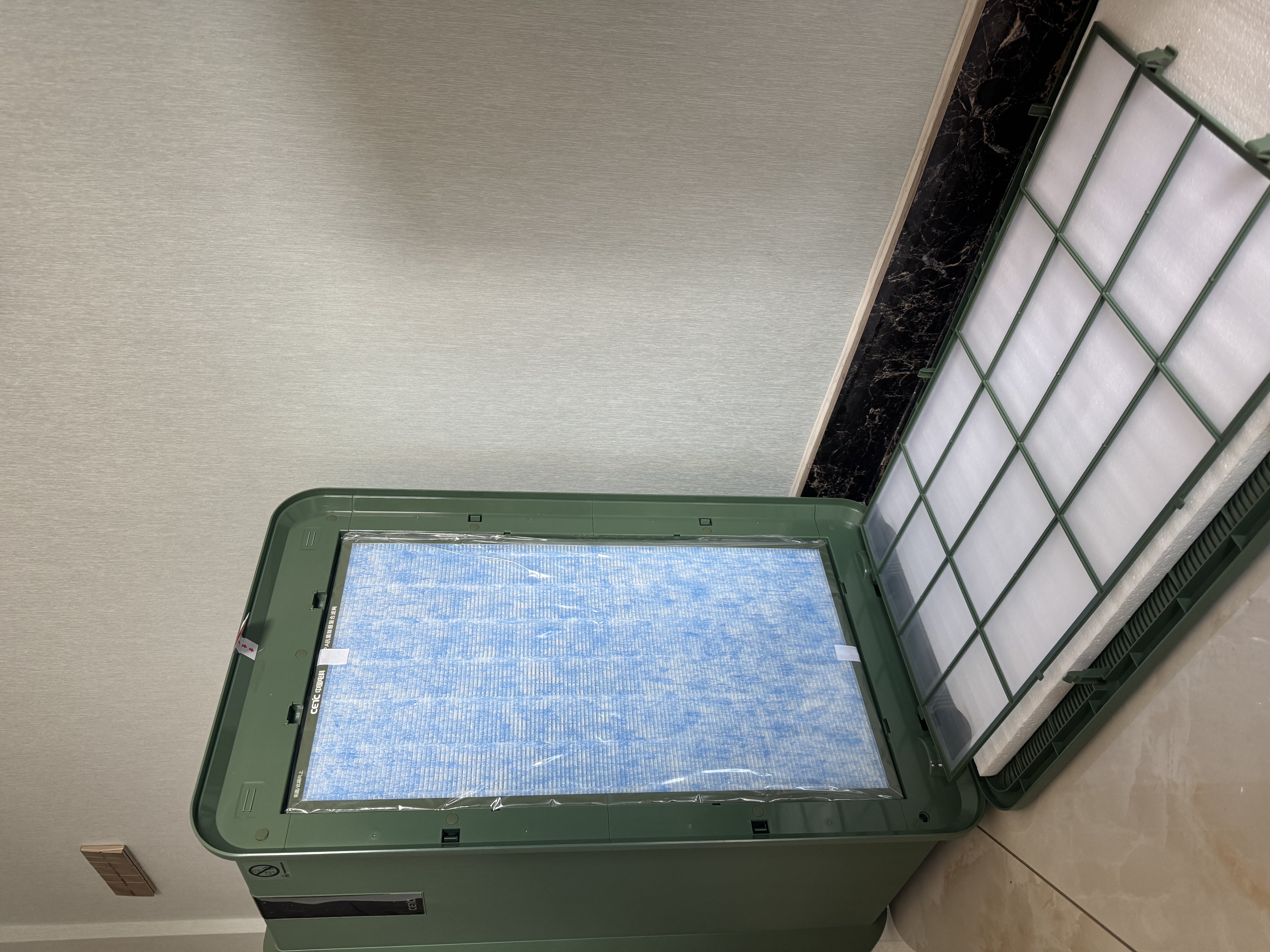 操作很简单,先把进气口的外盖打开,这是磁铁吸住的,轻轻一掰就拿下来了,里面第一层是初效滤网,也拿下来,接下去两块滤芯就是塑料纸包住的,把塑料纸去掉就好了。