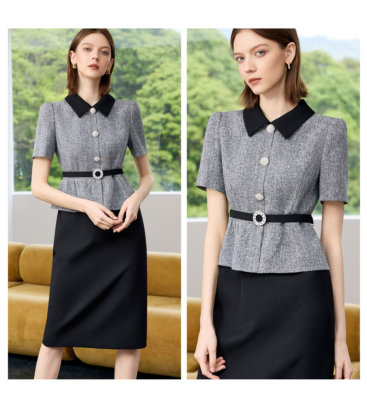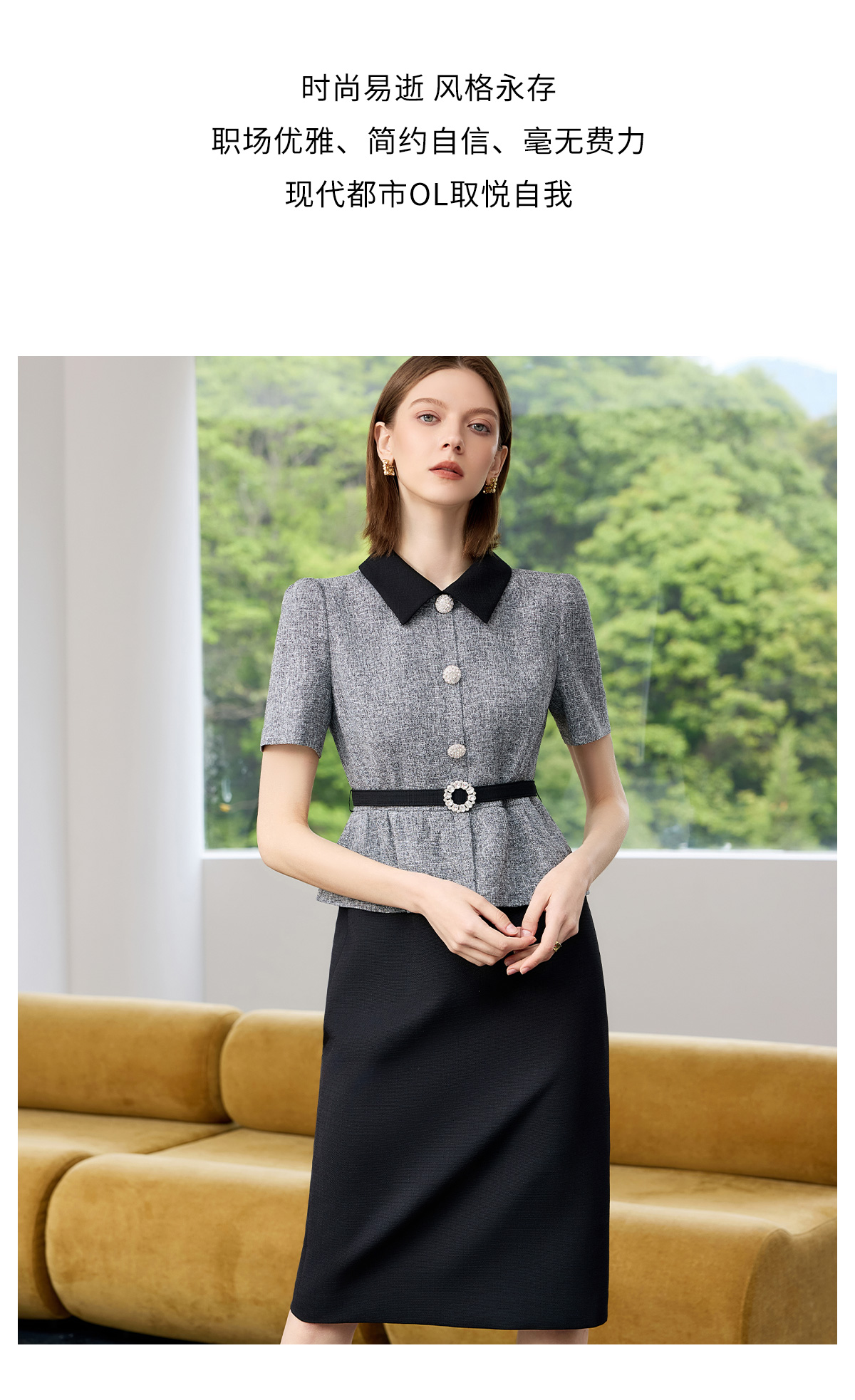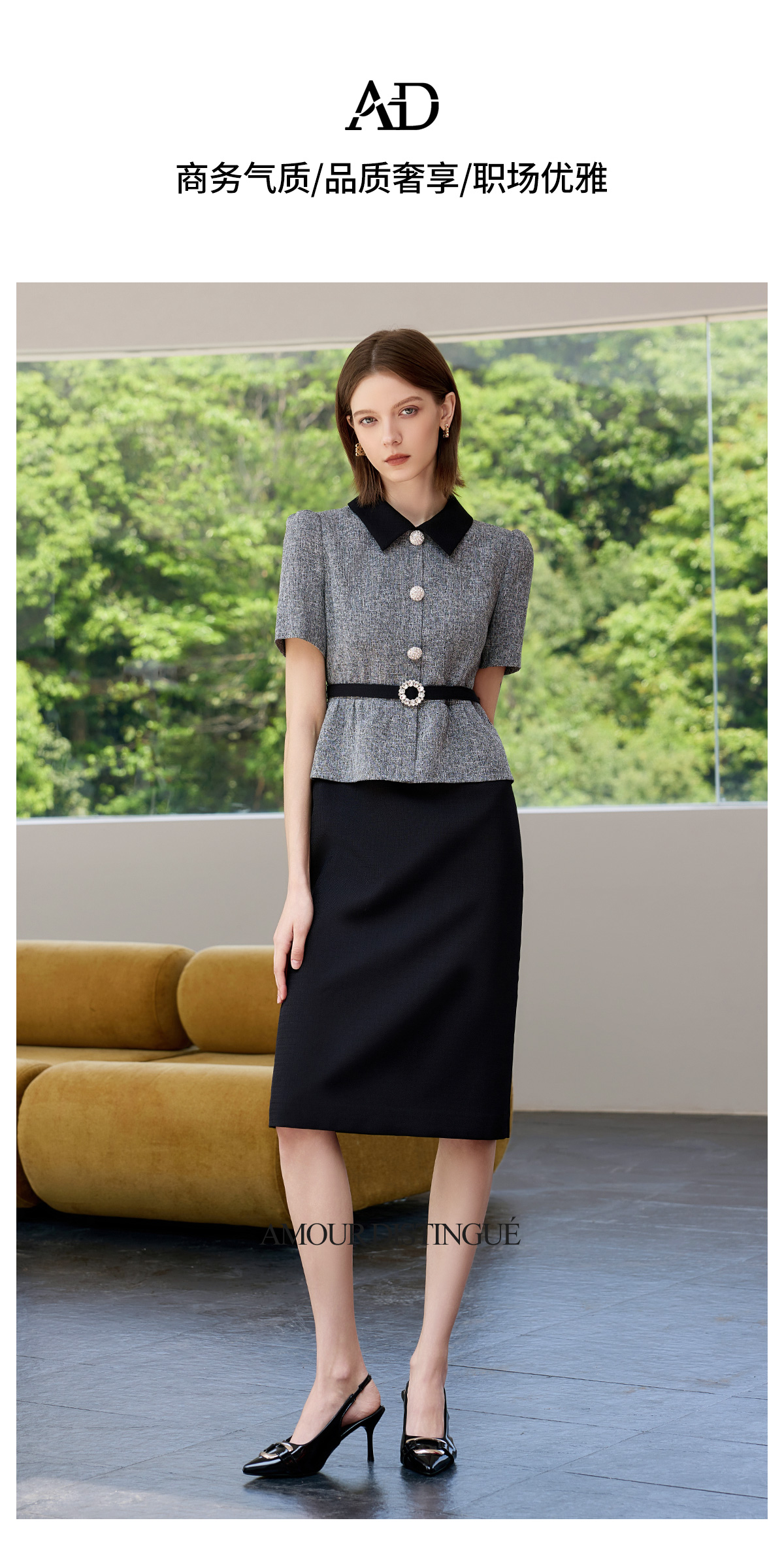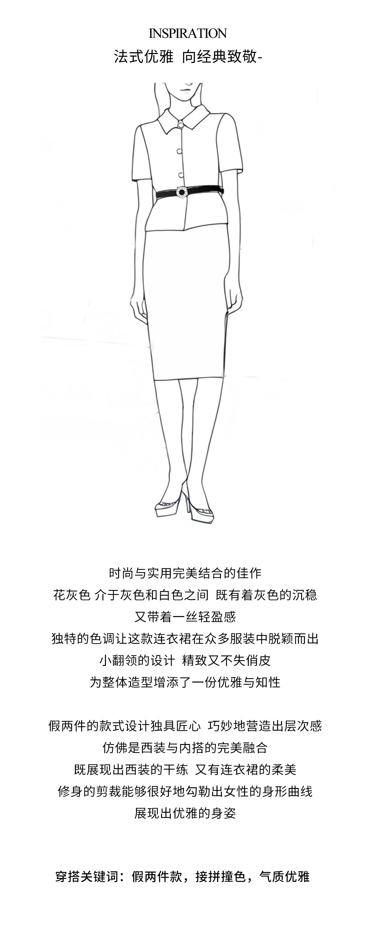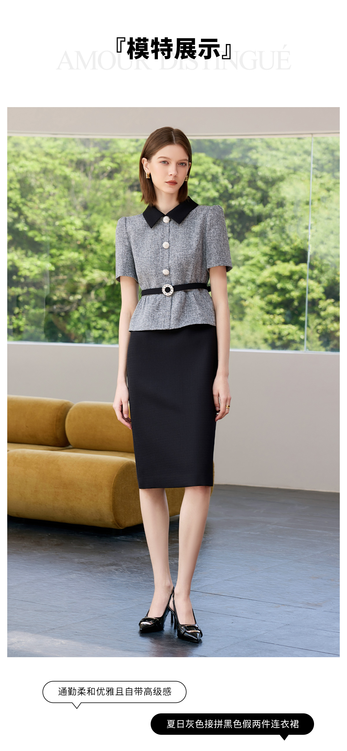 AD黑色包臀裙子女夏连衣裙灰色接拼职业装2025新款假两件西服裙