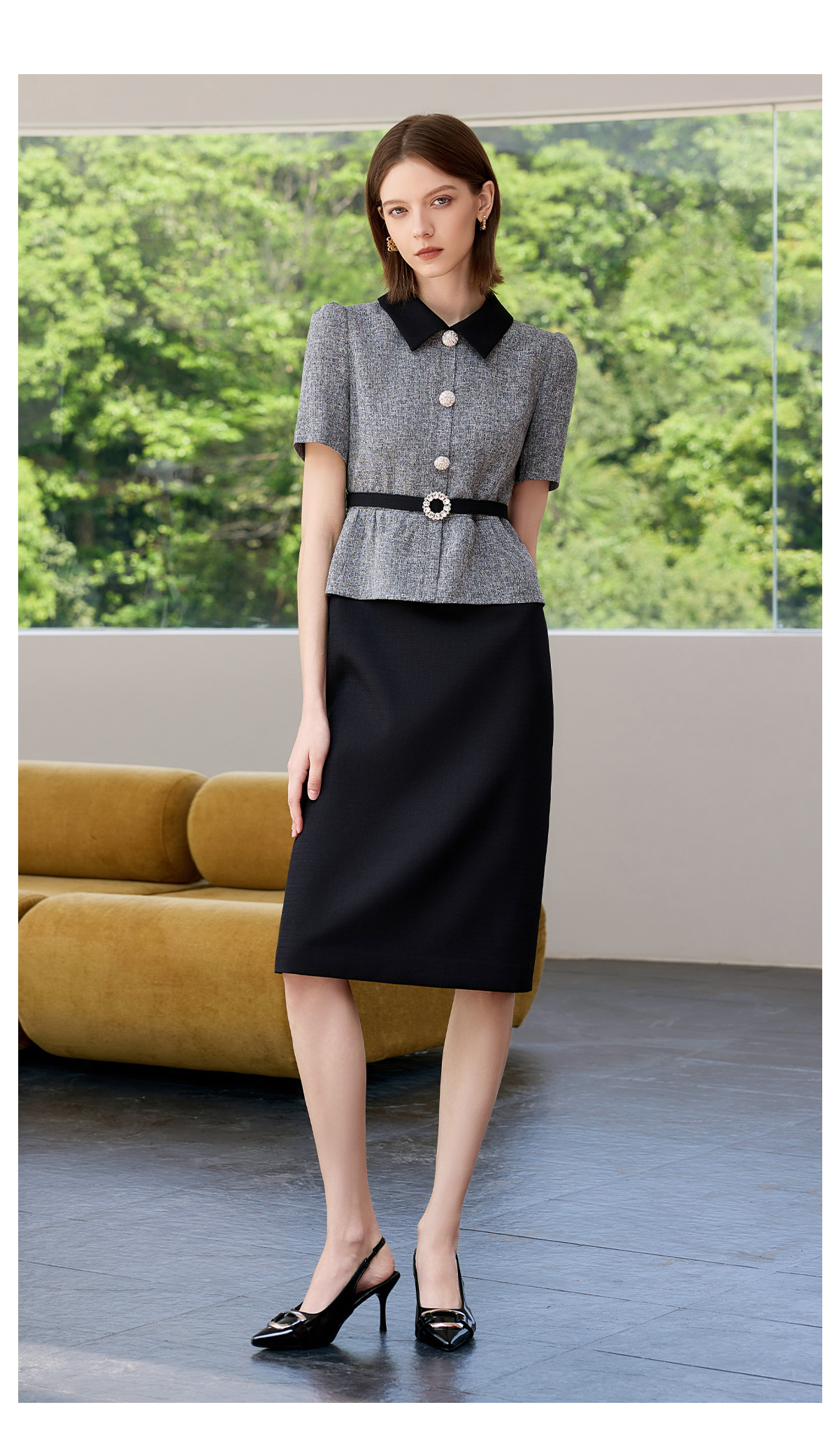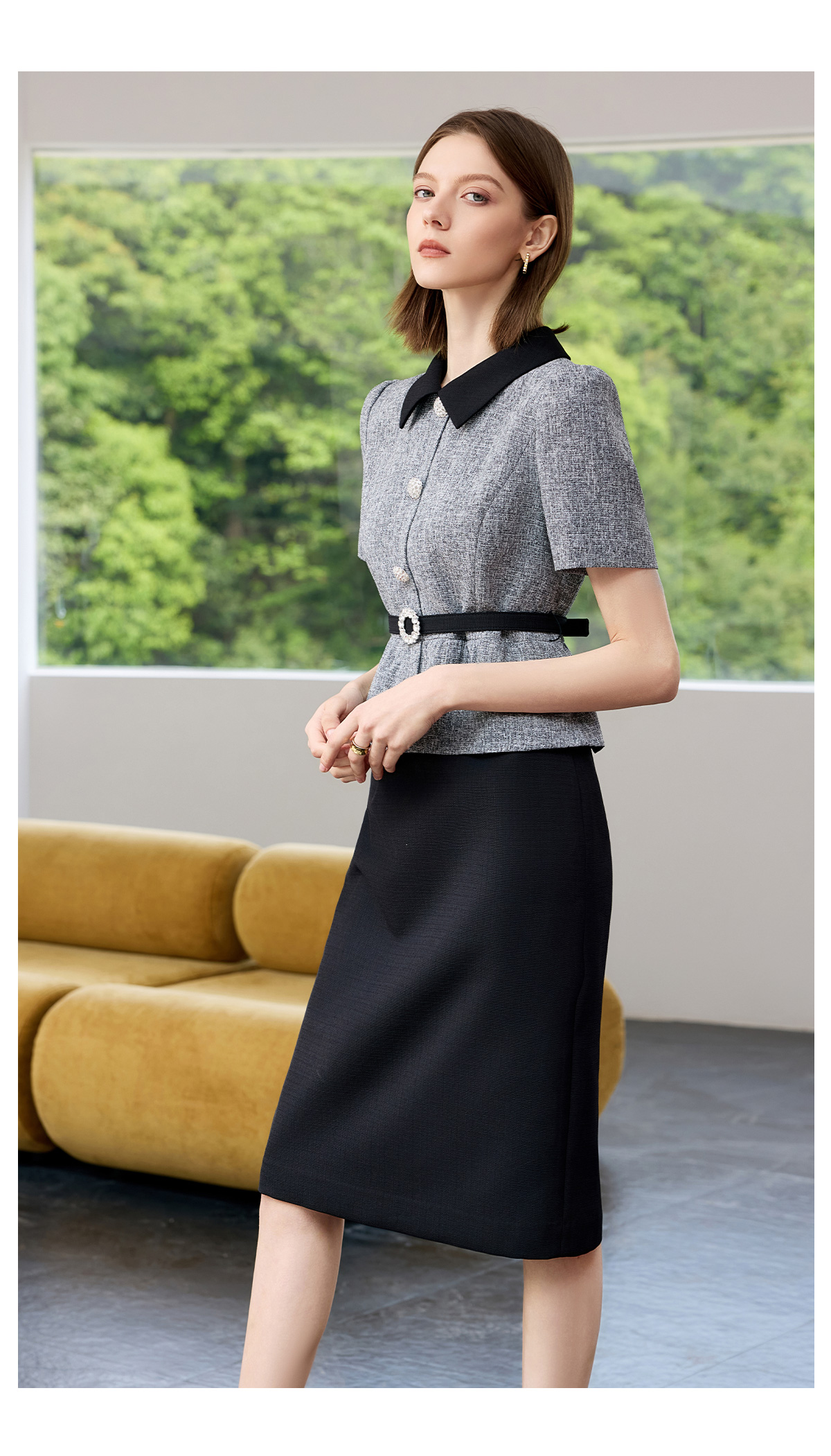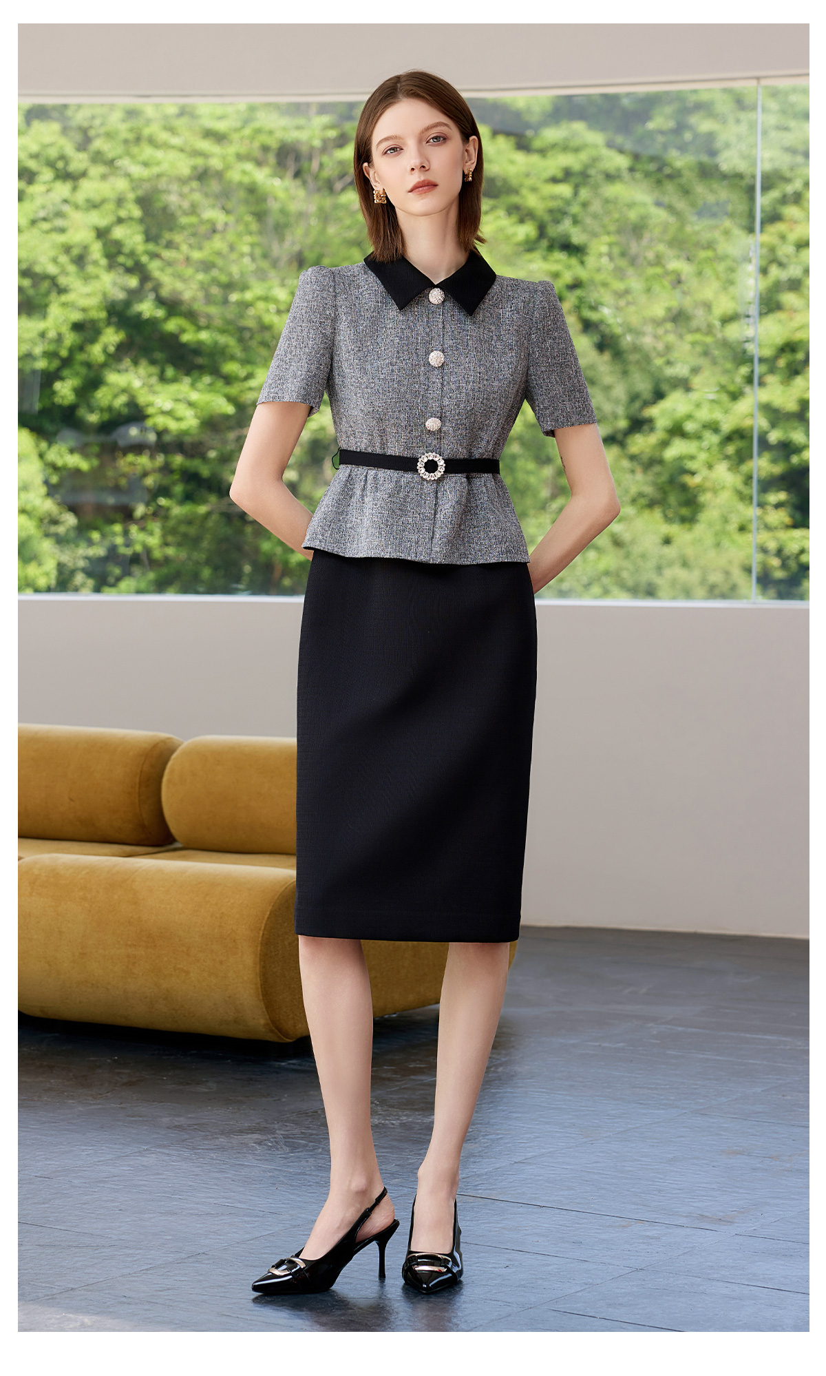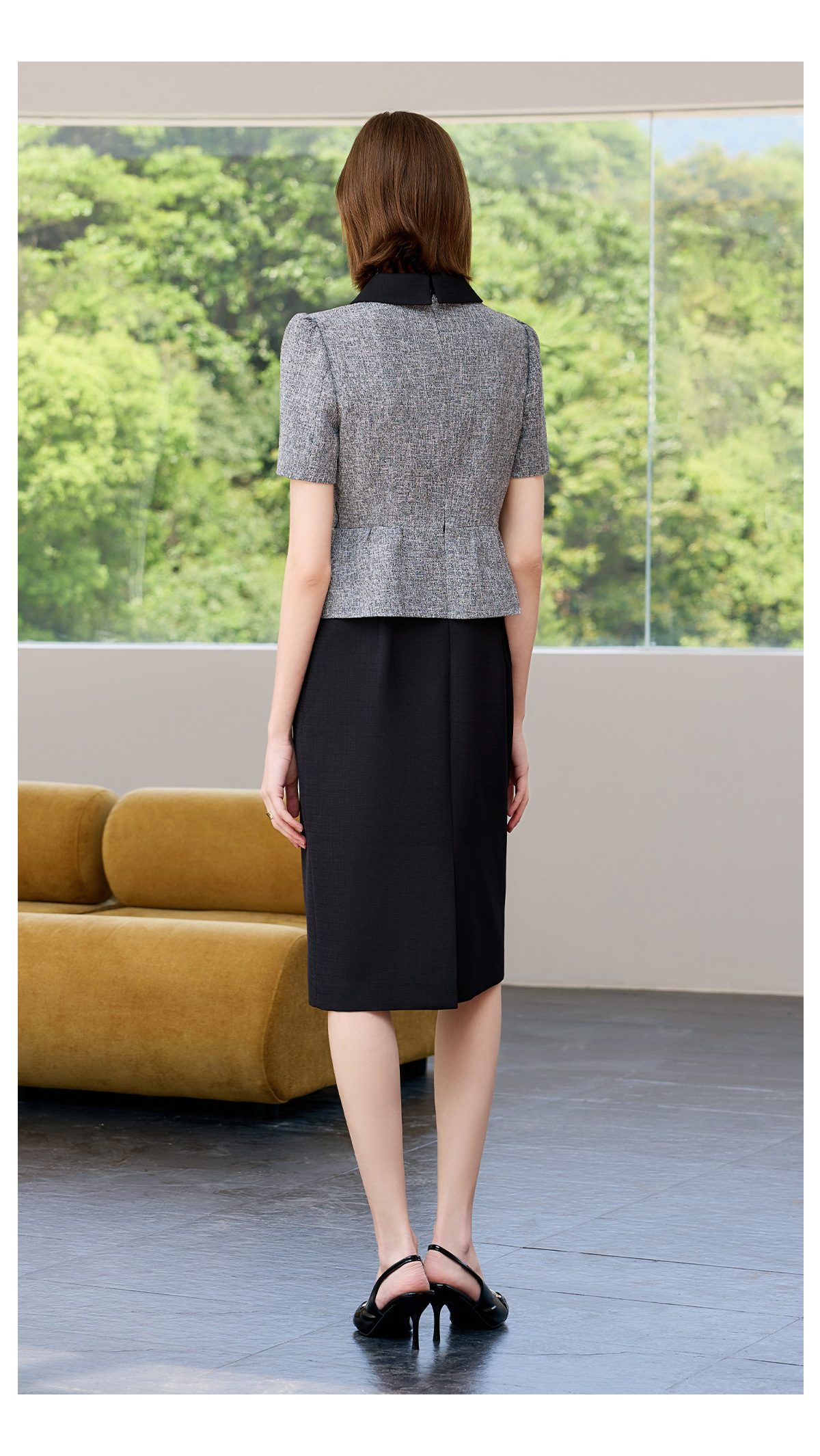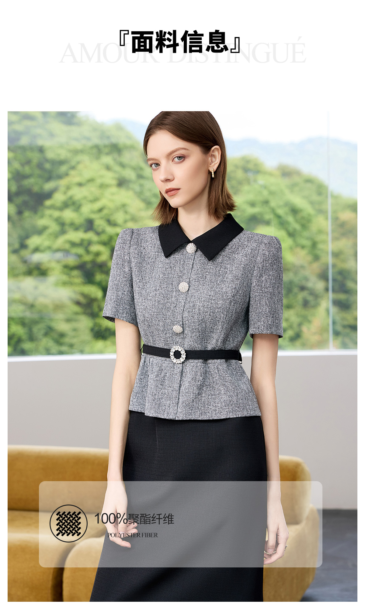 AD黑色包臀裙子女夏连衣裙灰色接拼职业装2025新款假两件西服裙