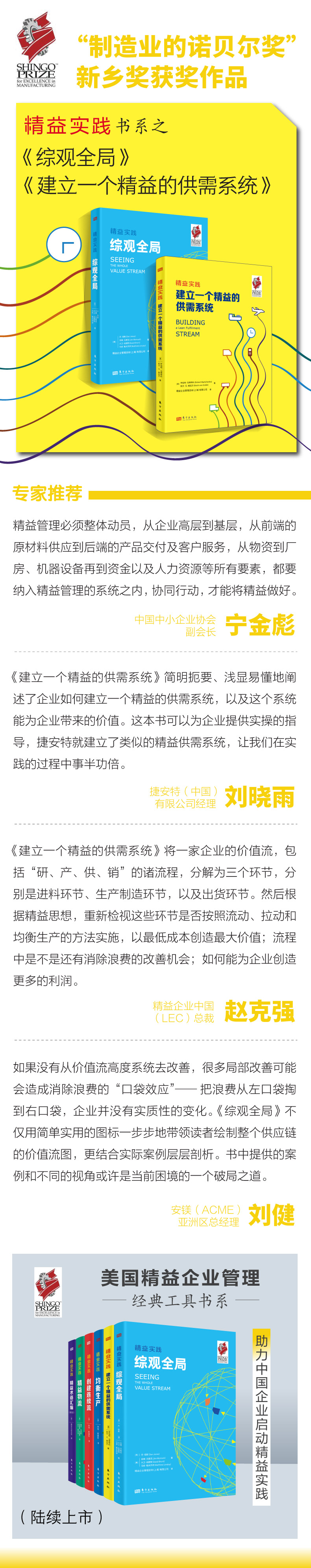 多年前,精益企业中国(LEC)将《精益术语汇编》《均衡生产》《综观全局》《创建连续流》《精益物流:让物料流动起来》《建立一个精益的供需系统》这套在国外久负盛名的精益工具书引入中国,作为内部参考书在国内翻译出版,颇受中国精益管理人士喜爱。如今,这套精益管理界的启蒙读物以精益实践丛书正式出版了,我们希望它们能够助力中国4000万家各类企业启动精益实践,同时,我们希望这套满满干货的工具书能够成为大学本科教育和中、高等职业教育相关专业的教科书。
