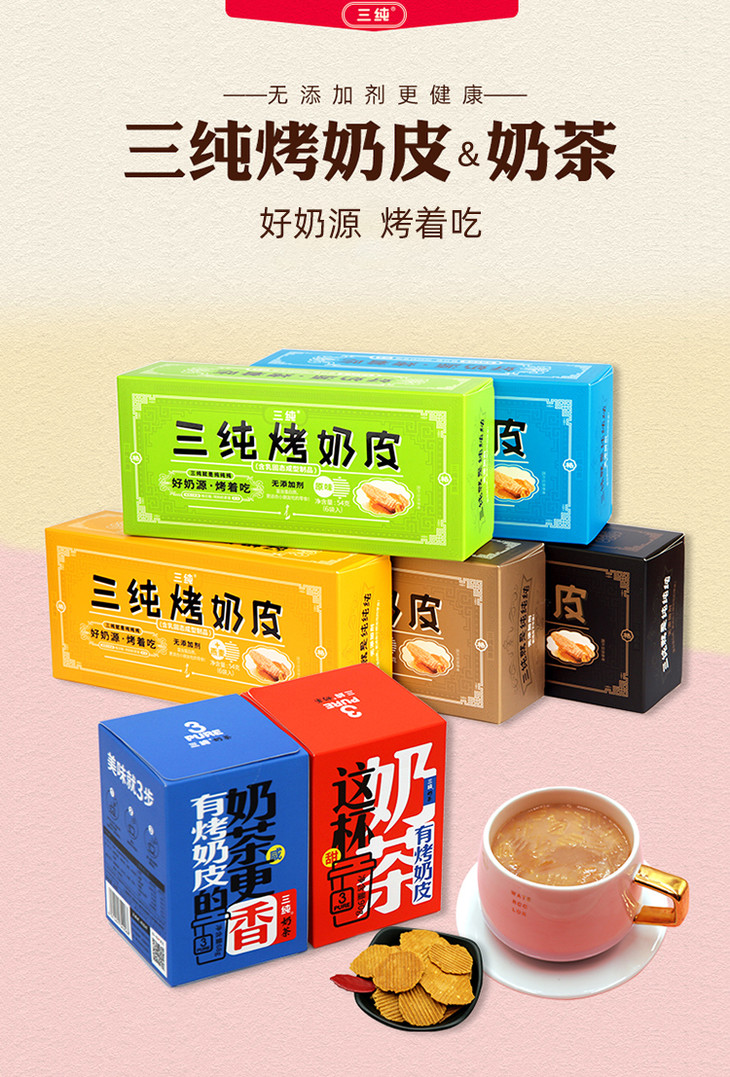 相比于很多现代精加工食品,奶皮真的很健康了!用料纯粹,不含添加剂,当办公室小零食也是真的很棒,想要地道一点就配上奶茶,加在酸奶牛奶里也可以!喜欢奶茶的就连奶茶一起入了,真的很好喝!一盒奶茶是2杯,一盒烤奶皮里有6小包,一次一包我真的觉得不够吃!