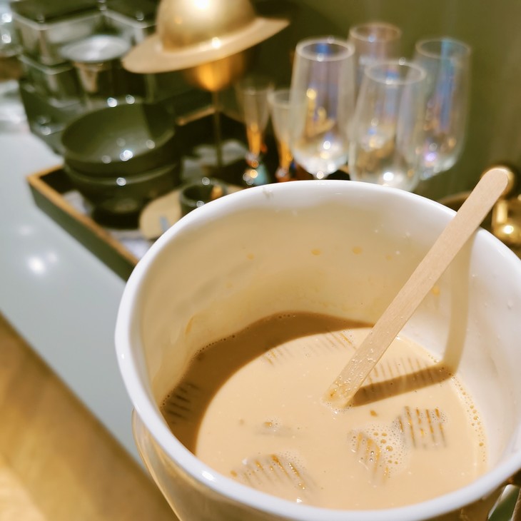 除了单吃,烤奶皮还可以泡奶茶,据说也是十分地道的吃法。我本身不是特别爱喝奶茶,为了配一下奶皮,我也上了三纯的奶茶。特别是内蒙地道的咸奶茶,咸香的奶茶加上酥脆的烤奶皮,喝上一口真的要起飞!优秀啊!