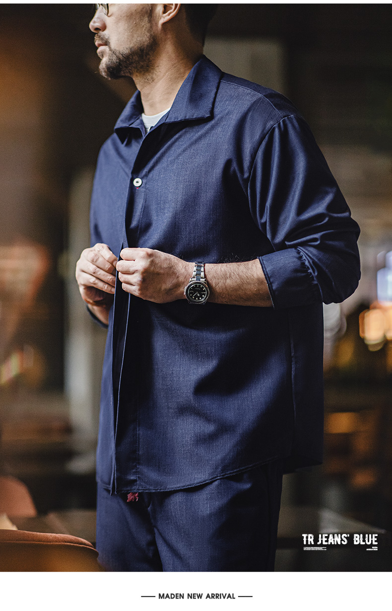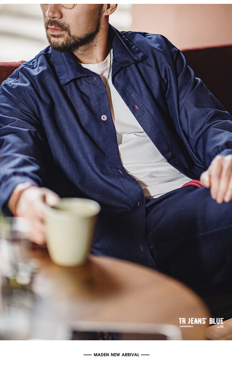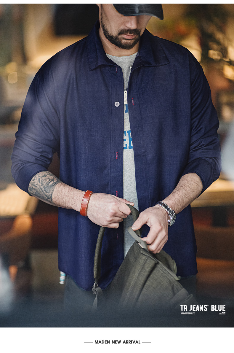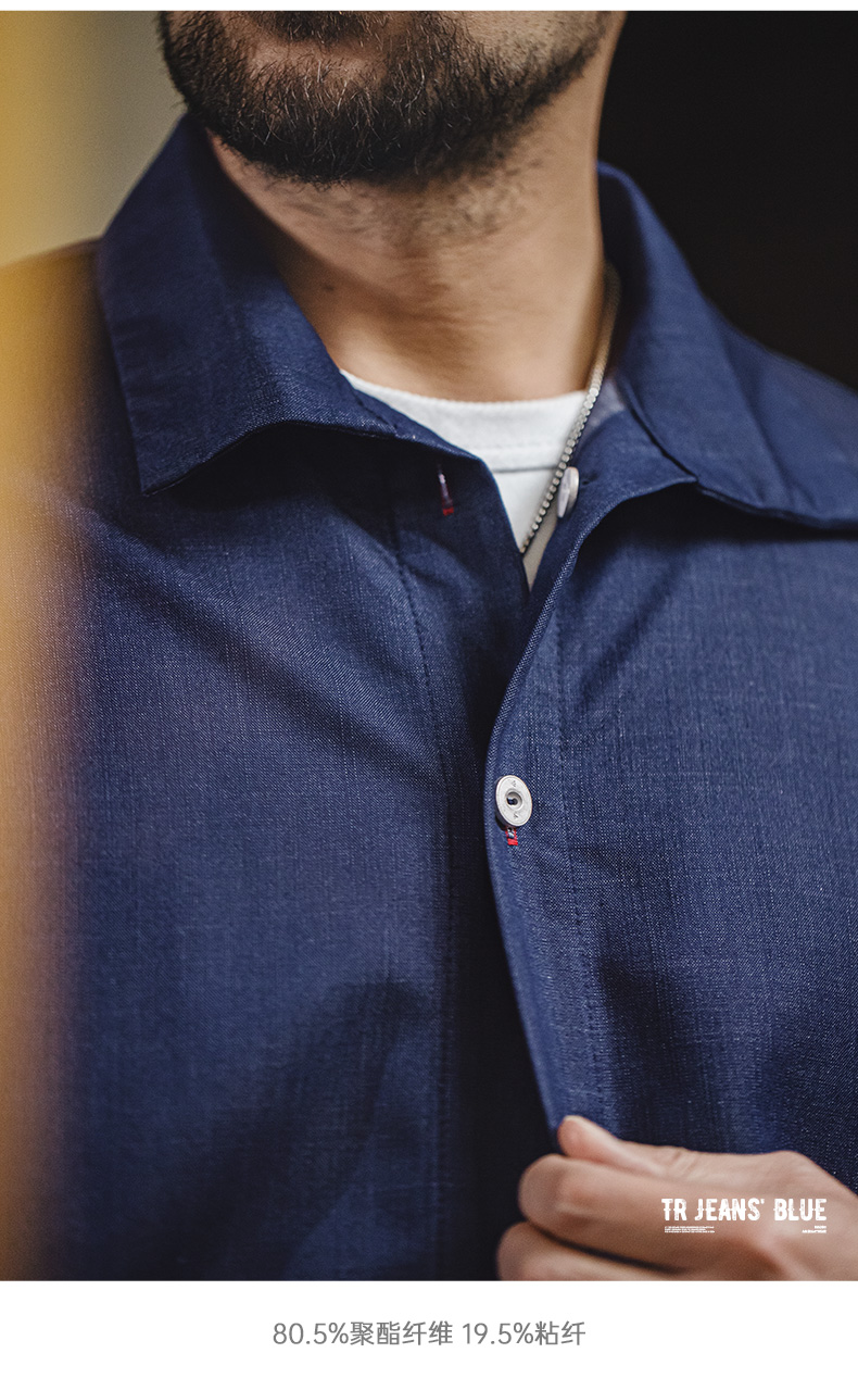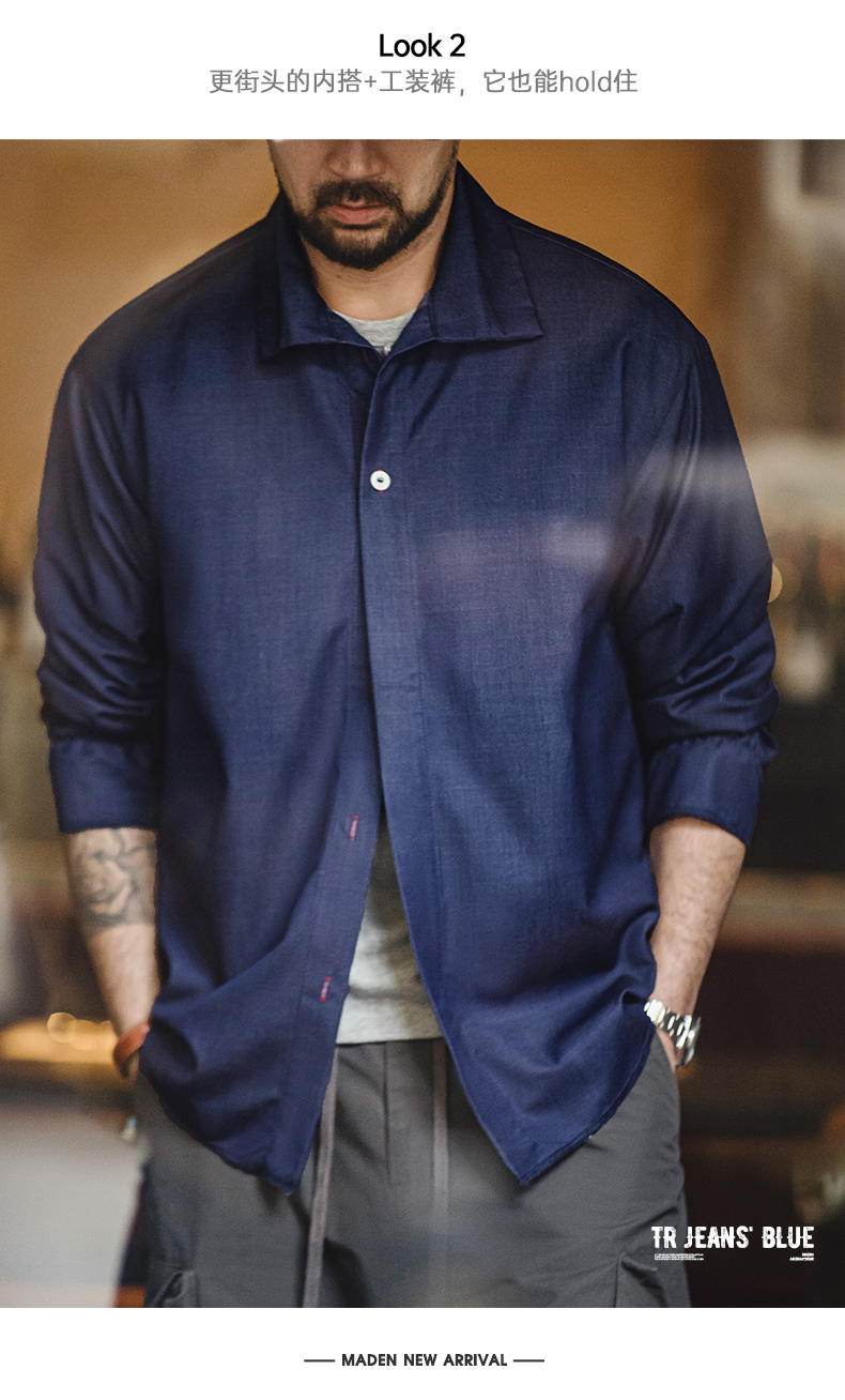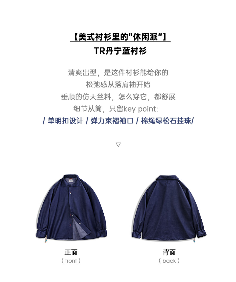 工装优选 美式复古仿天丝牛仔衬衫丹宁宽松翻领薄款长袖衬衣男春