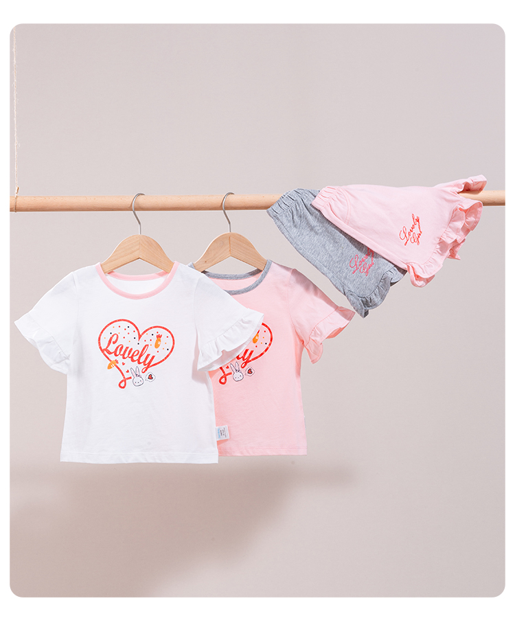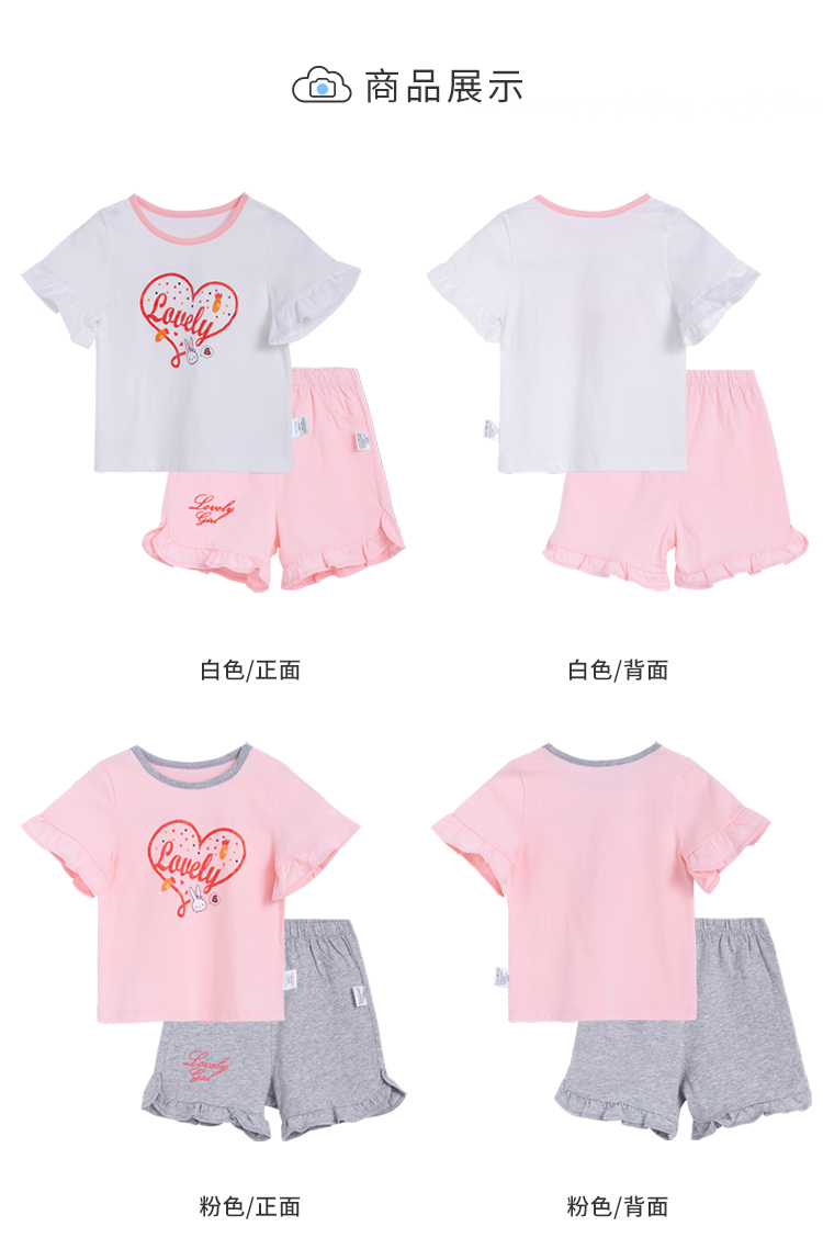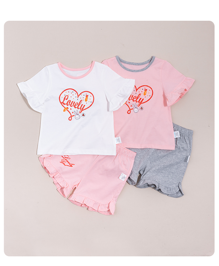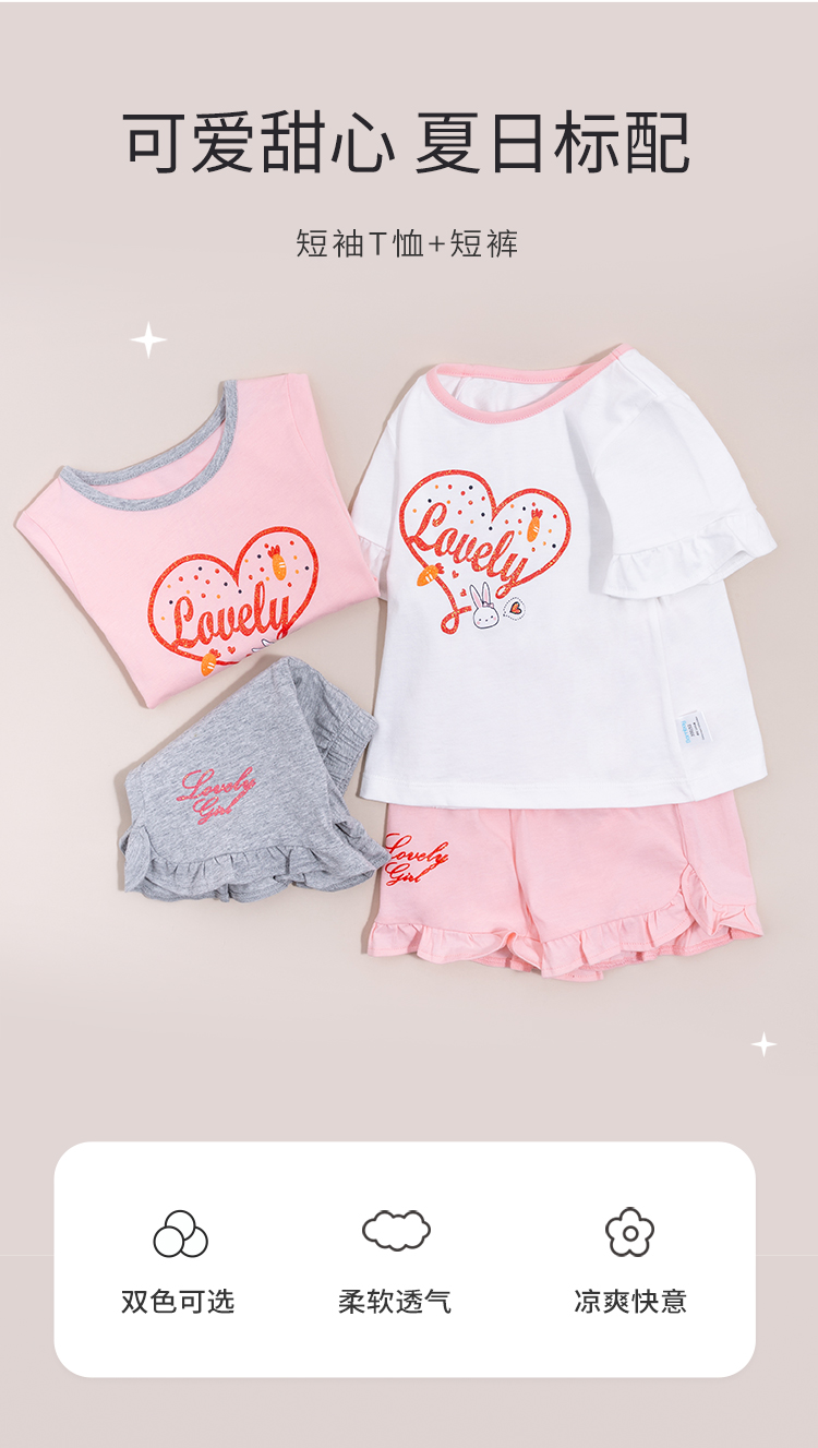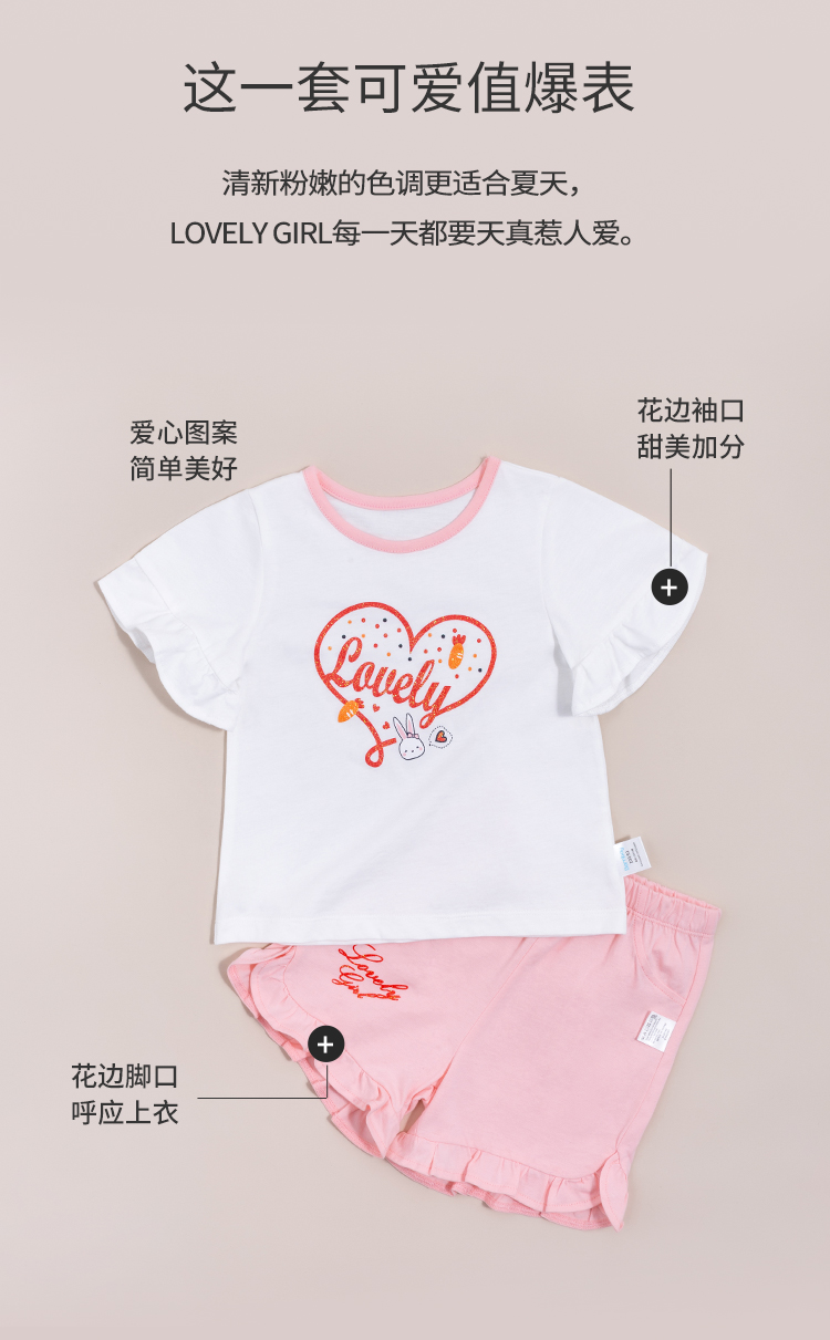 贝贝怡夏季新品女童短袖短裤套装爱心儿童分体两件套