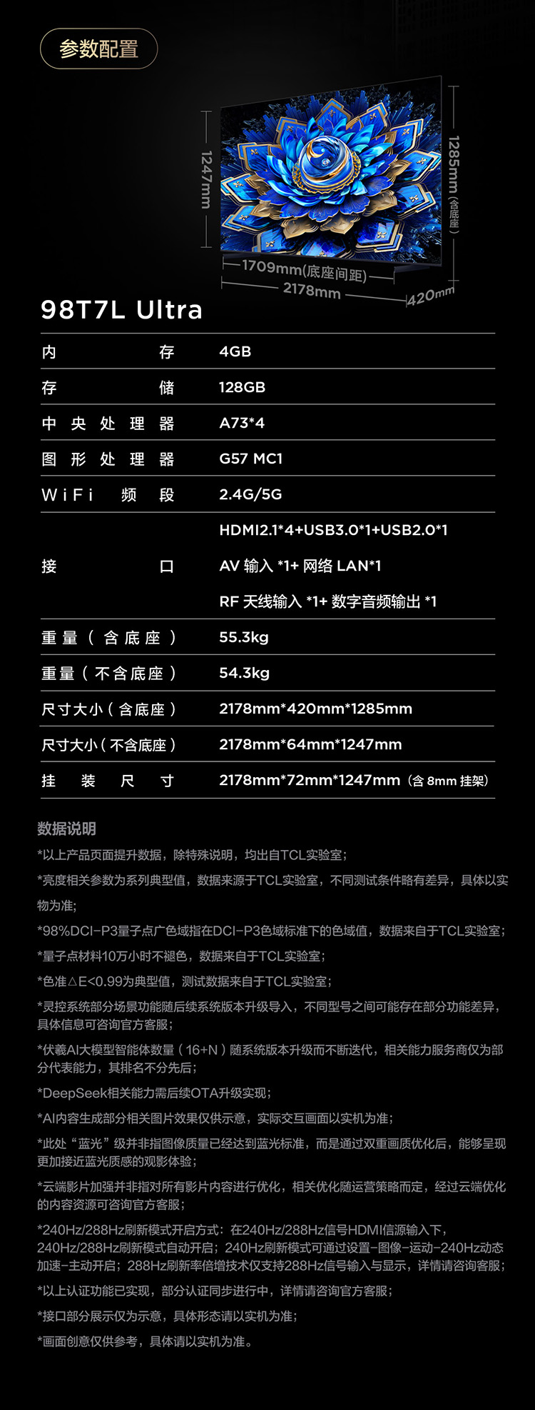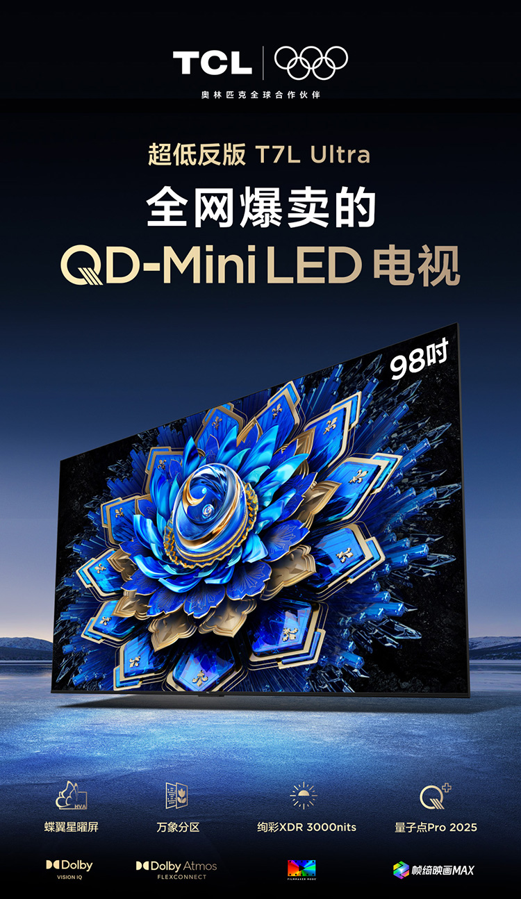 【新品上市】TCL电视 98T7L Ultra 98英寸 QD-Mini LED 蝶翼星曜屏 万象分区 绚彩XDR 3000nits 超薄电视