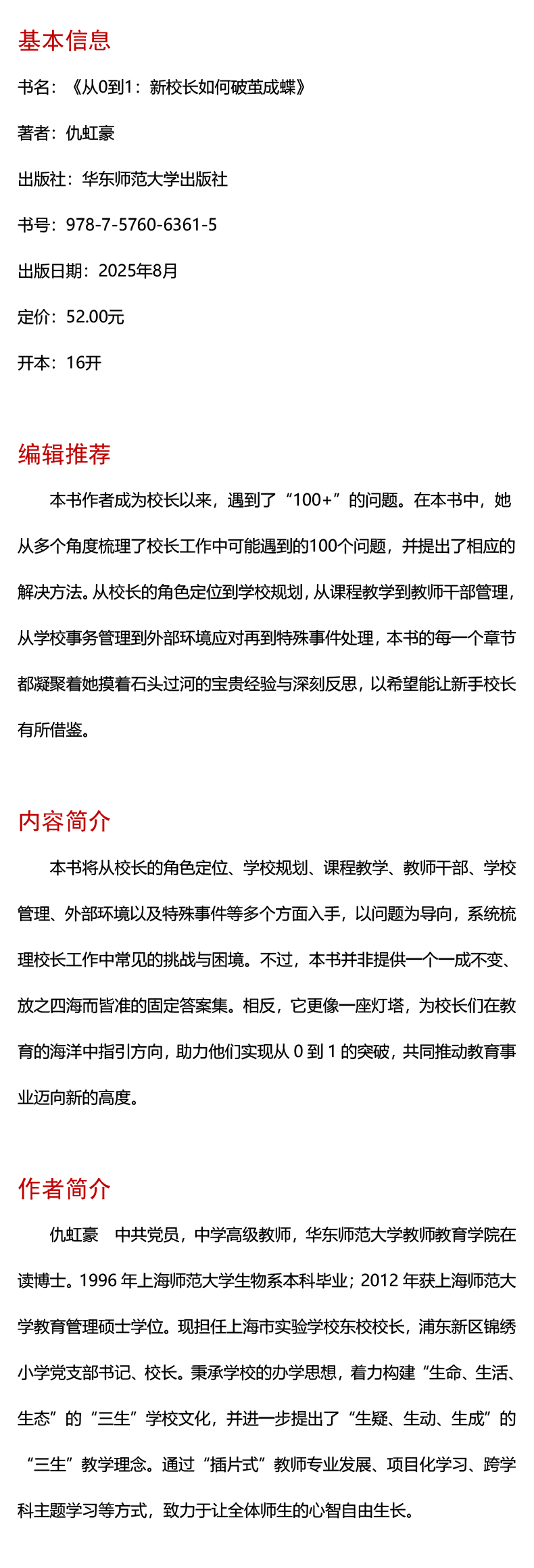 从0到1 新校长如何破茧成蝶 仇虹豪 新手校长100个问题答案之书 学校规划 教师干部管理