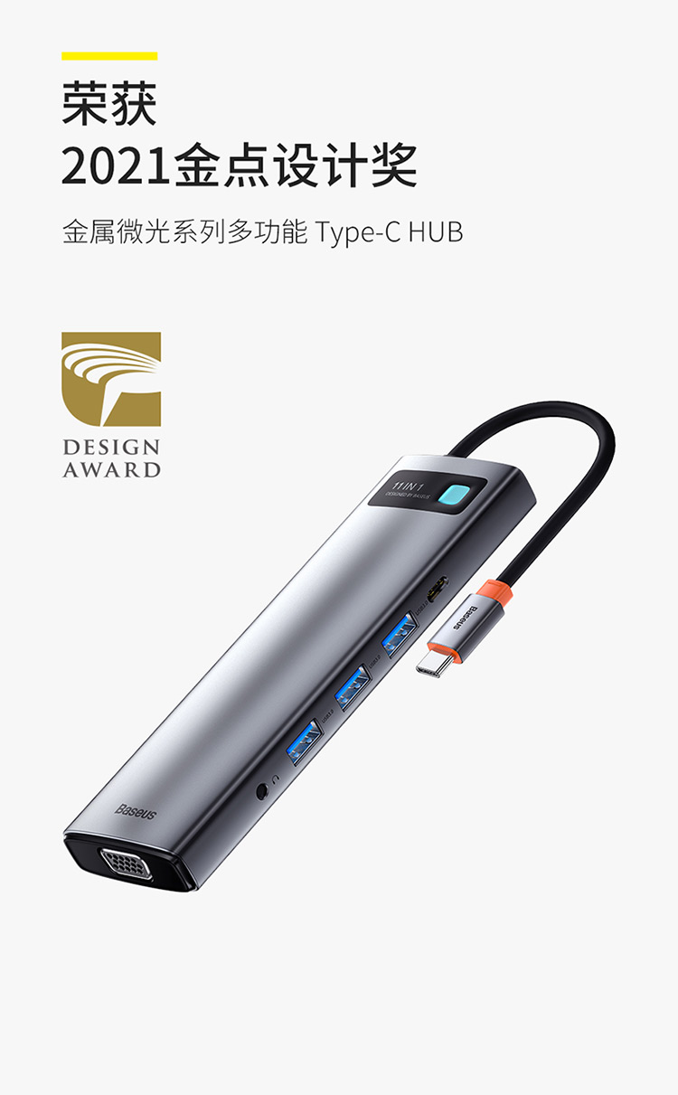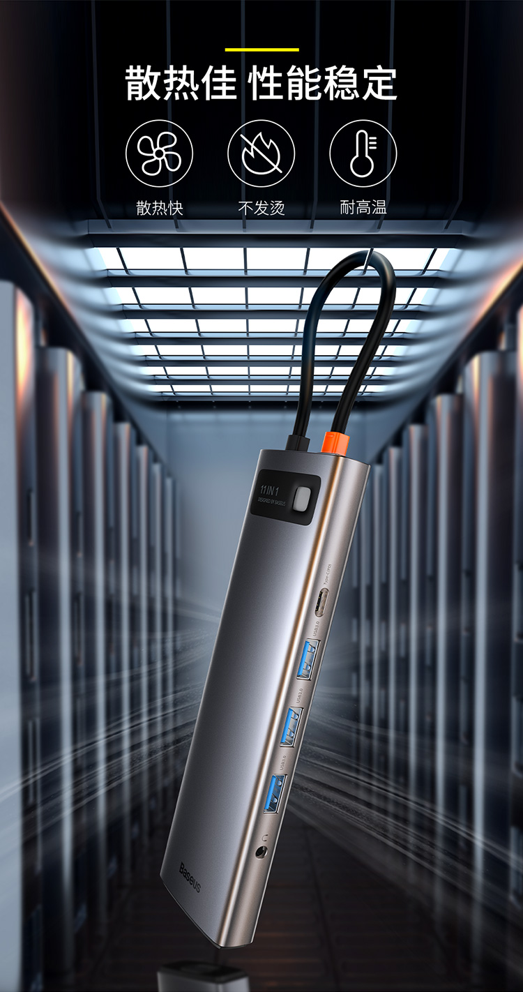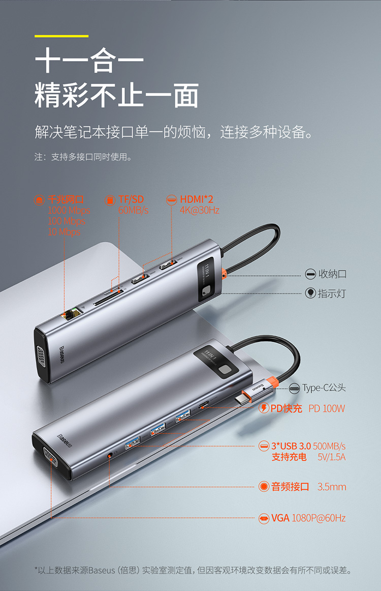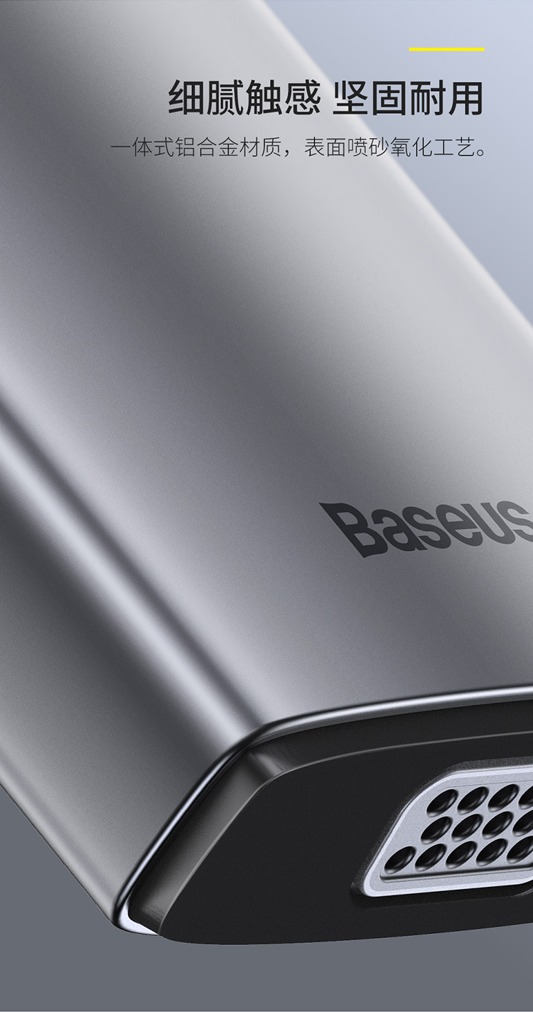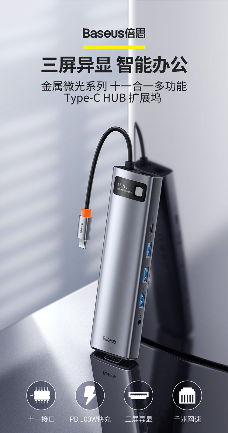 倍思 金属微光系列 十一合一多功能Type-C HUB 扩展坞(Type-C to HDMI*2+USB3.0*3+PD*1+RJ45*1+SD/TF*1+VGA*1+3.5mm*1)