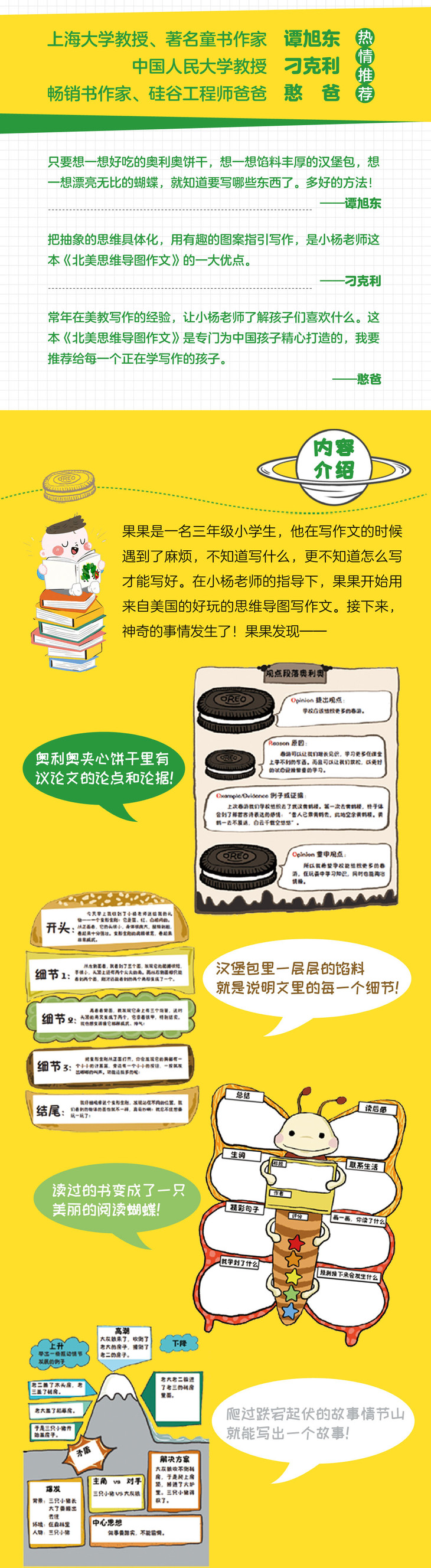 “在美教书的时候,我发现美国老师有一套系统,将每种不同文体的写作用一种思维简化成一张图,让孩子们把抽象的思维变得具象化,从有趣的图案提示中获得写作指引和灵感……在这本书里,我将原汁原味的美式思维方法运用到中国孩子的写作训练中,让很多孩子因此爱上写作。”