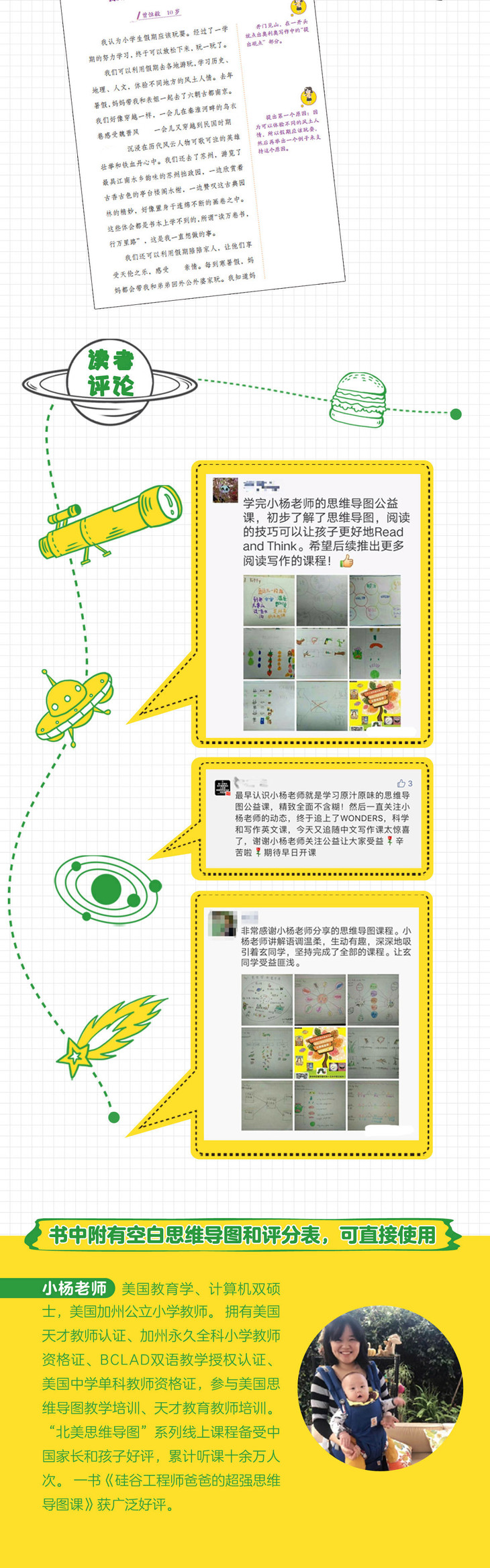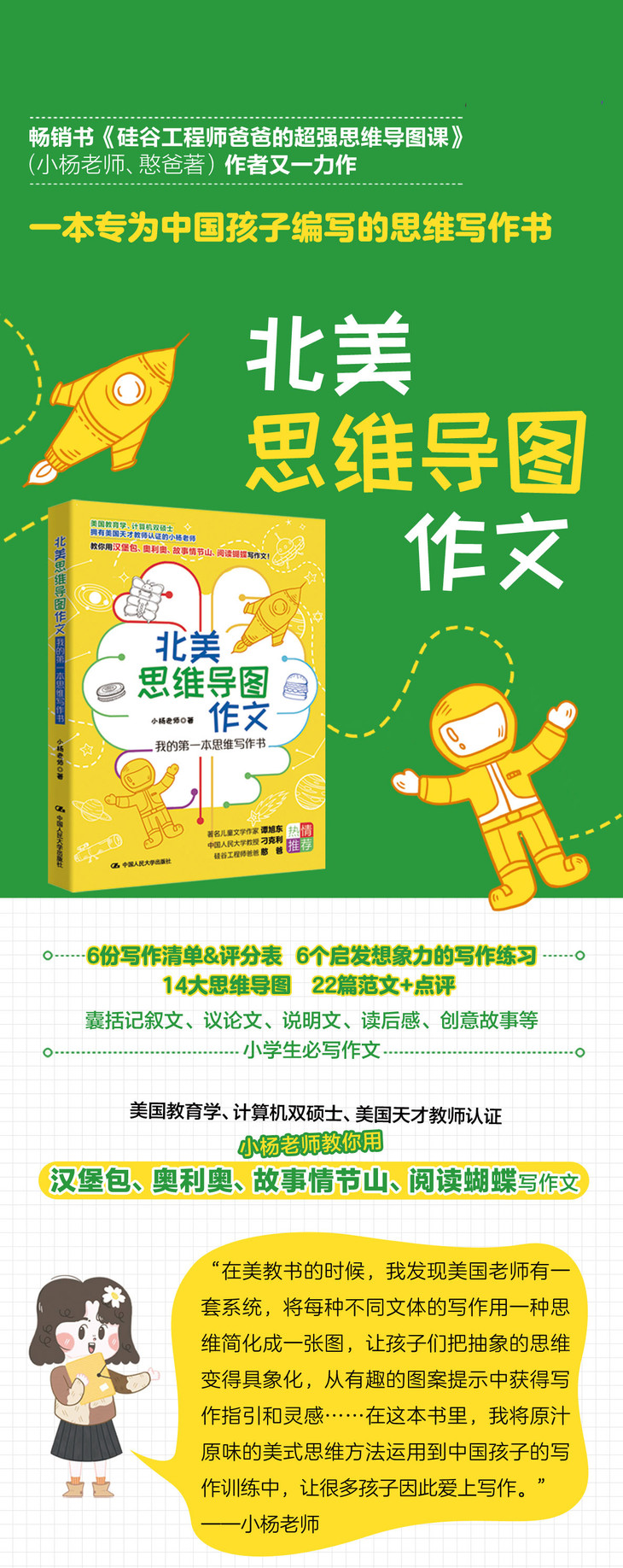 l 一本专为中国孩子编写的思维写作书,囊括14大思维导图、6份写作清单&评分表、22篇范文+点评、6个启发想象力的写作练习