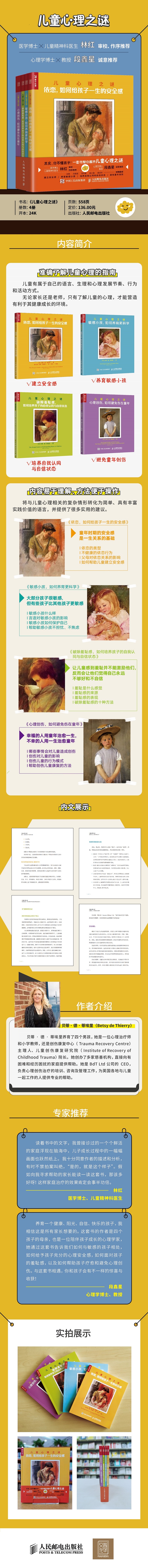 作为四个男孩的母亲、执业心理治-疗师和小学教师,蒂埃里通过《儿童心理之谜》一书将与儿童心理问题相关的复杂情形转化为具有丰富实践价值的心理治-疗语言,并且提供了很多实用的建议。书中讲述了与儿童心理有关的几个主题:早期与主要照顾者的关系决定了孩子是否有能力发展健康的情感和人际关系,因此帮助孩子找回内心缺失的爱很重要;让孩子感到羞耻并不能激发他们的动机,反而会让他们觉得自己不够好、没有创造力和自信心;孩子很敏感,但有些孩子比其他孩子更为敏感,当面对敏感的孩子时父母该如何做,尤其是男孩;幸福的人用童年治-愈一生,而不幸的人用一生治-愈童年,如何才能不让孩子遭受心理创伤并影响其一生。