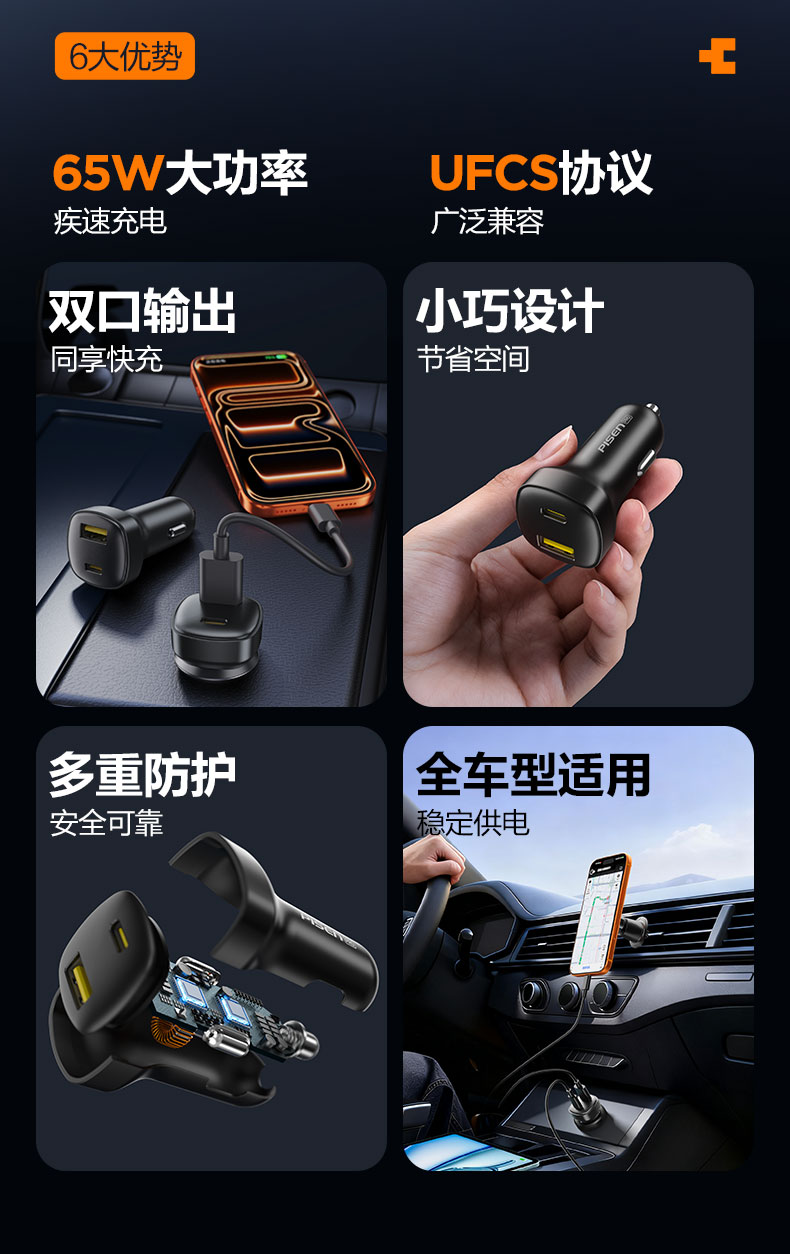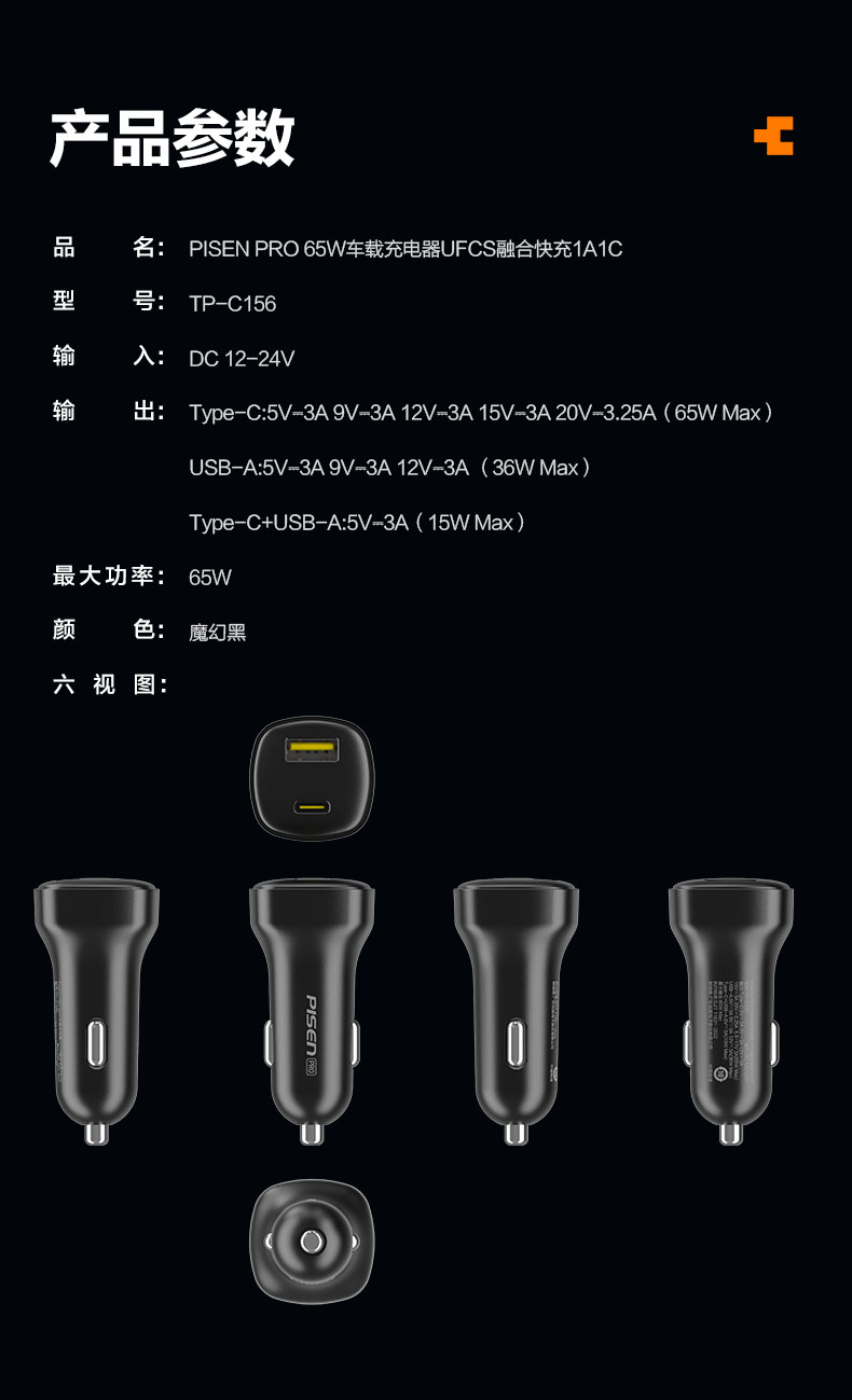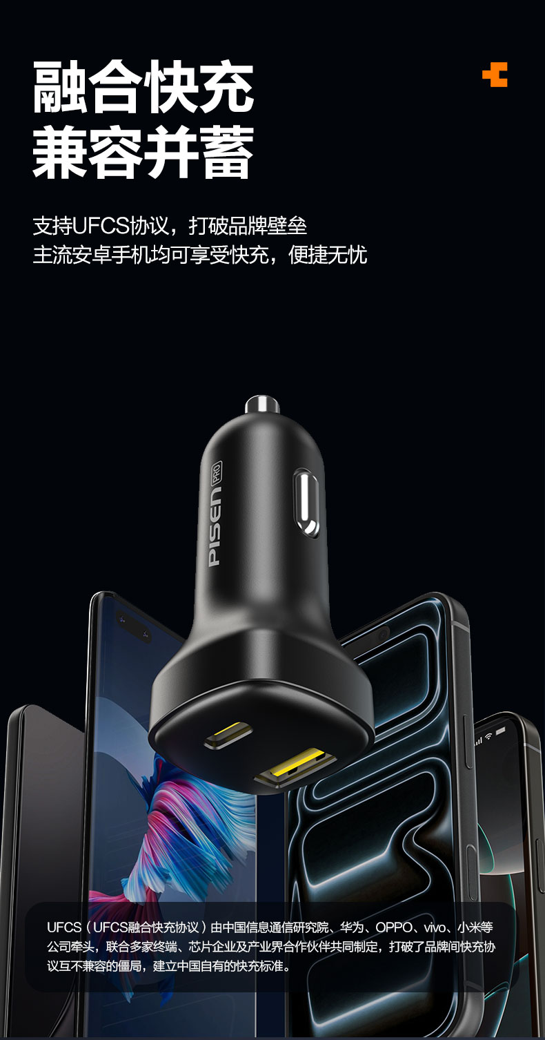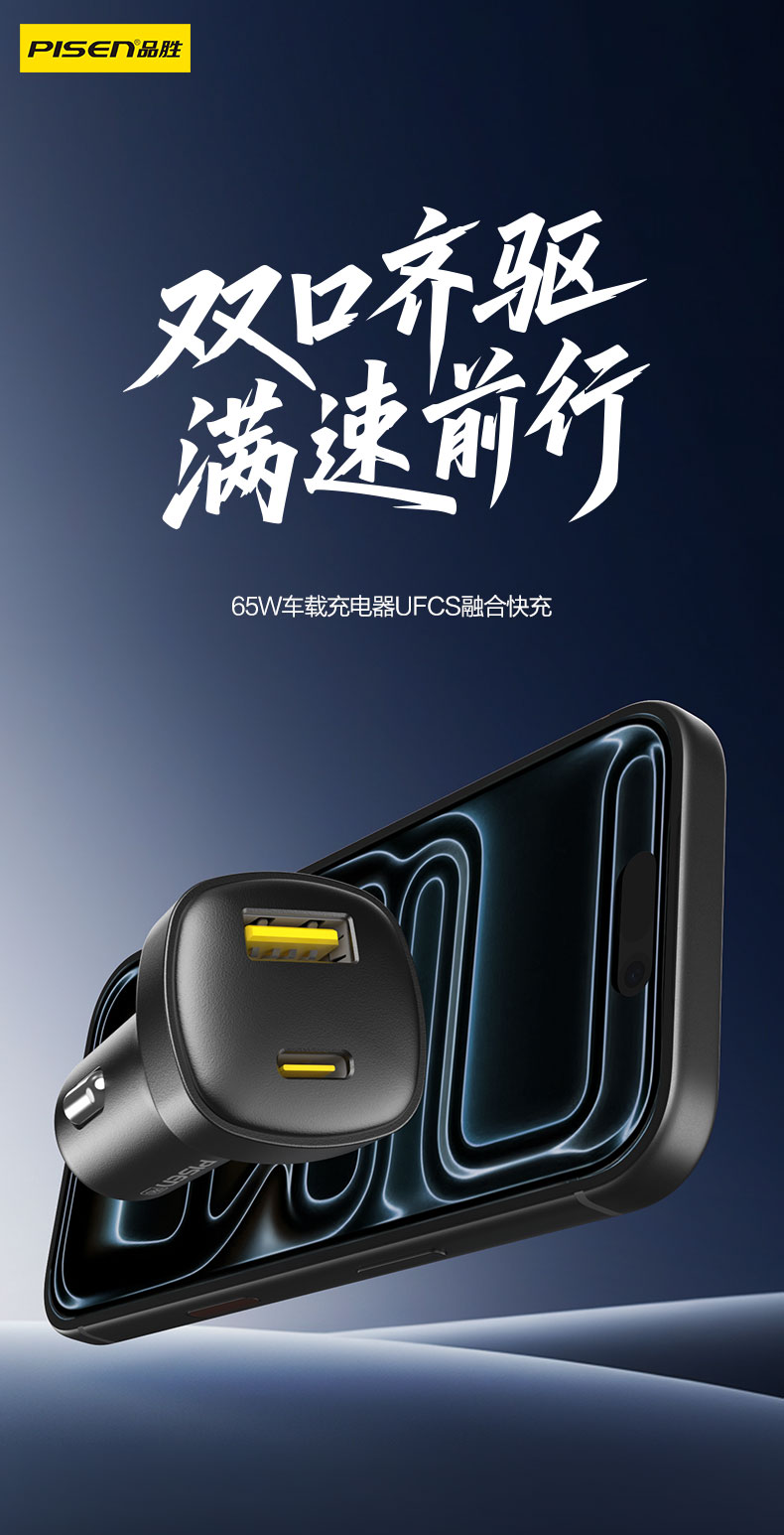 品胜 65W车载充电器UFCS融合快充1A1C 点烟器一拖二 支持快充/转换插头