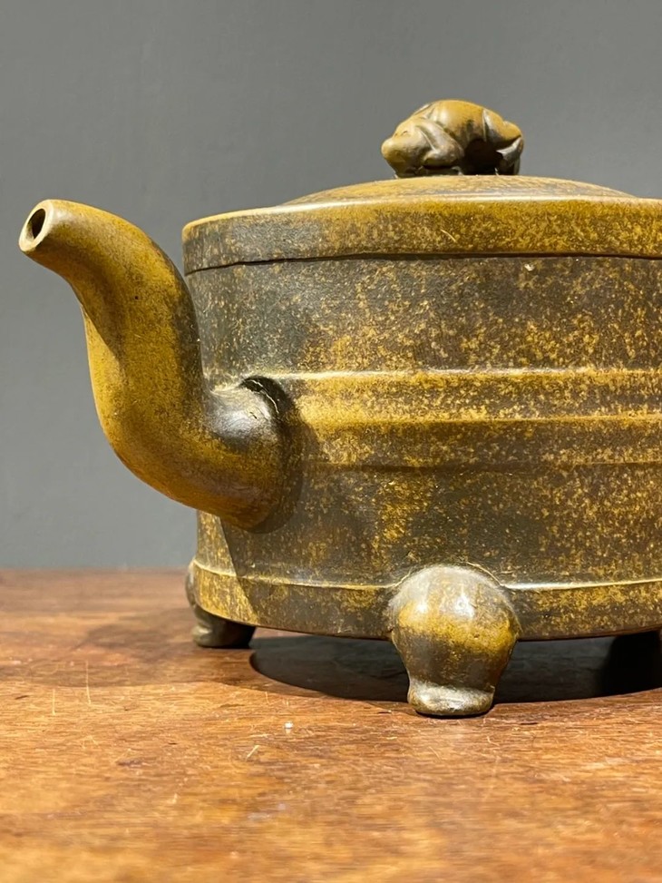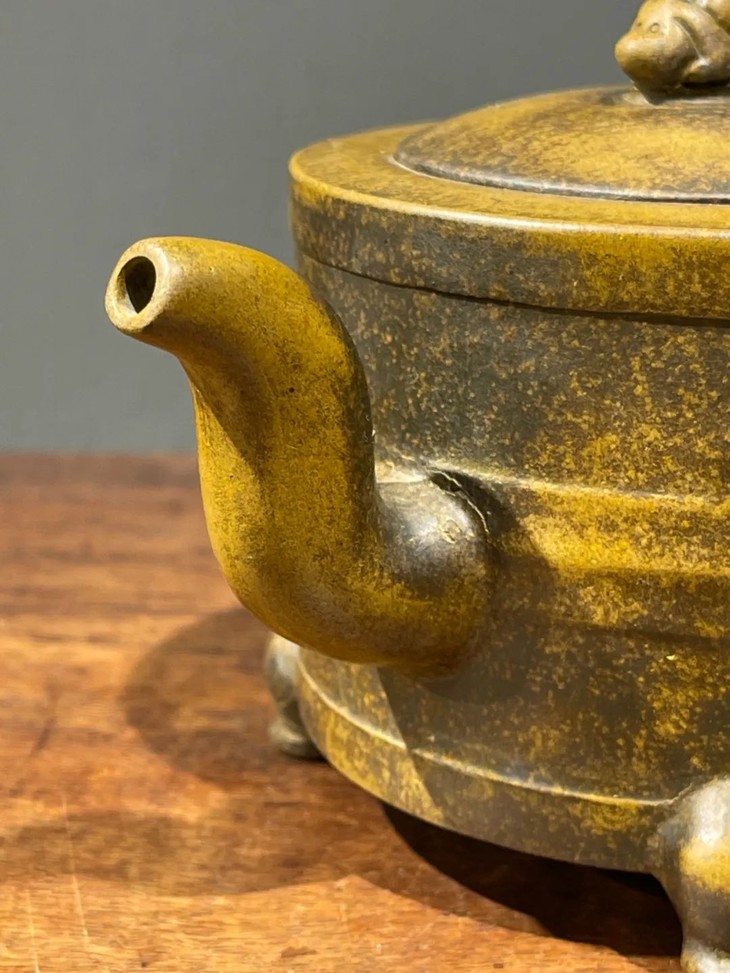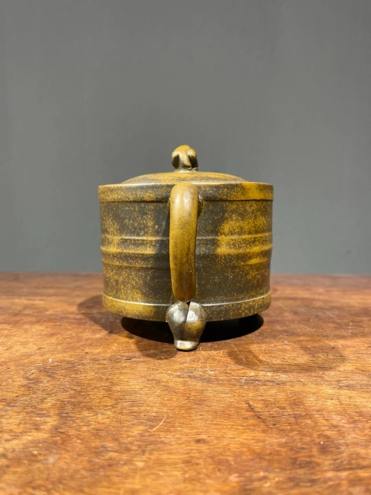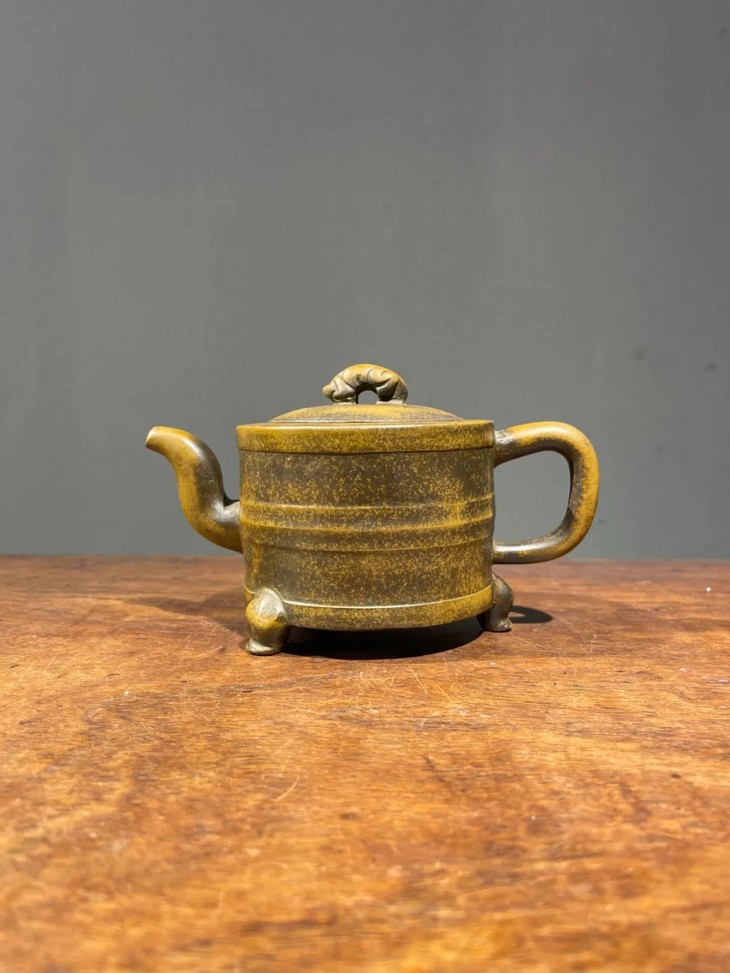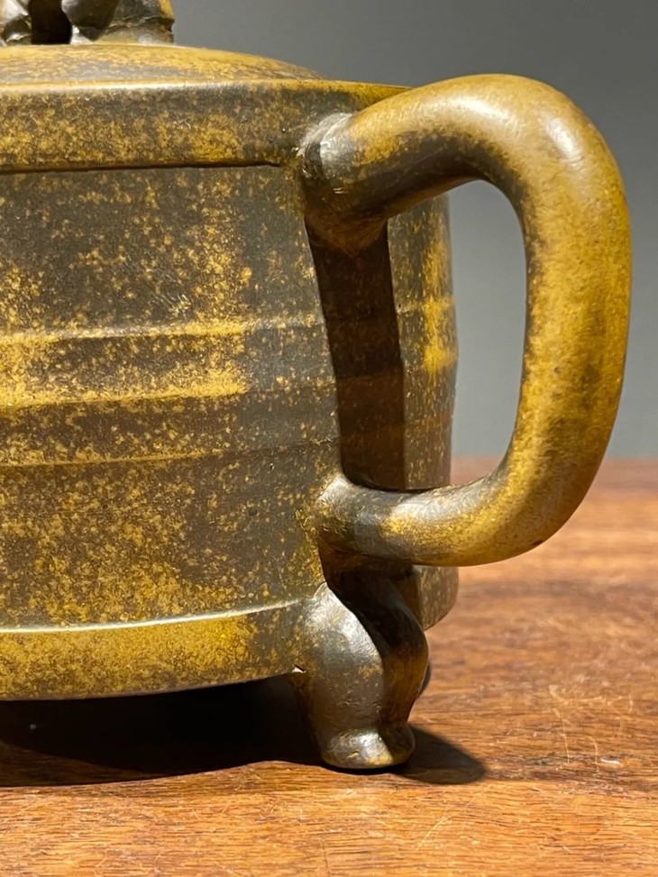这是一件造型与用料特殊的老紫砂壶,古青铜器奁型握把壶,黄紫砂胎,握把壶造型高雅大方,此紫砂茶壶设计独特且作工精湛外,壶底、壶盖内落名家吳国华款是另一特点。