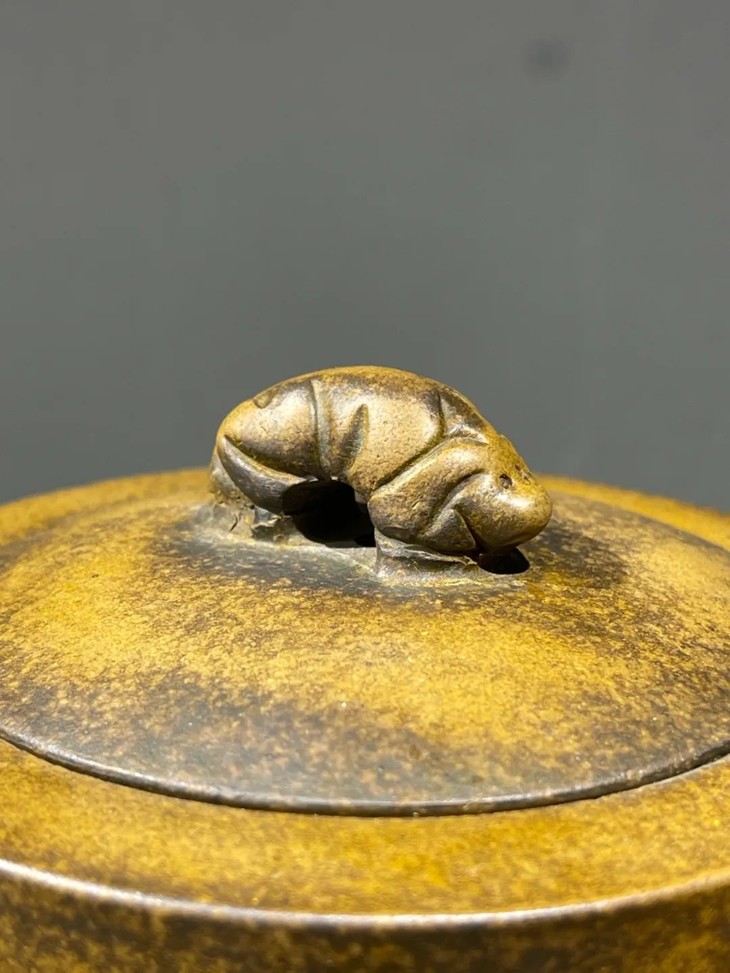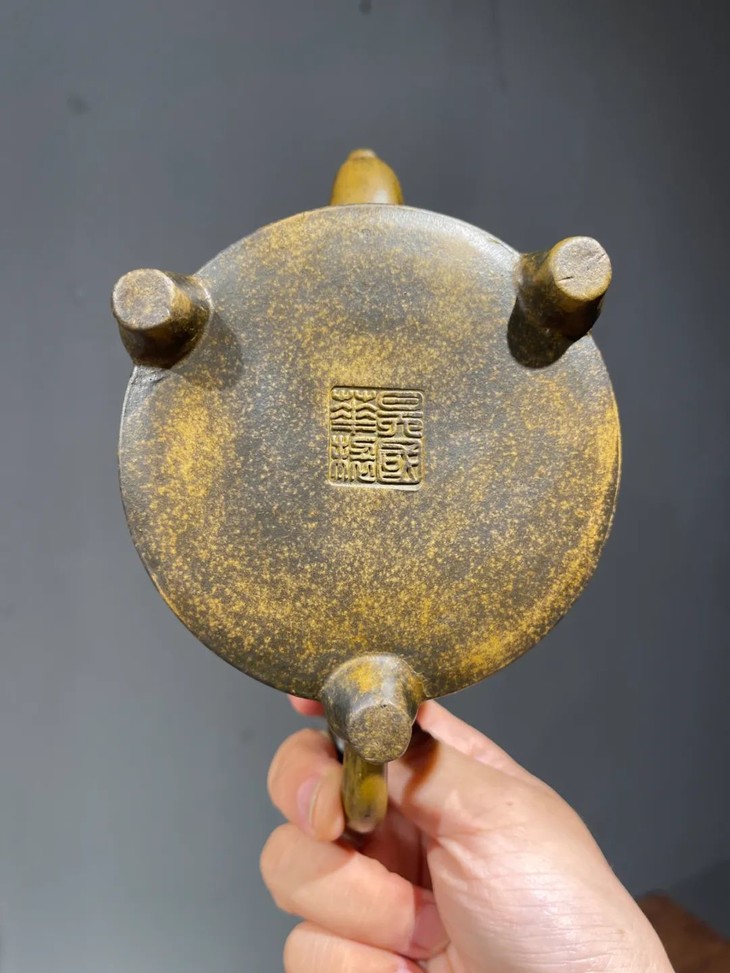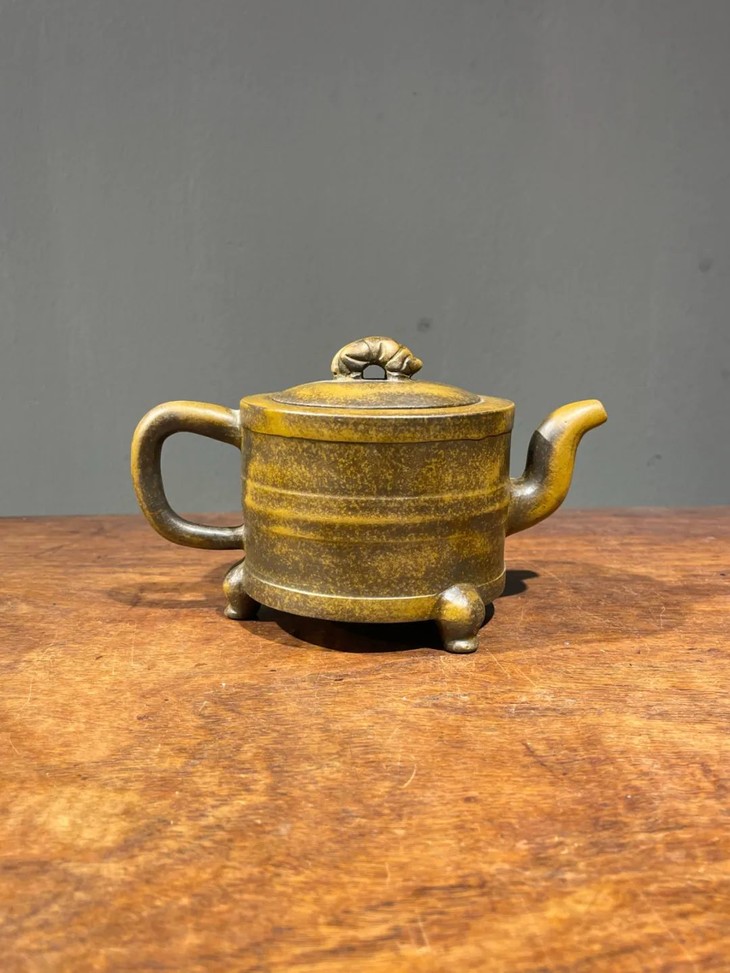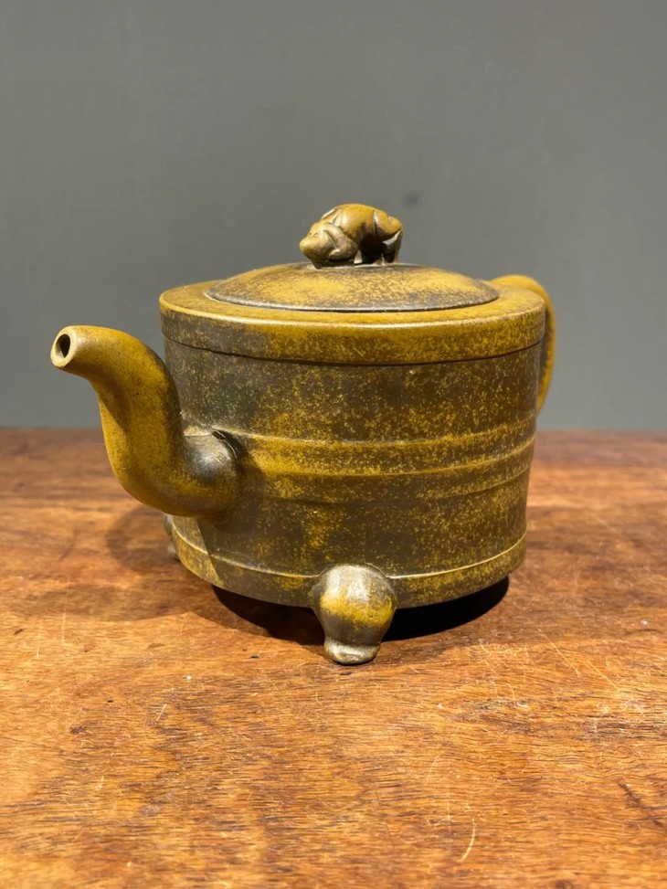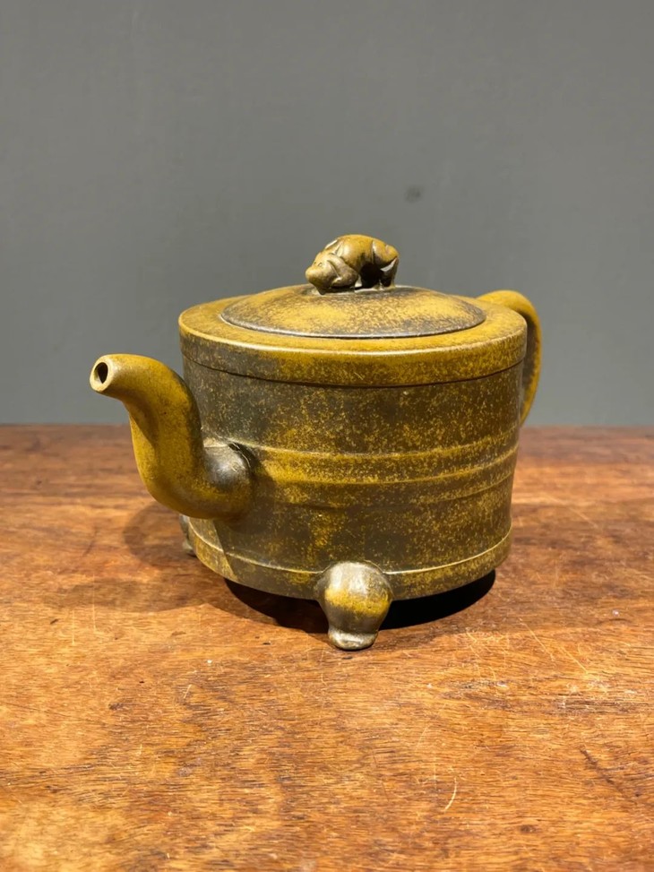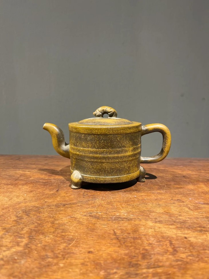这是一件造型与用料特殊的老紫砂壶,古青铜器奁型握把壶,黄紫砂胎,握把壶造型高雅大方,此紫砂茶壶设计独特且作工精湛外,壶底、壶盖内落名家吳国华款是另一特点。