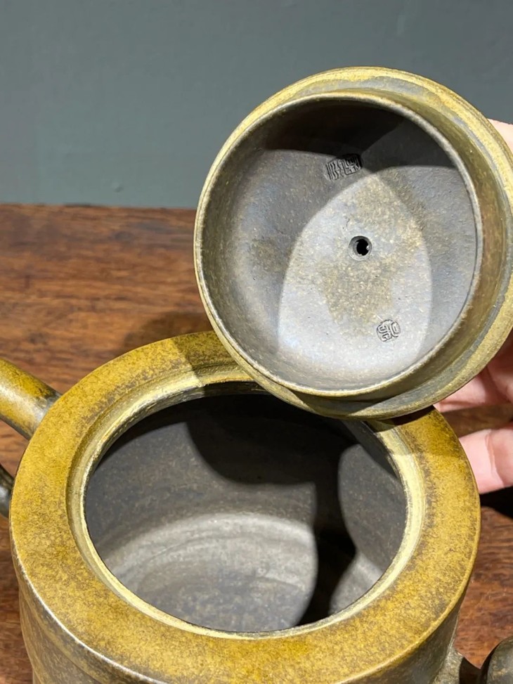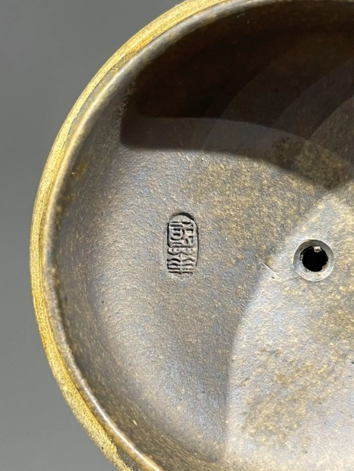此黄泥紫砂奁型握把壶设计新颖独特、风格隽永、做工精湛,用料讲究,落款为近代紫砂制壶名家吳國華,未曾经过专家鉴定,无法确认此壶是否为吳國華之作品。可以确定的是,这件造型特殊,作工精致的紫砂壶是一位日本华侨藏家已使用至少十五年的老茶壶,壶身隐约可见茶渍痕迹。此黄泥紫砂奁型握把壶除表面有茶渍与正常磨损痕迹外,保存完好无损。