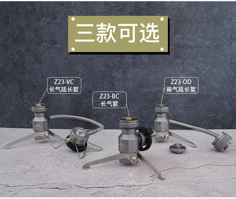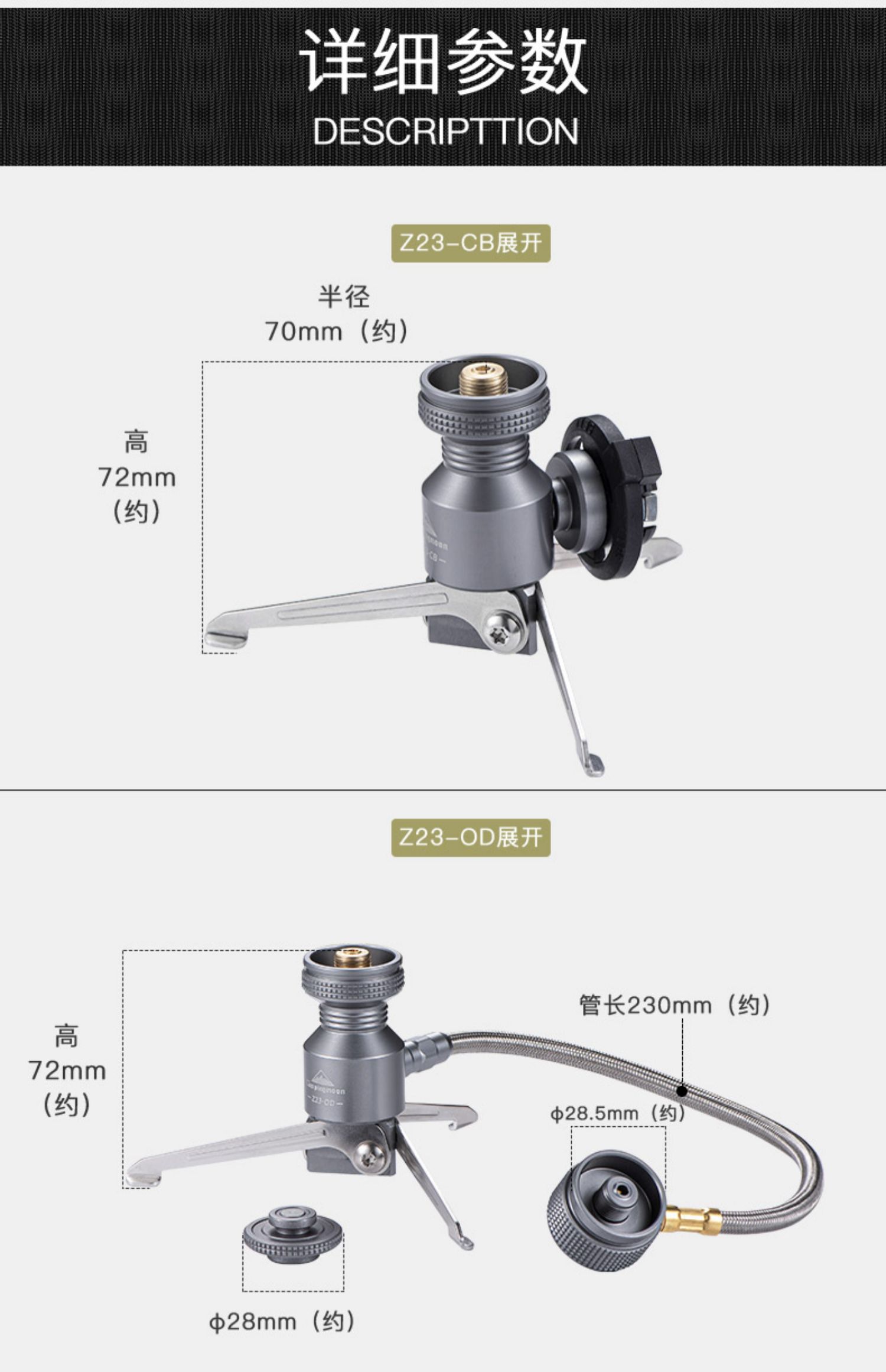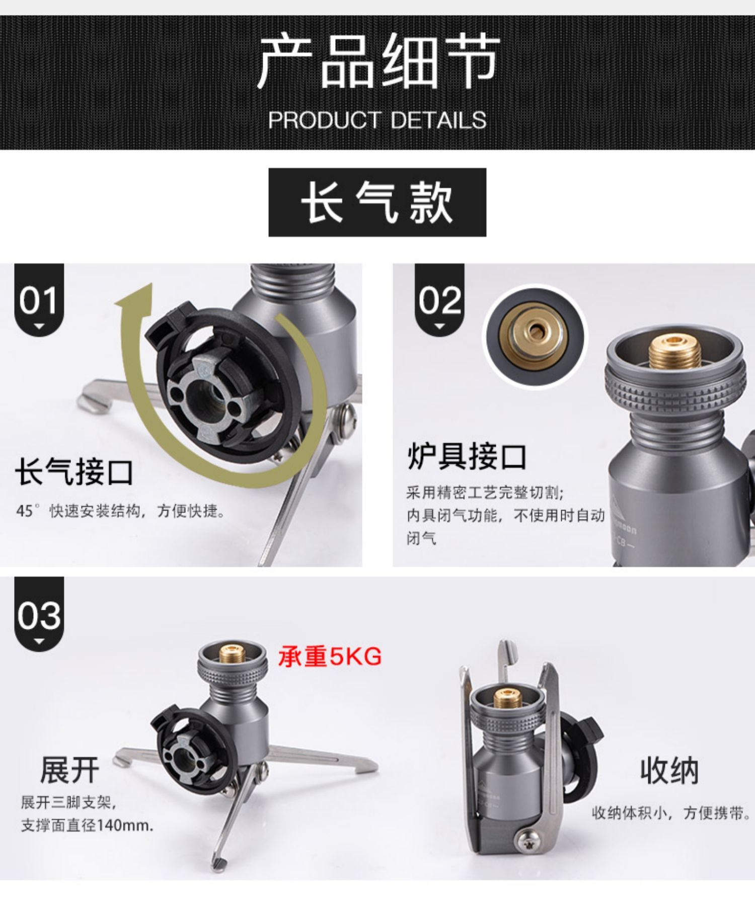 特点:使一体炉变分体炉,既能用扁气也能用长气;延长款配置延长管,可延长气罐与炉具的间距,使用更安全,也方便气罐倒置加大火力;