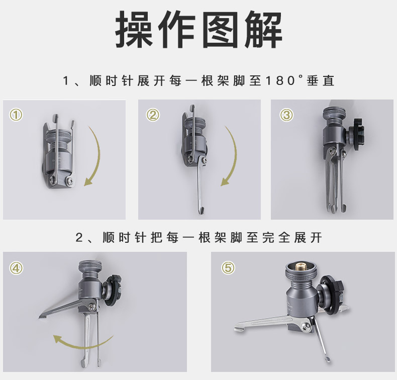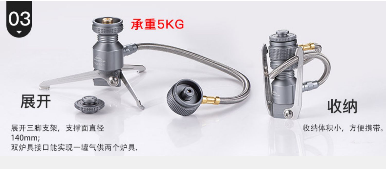 采用铝合金一体切割而成,制作精密;可折叠设计,方便收纳;自带闭气功能,先安装气罐或炉具均无影响