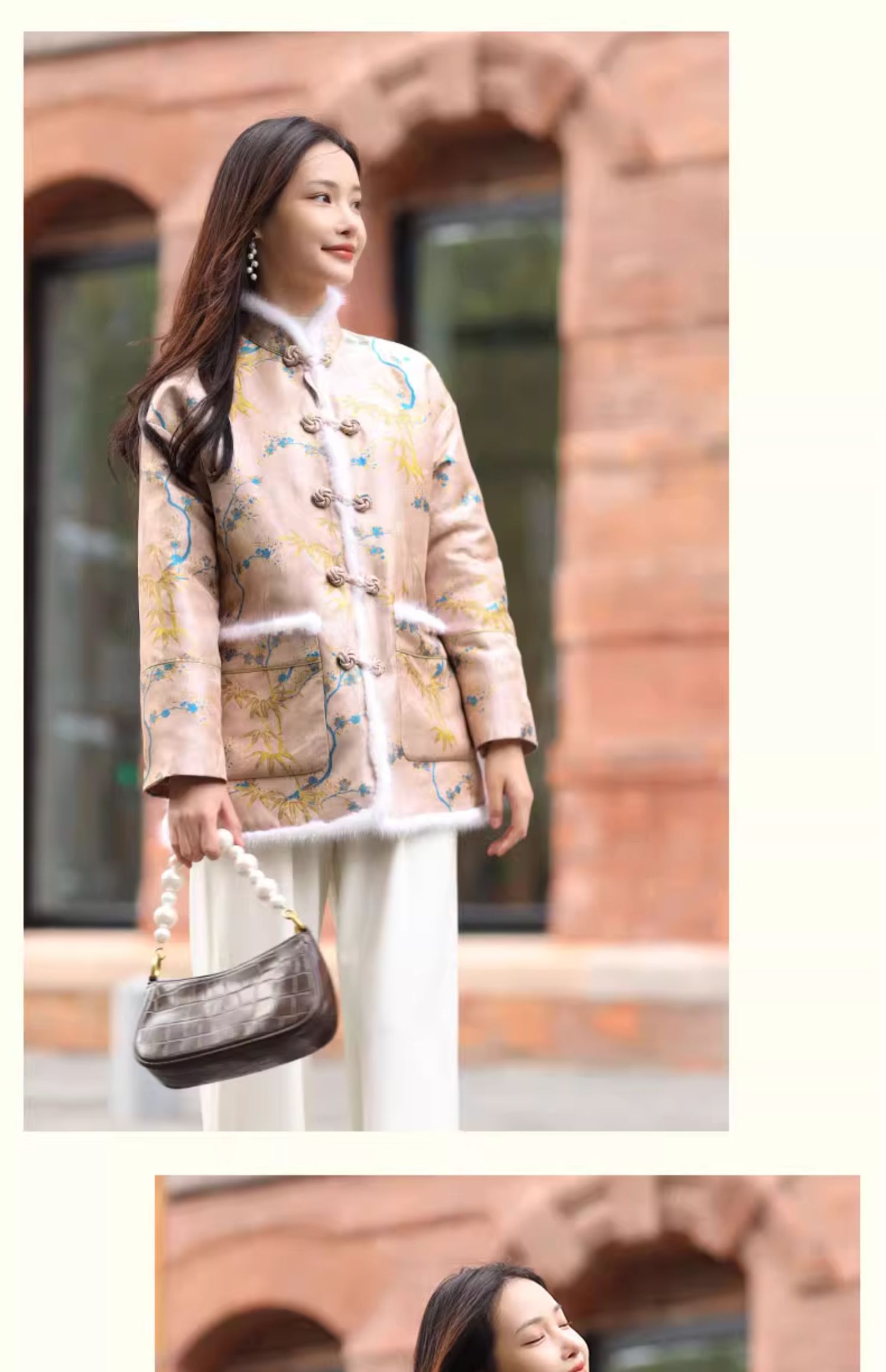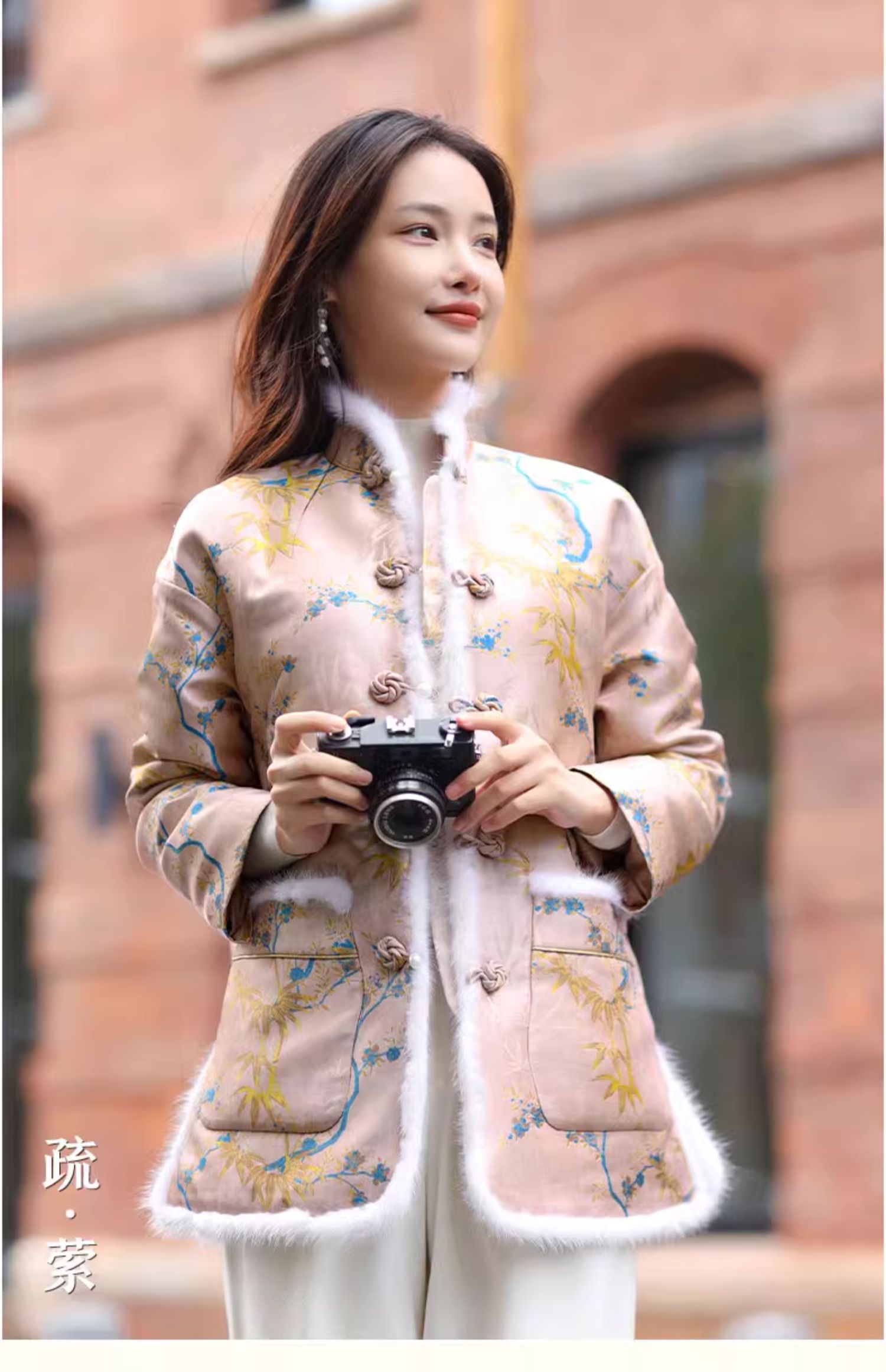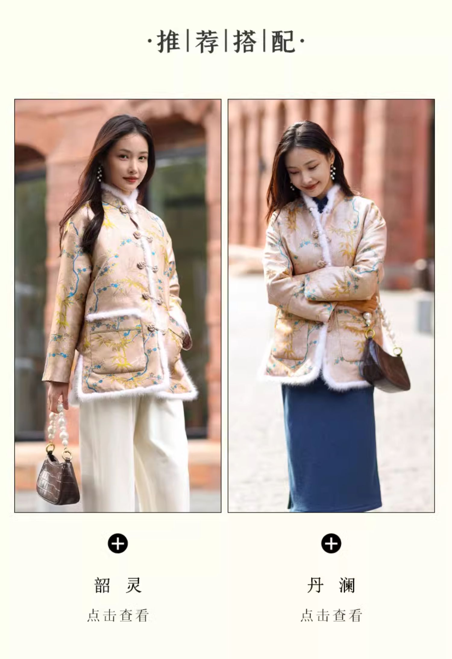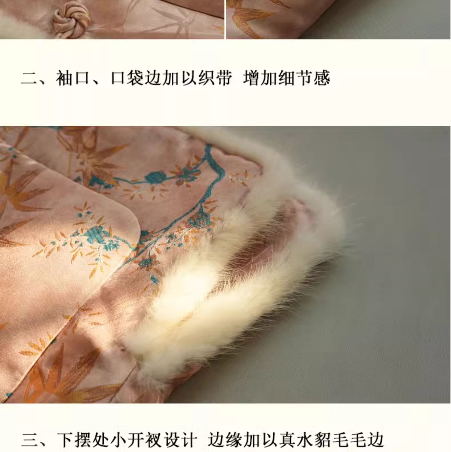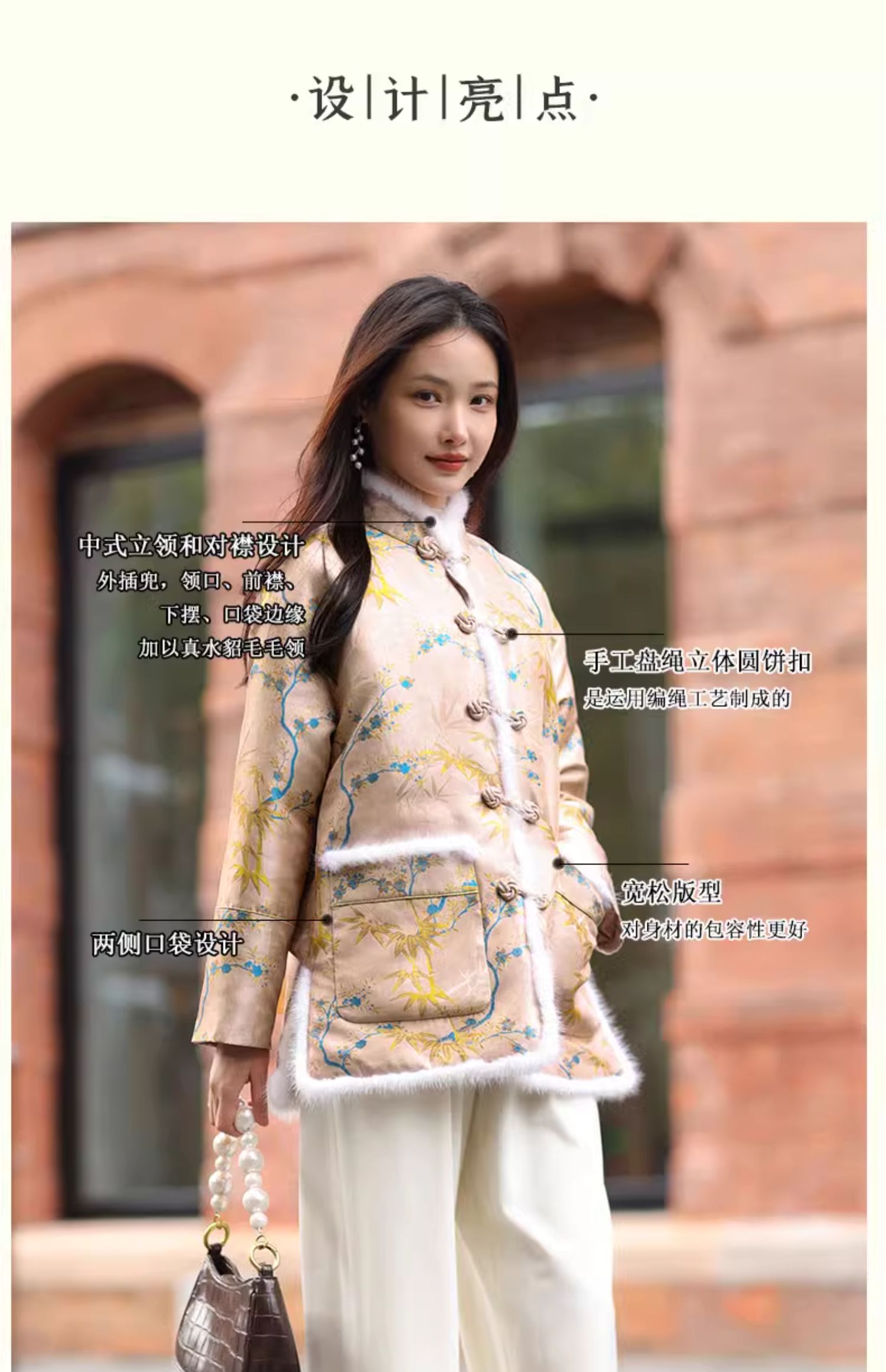 上海逸红颜疏萦2025年秋冬新款水貂毛边织锦棉衣棉服女新中式外套