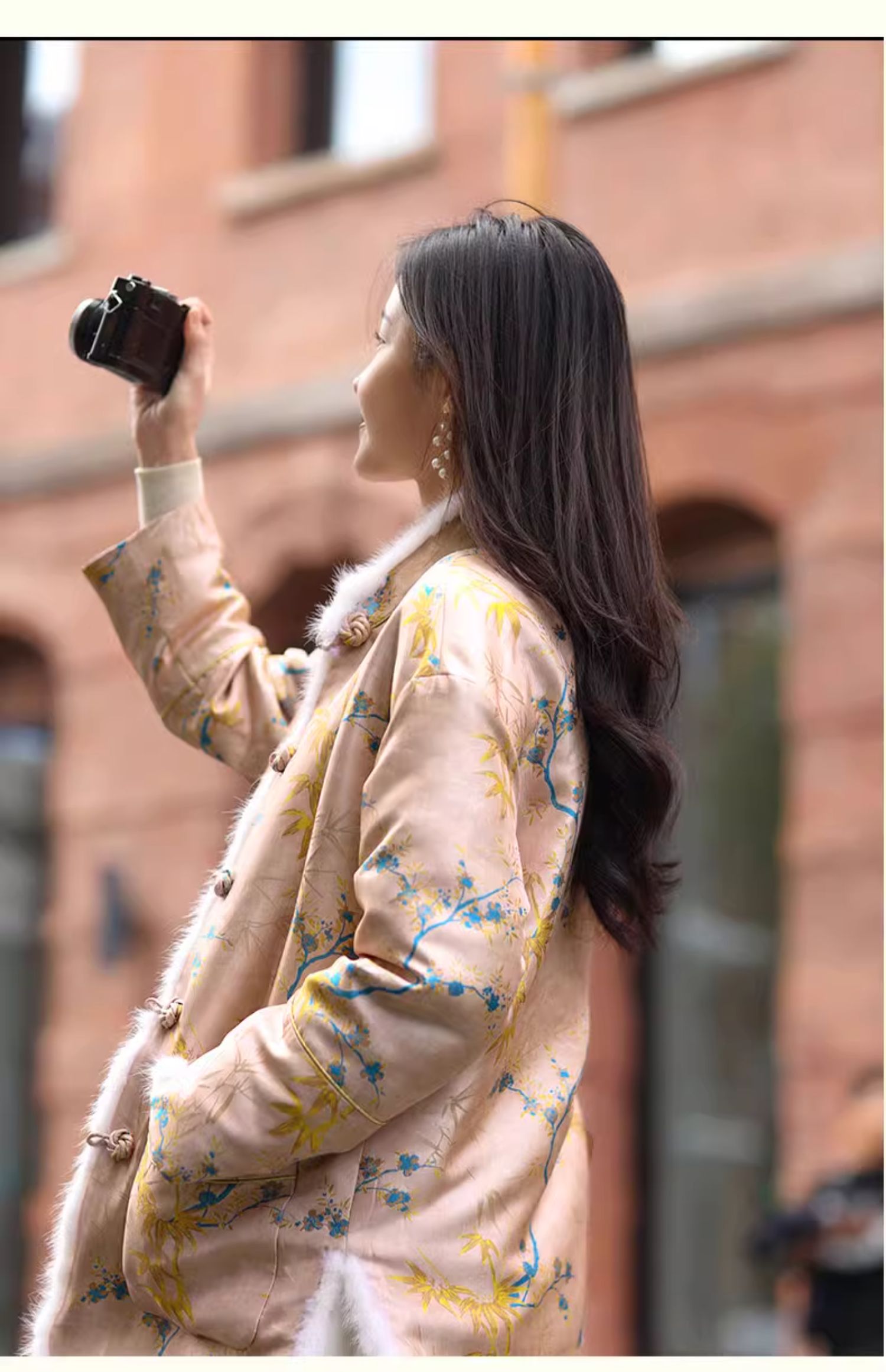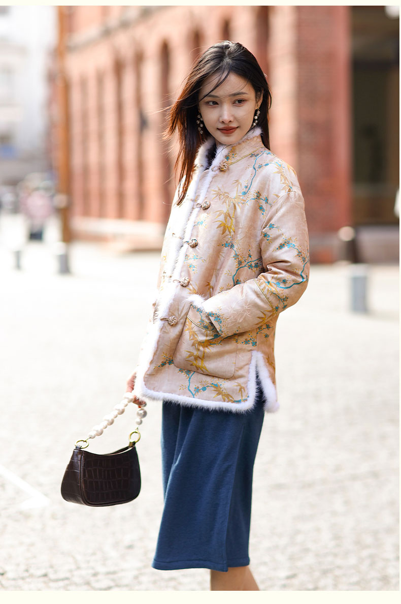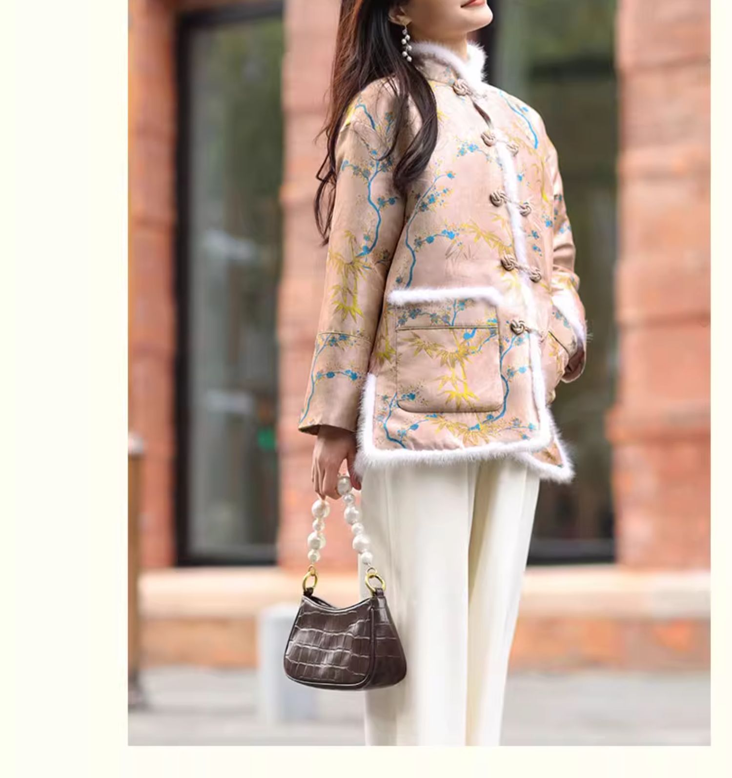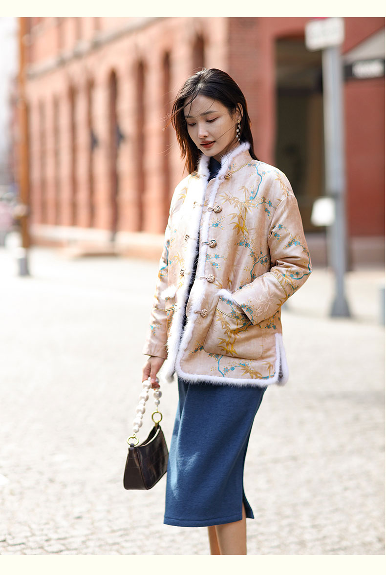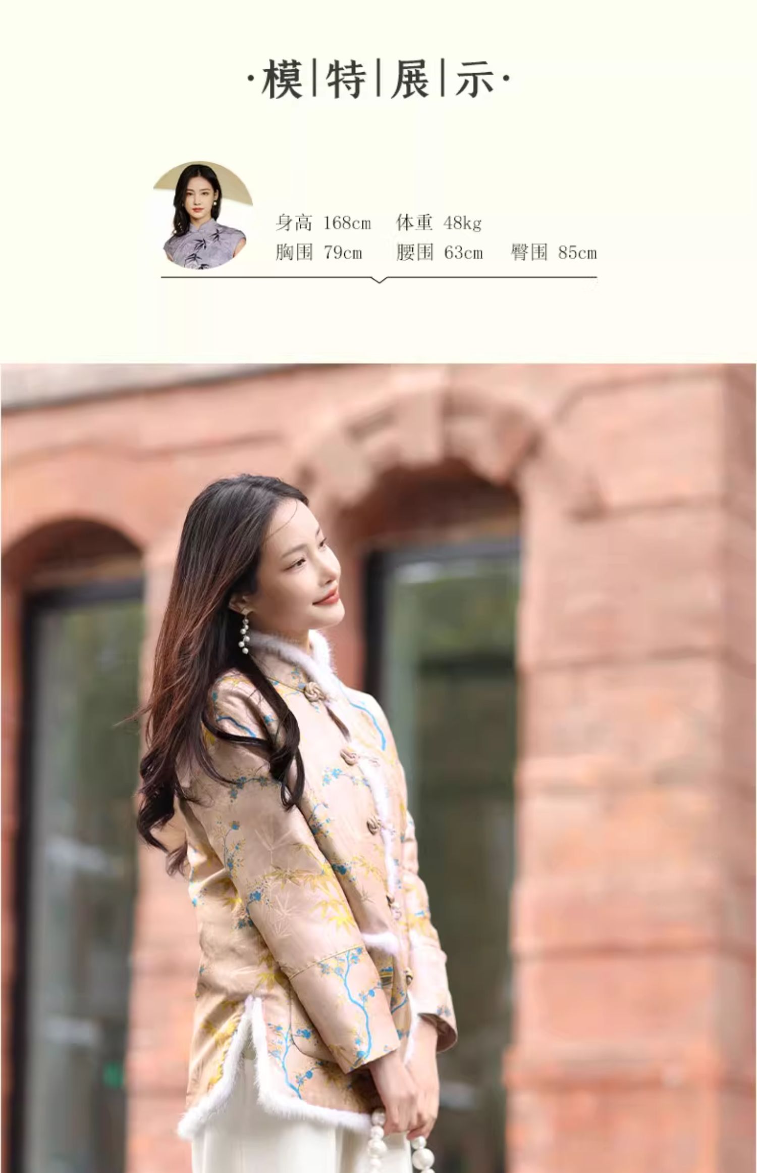 上海逸红颜疏萦2025年秋冬新款水貂毛边织锦棉衣棉服女新中式外套