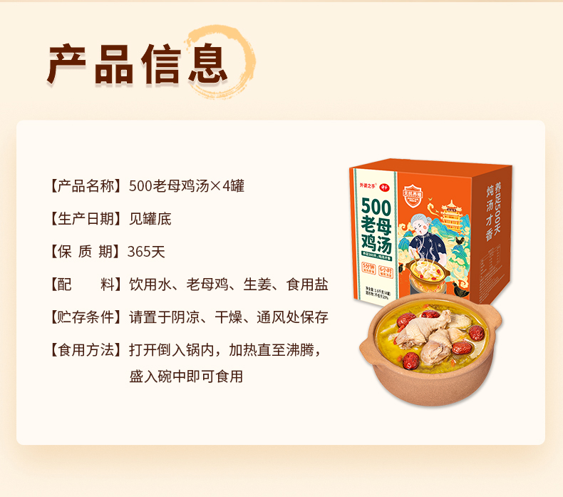 优选|神丹500天老母鸡汤 慢养500天  鲜香味美  400g/罐*4罐(礼盒装) 商品缩略图0 优选|神丹500天老母鸡汤 慢养500天  鲜香味美  400g/罐*4罐(礼盒装) 商品缩略图1 优选|神丹500天老母鸡汤 慢养500天  鲜香味美  400g/罐*4罐(礼盒装) 商品缩略图2 优选|神丹500天老母鸡汤 慢养500天  鲜香味美  400g/罐*4罐(礼盒装) 商品缩略图3 优选|神丹500天老母鸡汤 慢养500天  鲜香味美  400g/罐*4罐(礼盒装) 商品缩略图4