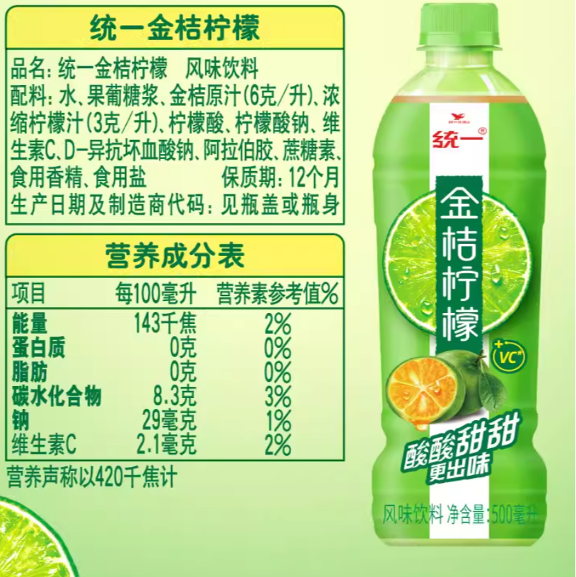 统一 金桔柠檬 风味饮料500ml/瓶