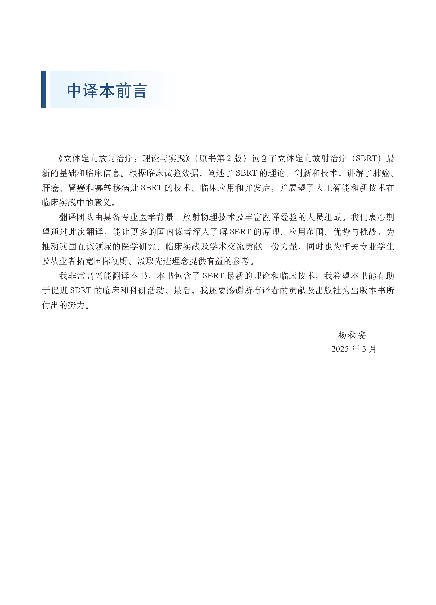 内容涵盖了目前体部立体定向放射治疗的热点领域,代表了当前体部立体定向放射肿瘤学的发展现状和实践水平,具有较高的参考价值和实用价值。