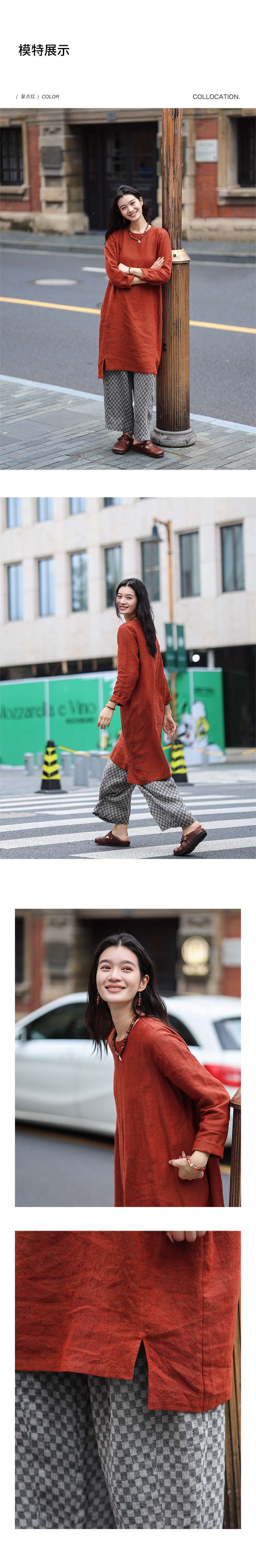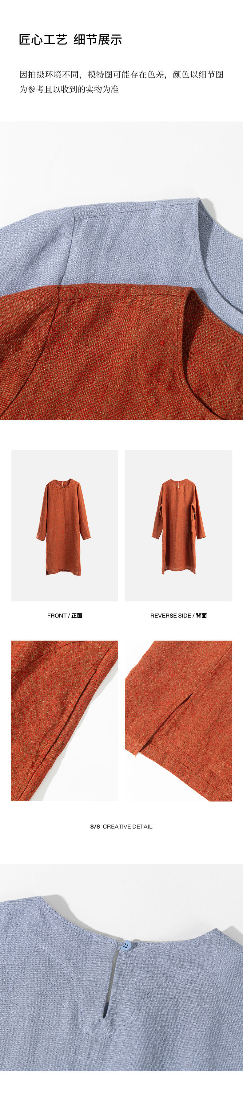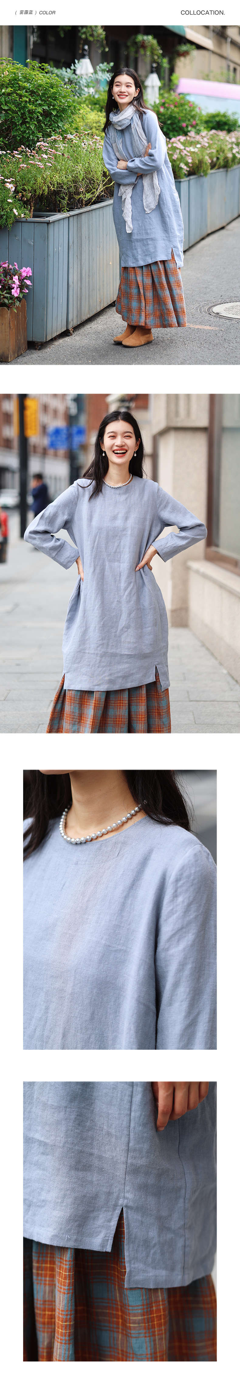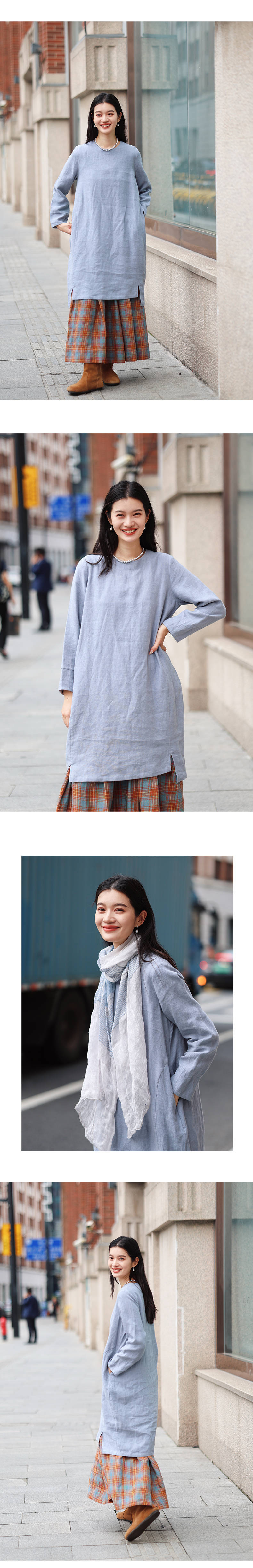 绽放旅行女装474朵/纯亚麻圆领廓感叠穿简约文艺长袖连衣裙中长款