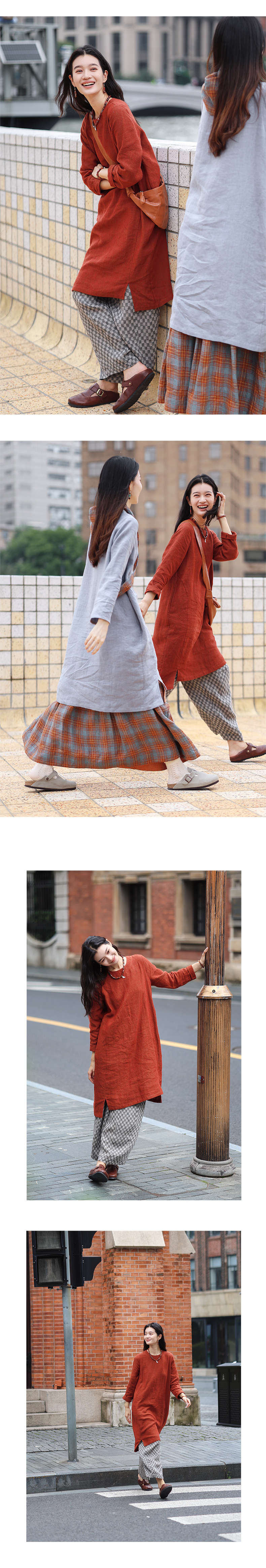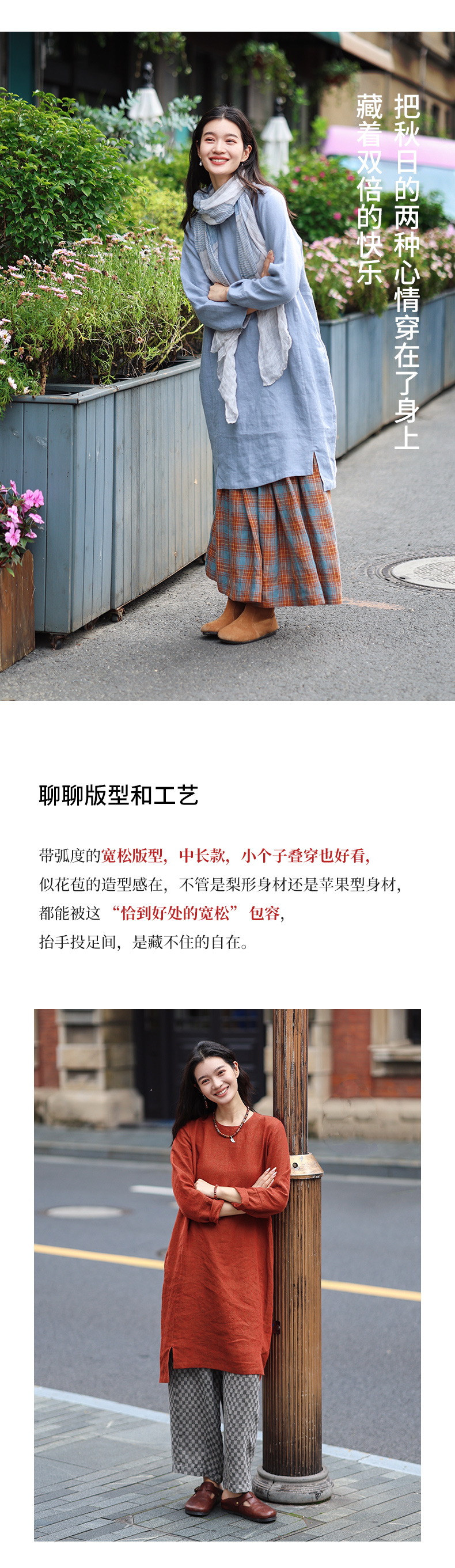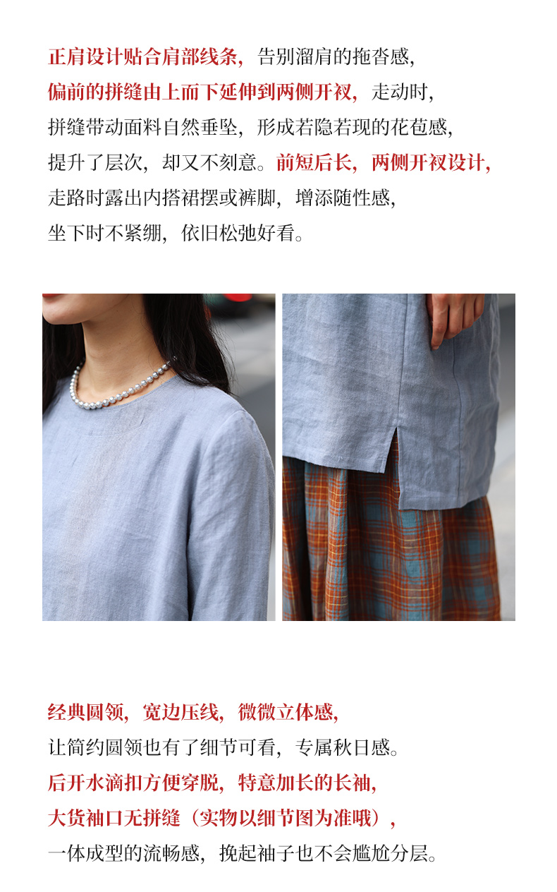 绽放旅行女装474朵/纯亚麻圆领廓感叠穿简约文艺长袖连衣裙中长款