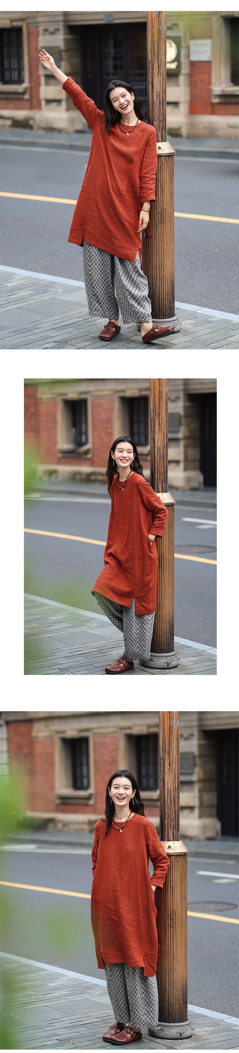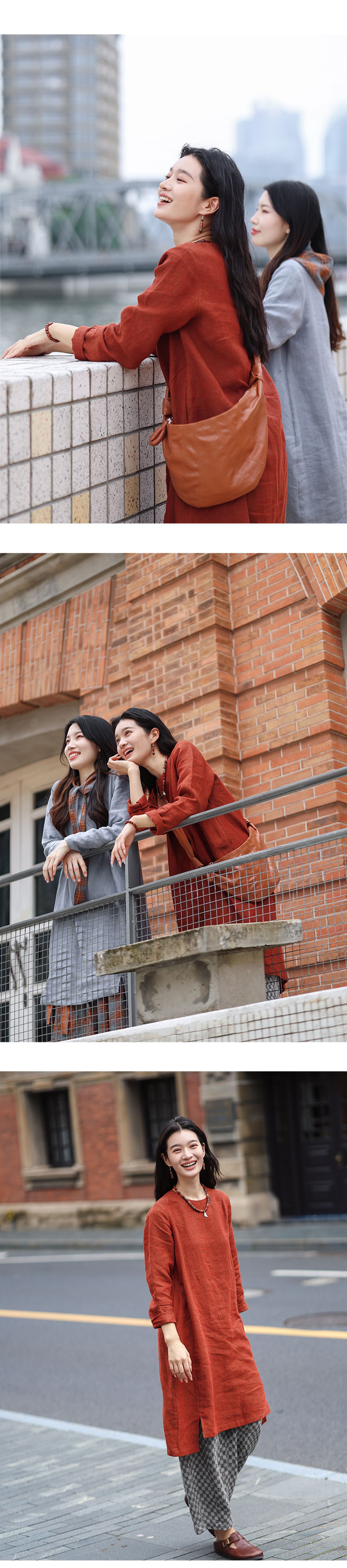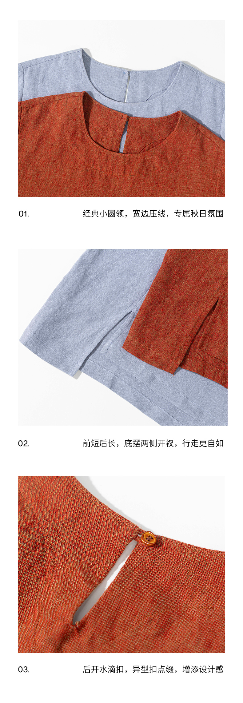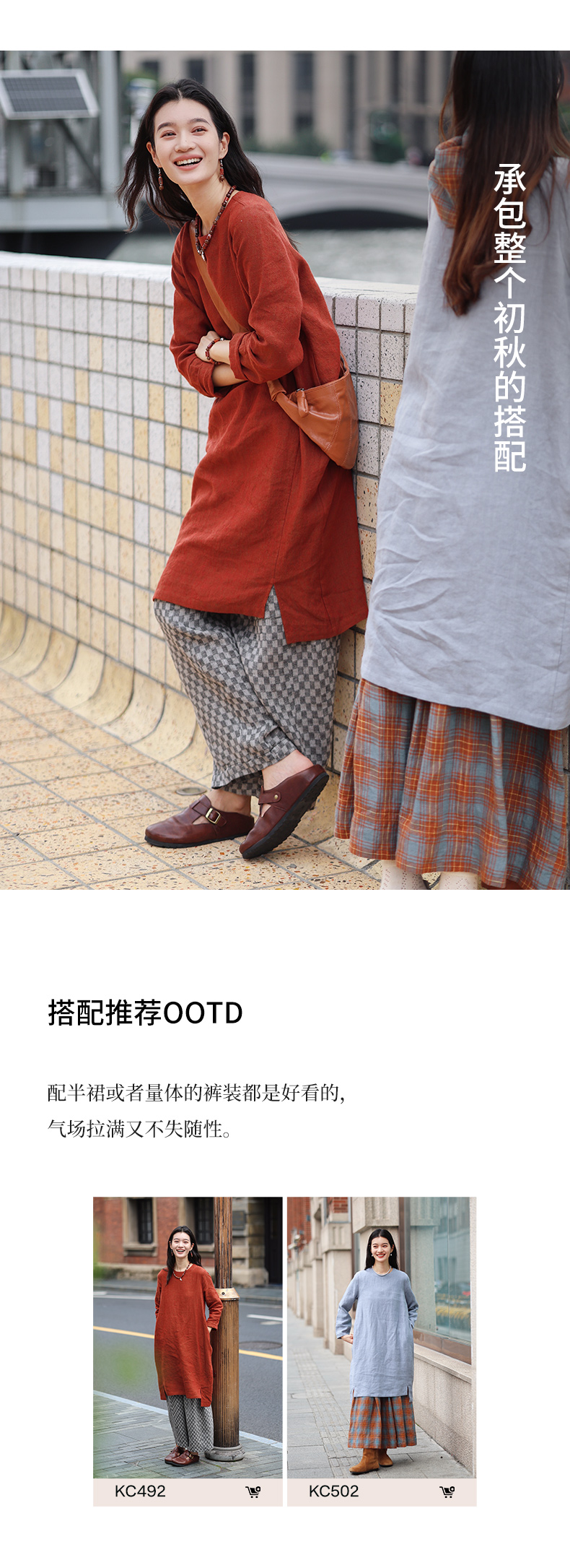 绽放旅行女装474朵/纯亚麻圆领廓感叠穿简约文艺长袖连衣裙中长款