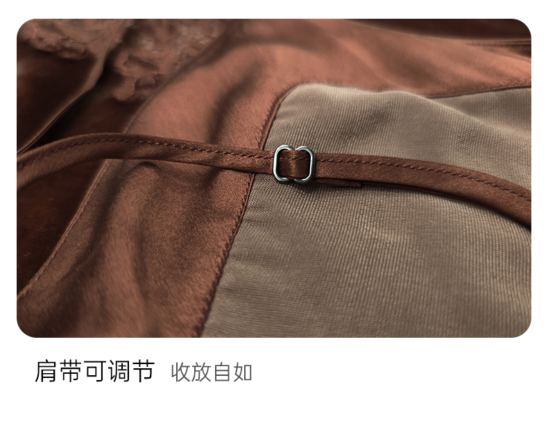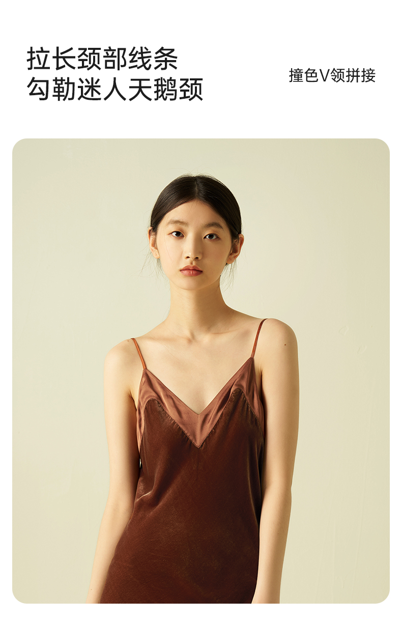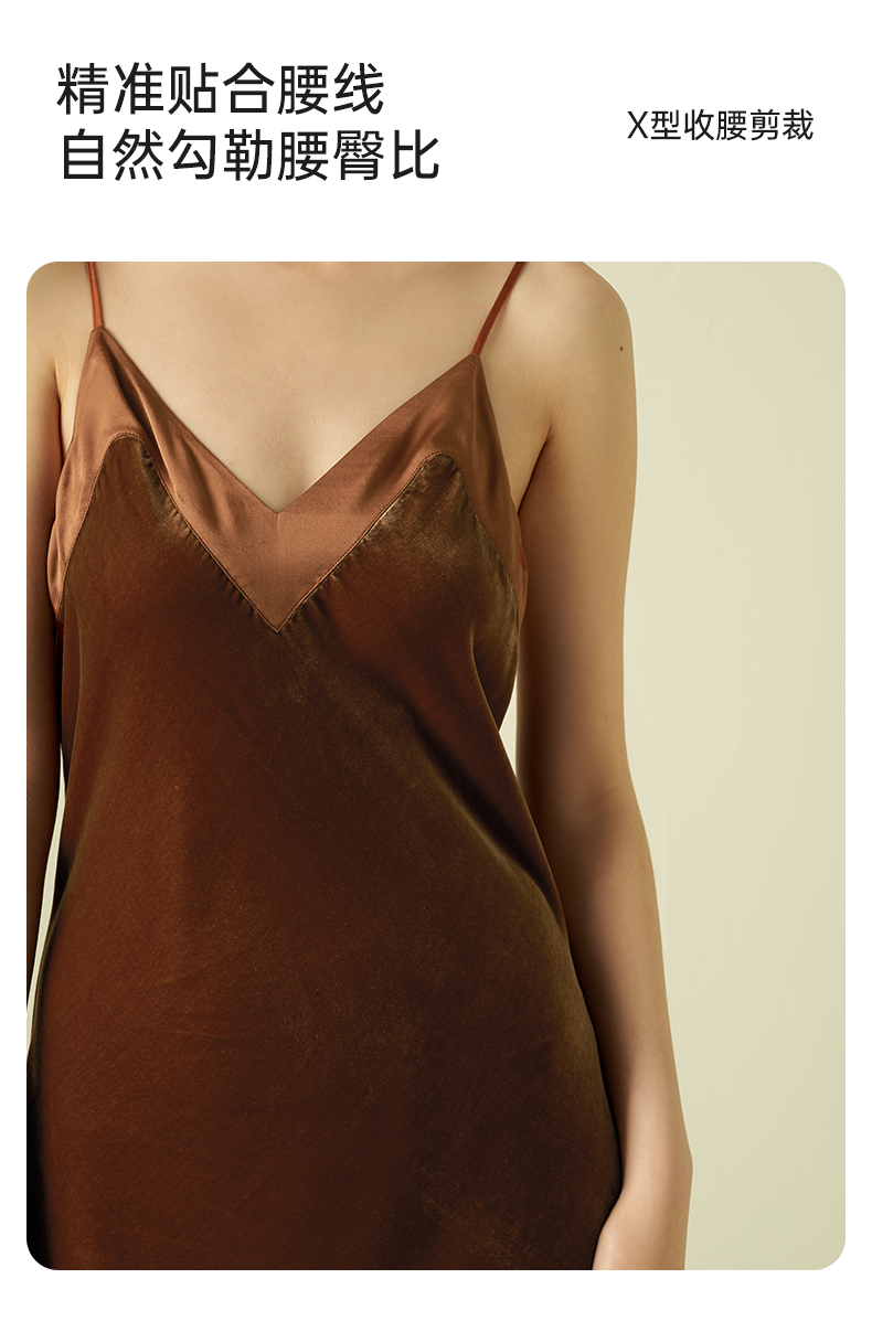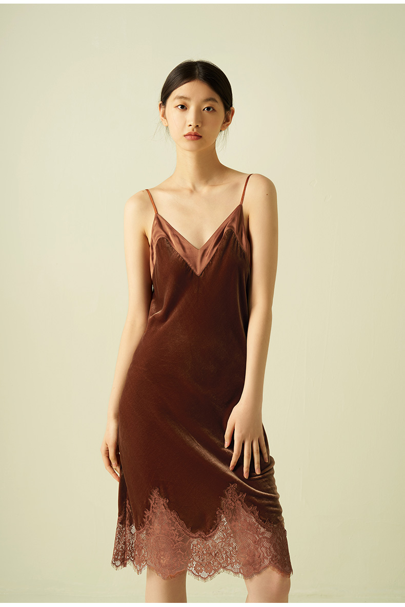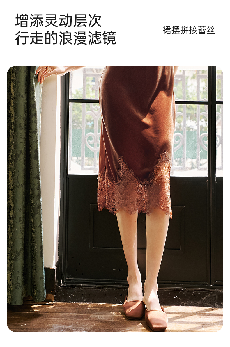 摩卡慕斯』桑罗桑蚕丝绒吊带裙蕾丝拼接性感睡裙女家居服可外穿