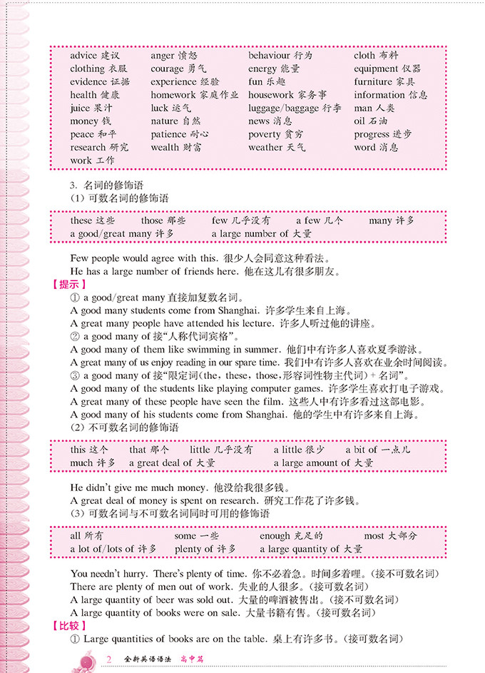 《全新英语语法 高中篇》内容全面,融识性、资料性与工具性于一身。涵盖所有高考语法项目和日常英语学习中涉及到的语法项目,且讲解全面系统,重点、难点、易混点通过“考点提示”“比较”“辨析”等形式进行特别提示,让学生能够更加深入地理解。是学生在高中阶段学习英语语法、备战高考的好帮手。