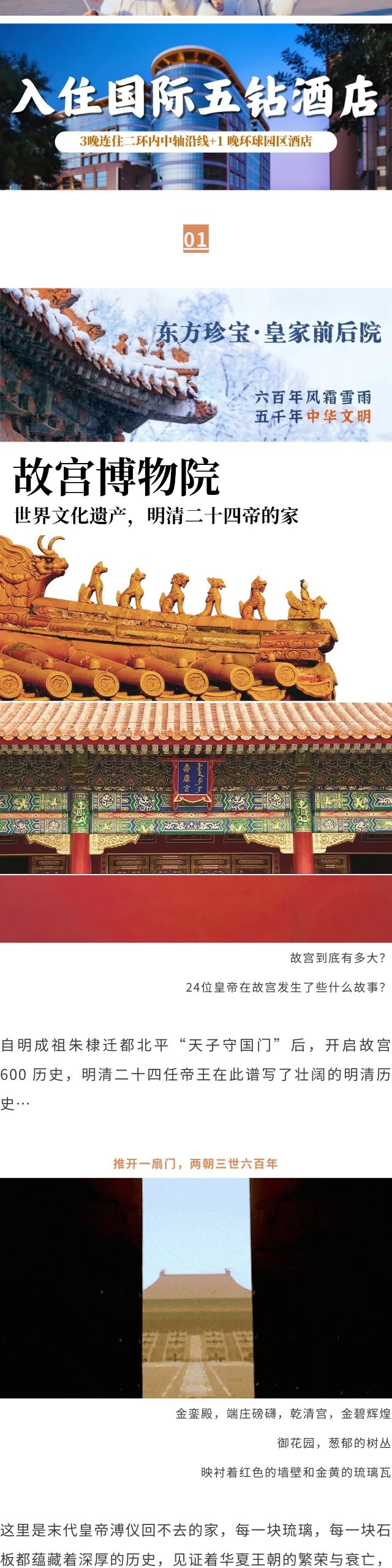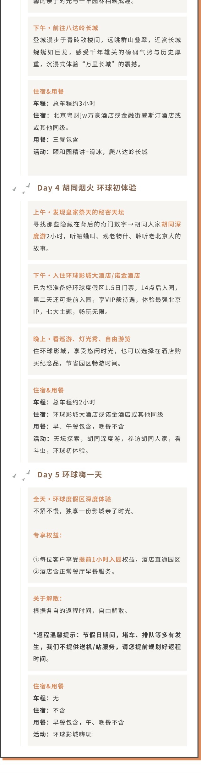 包含以下活动涉及的第一景点门票:故宫、天坛、颐和园+滑冰体验、胡同文化体验(听蛐蛐、观老物什)、八达岭长城、专车夜游北京、环球度假区 1.5 日门票。
