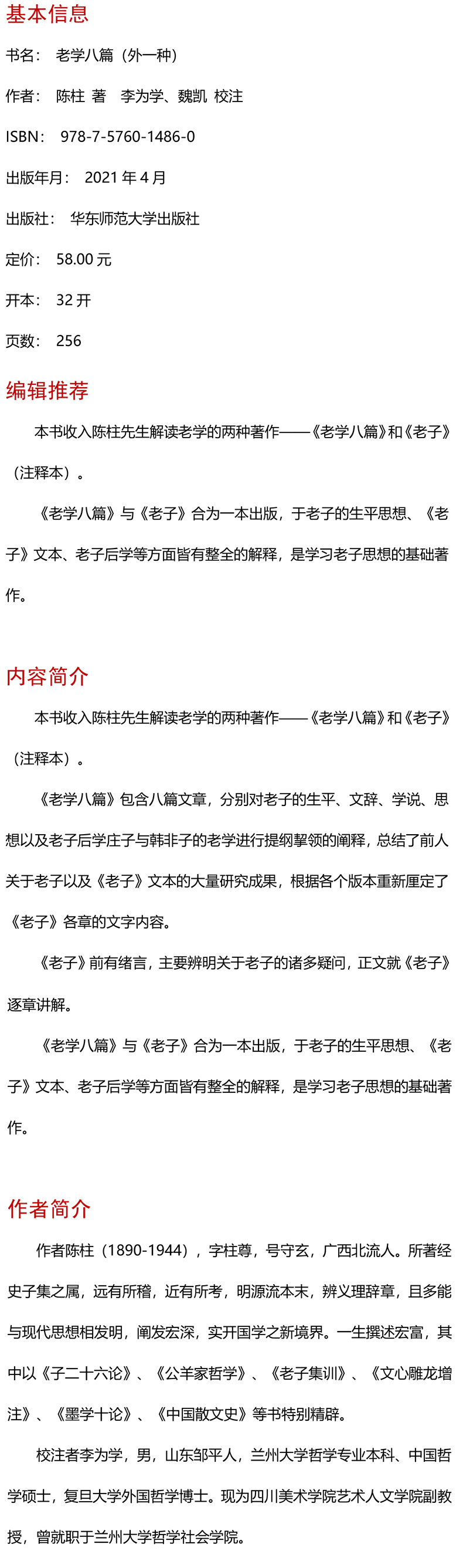老学八篇 外一种 六点分社 老子学研究 中国传统经典与解释 中国古代哲学经典 陈柱著 李为学 魏凯校注