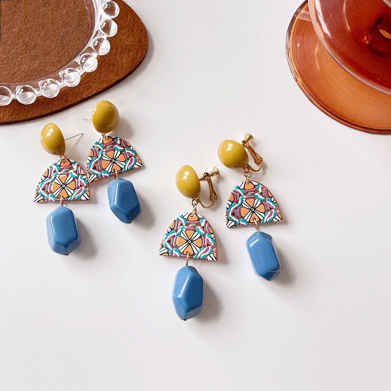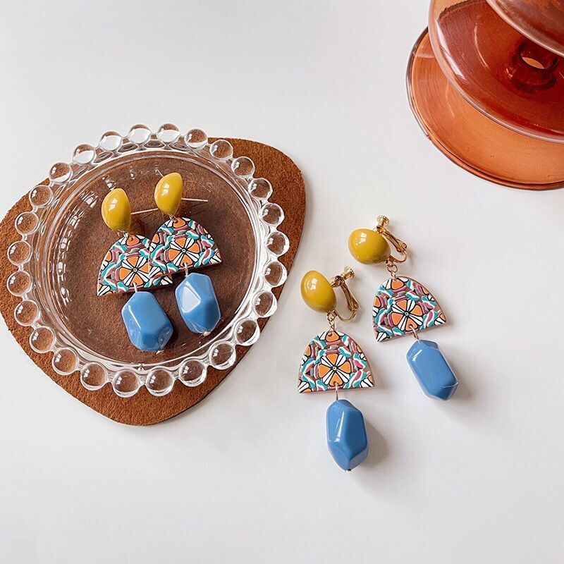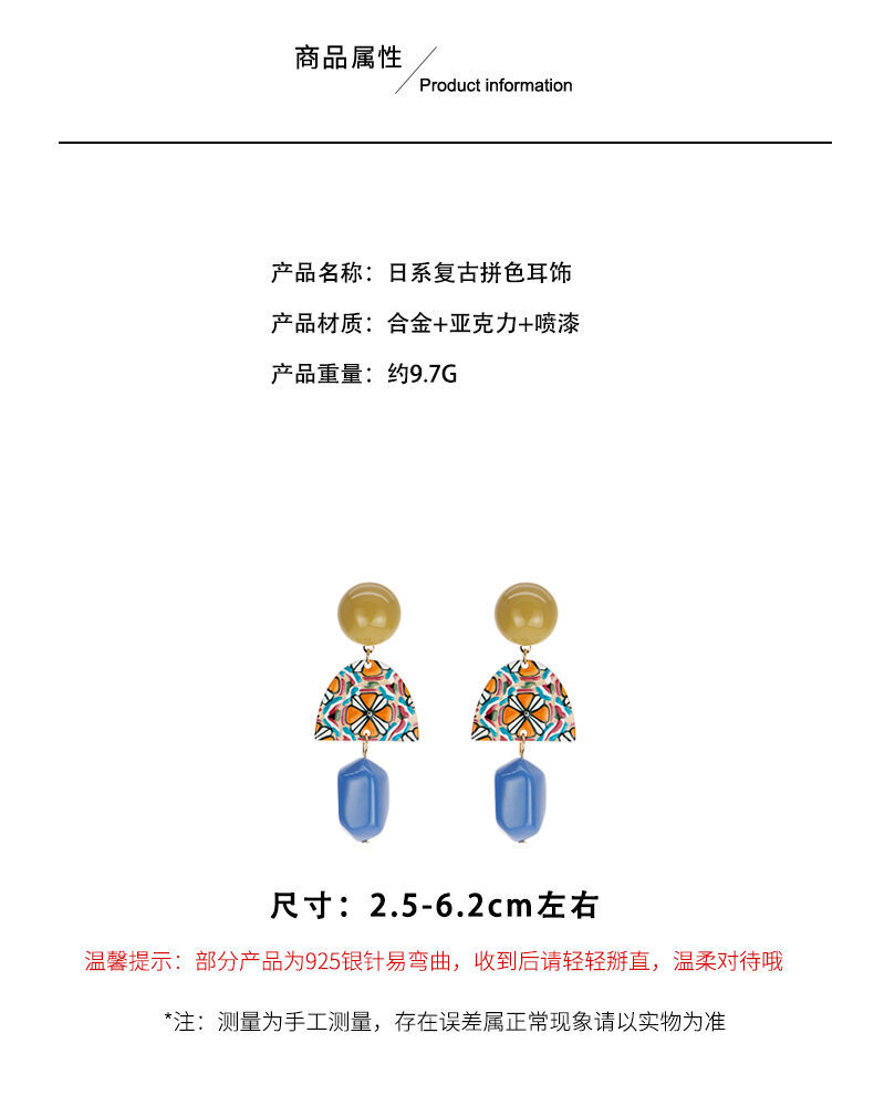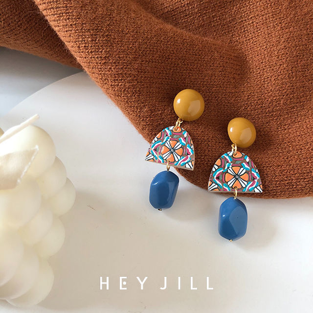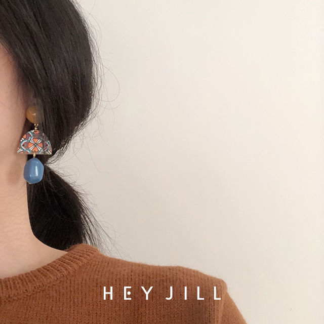 HEYJILL自制 蓝色多瑙河 日系复古黄蓝撞色树脂长耳环原创