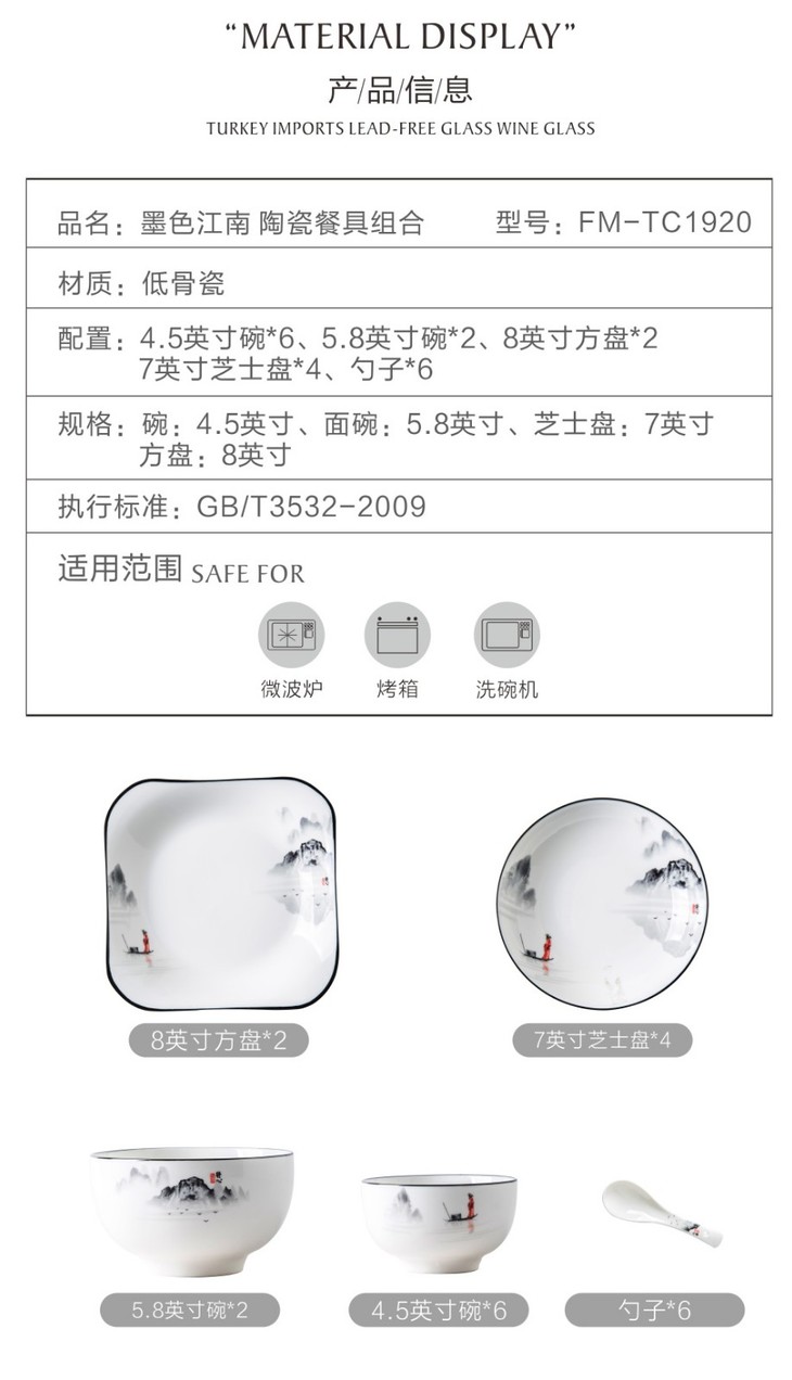 菲米生活(PHMI)碗碟套装骨瓷餐具陶瓷盘子家用面碗汤碗墨色江南20件组合
