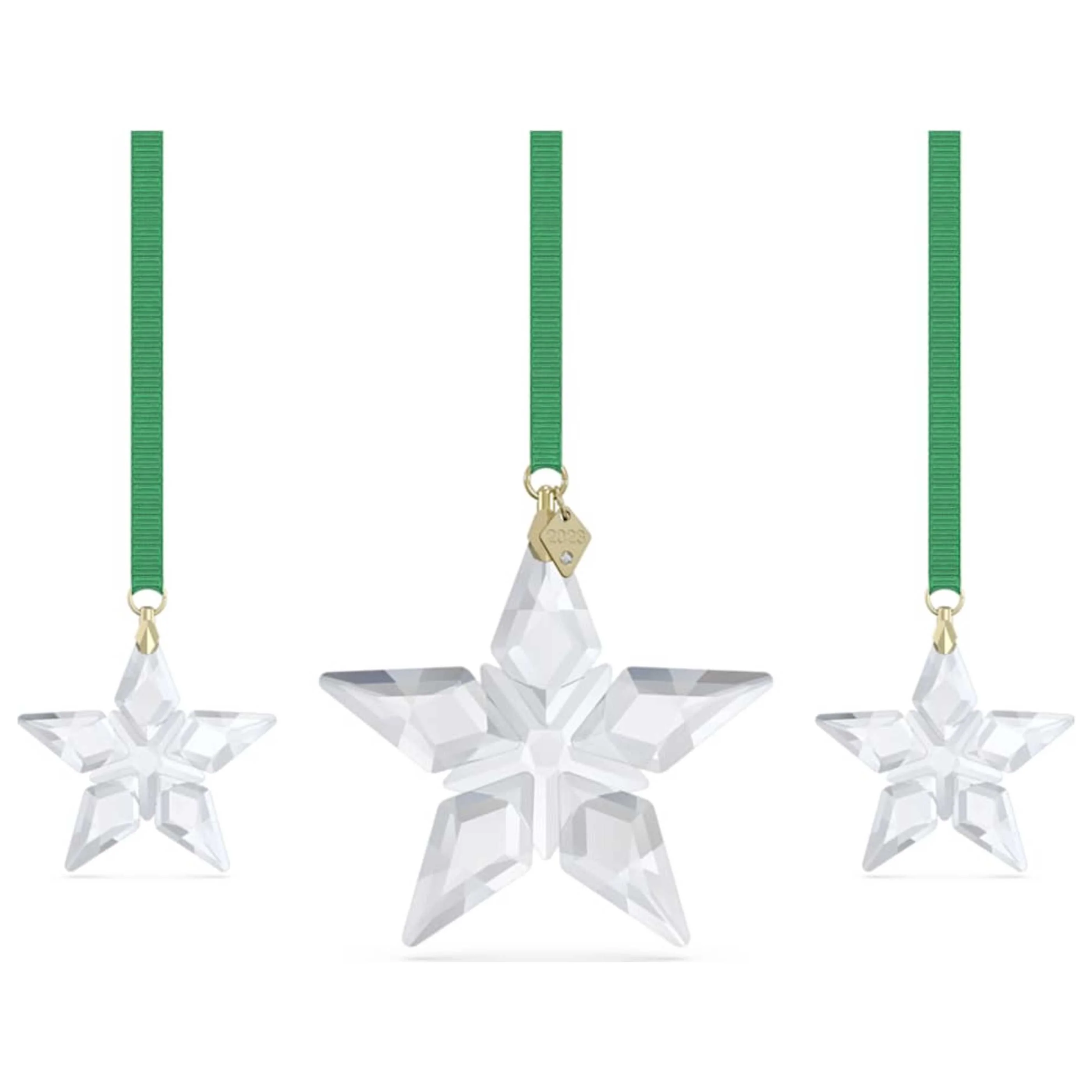 包含三个透明星星,灵感来自自然与科学的和谐。这个套装延续了施华洛世奇年度挂饰的经典传统,由一个较大的星星和两个较小的星星组成,总共291 个切面。每个星星都配有绿色罗缎丝带和金色镀金配件,主星星上还刻有"2023" 字样。这个套装是为节日装饰设计的,可以作为礼物或装饰品收藏品