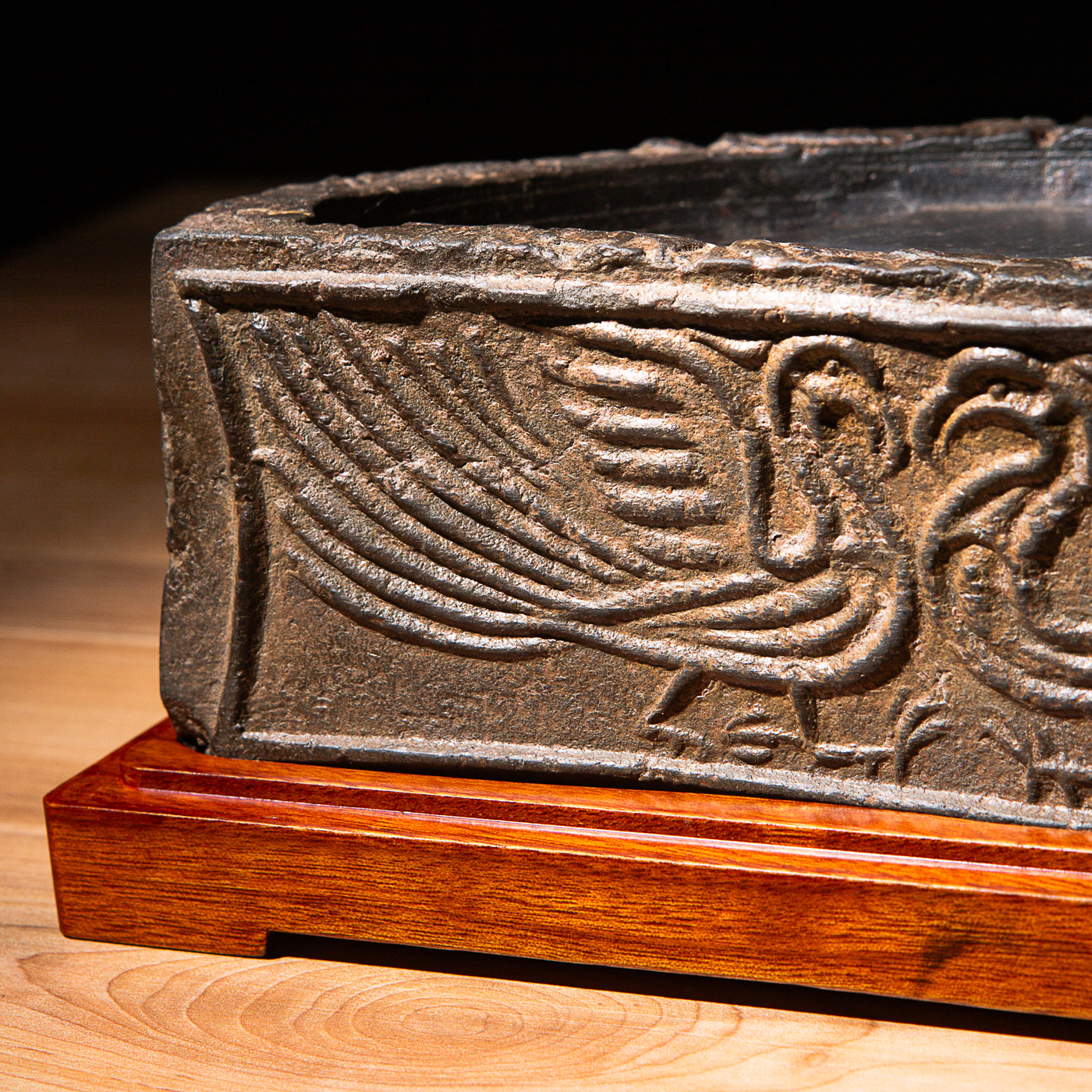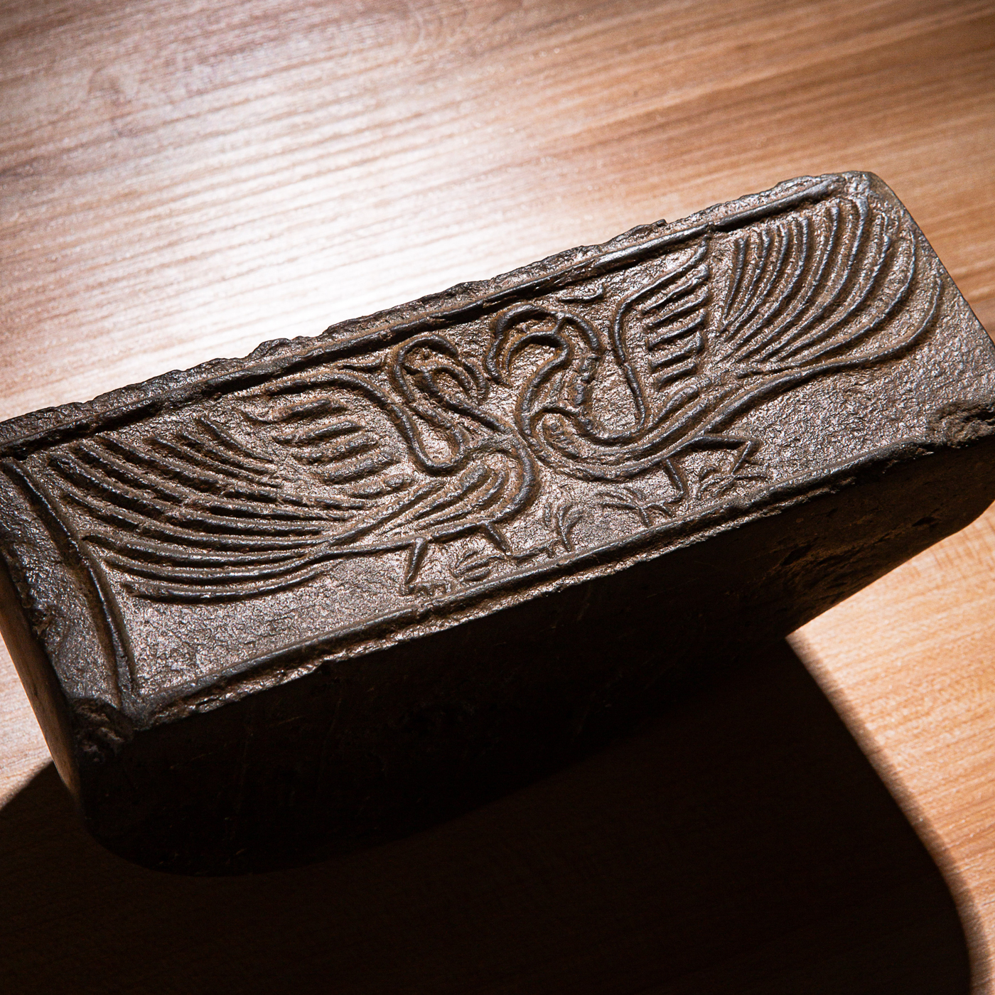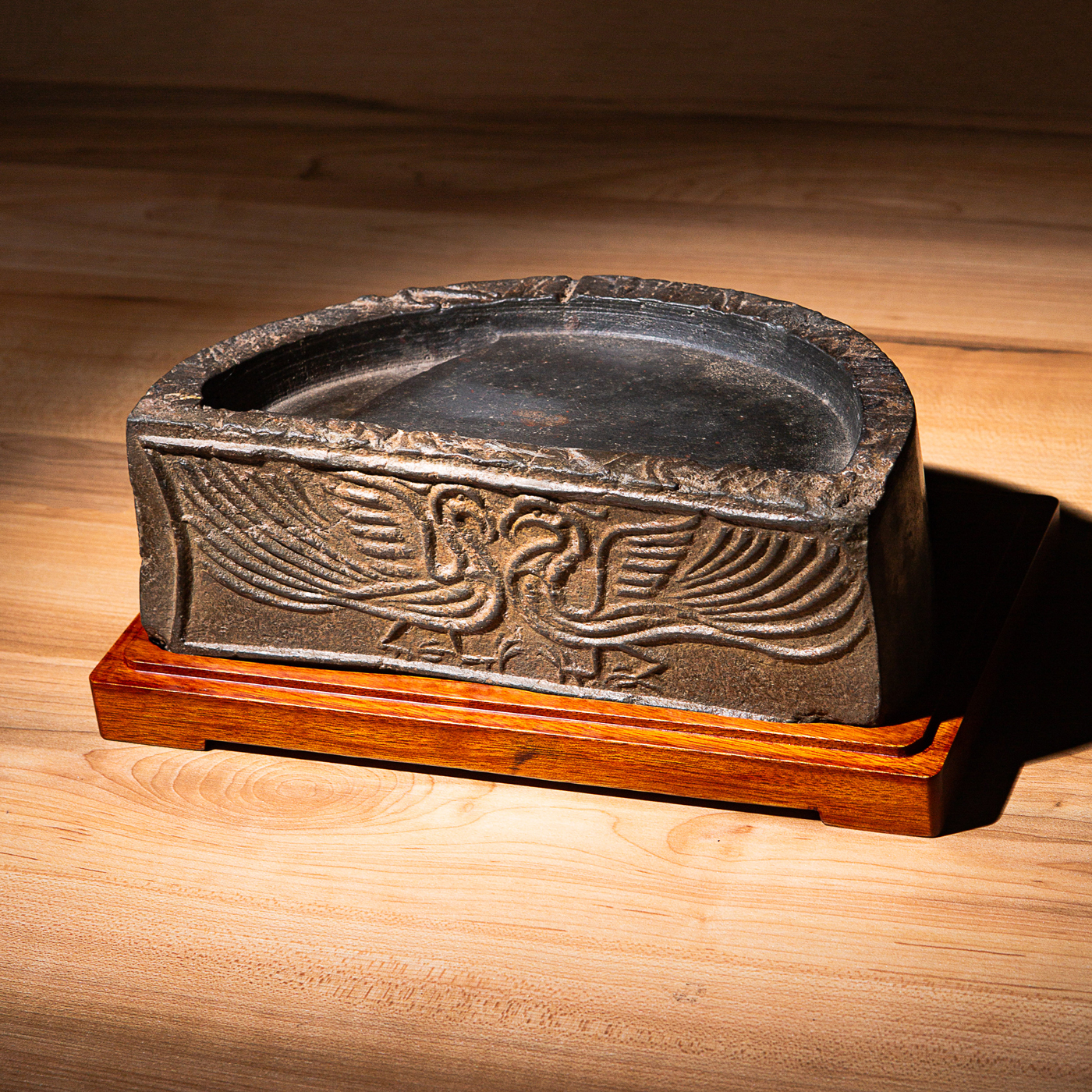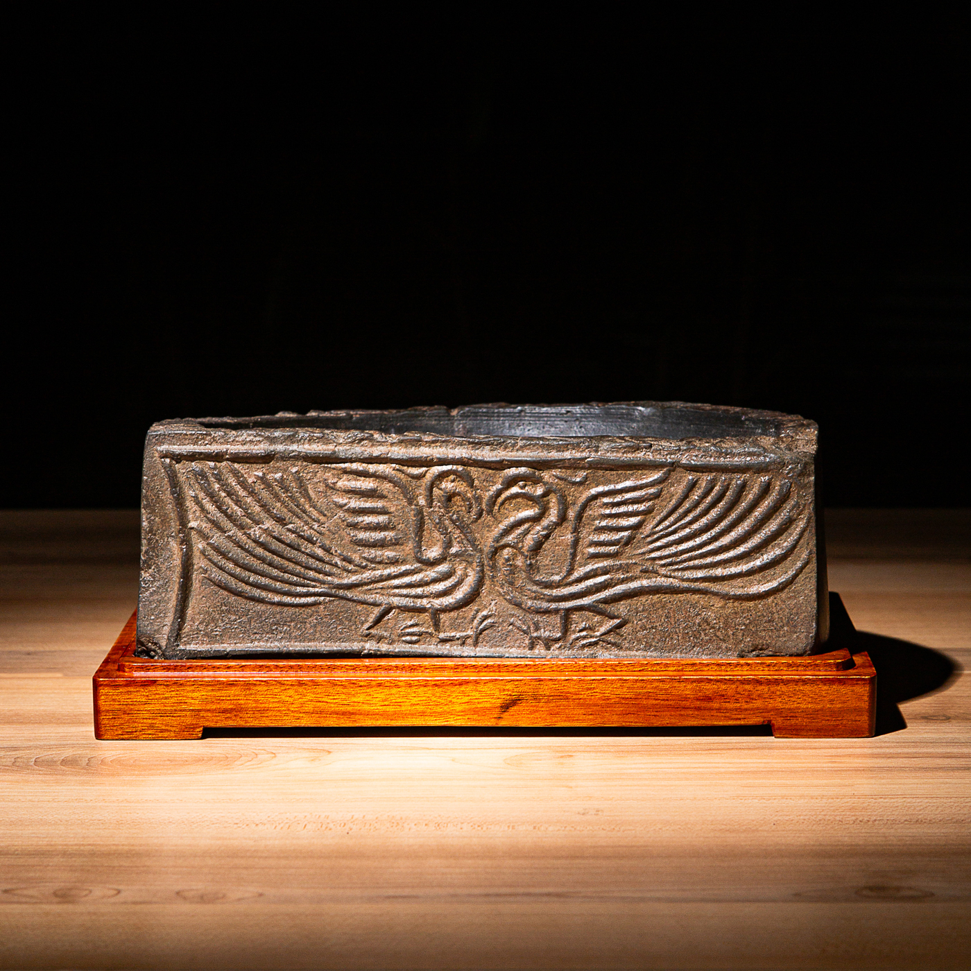 “双神雀”古砖制砚。神雀纹饰赋有神韵,精美华丽,气息古朴。砚之器型端庄典雅,胎质坚实细腻,且配有手工精制刻字木盒。此砚为文人案头之佳品。
