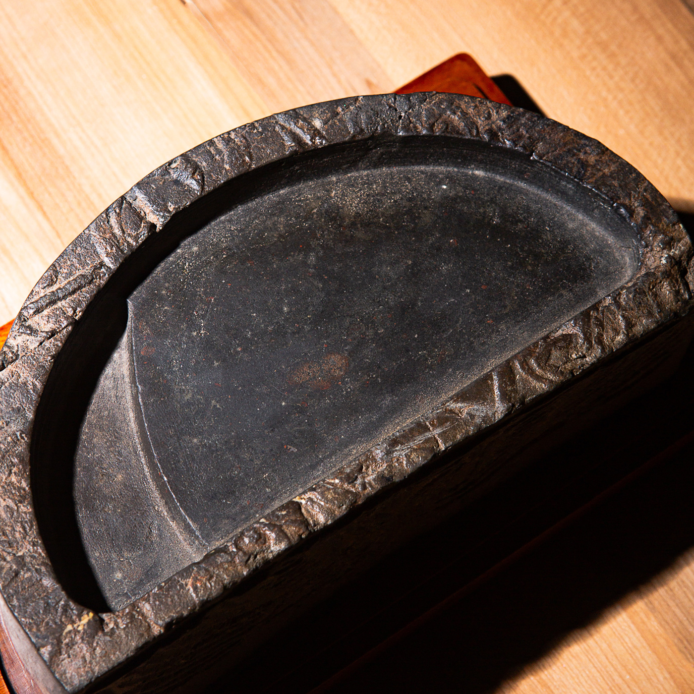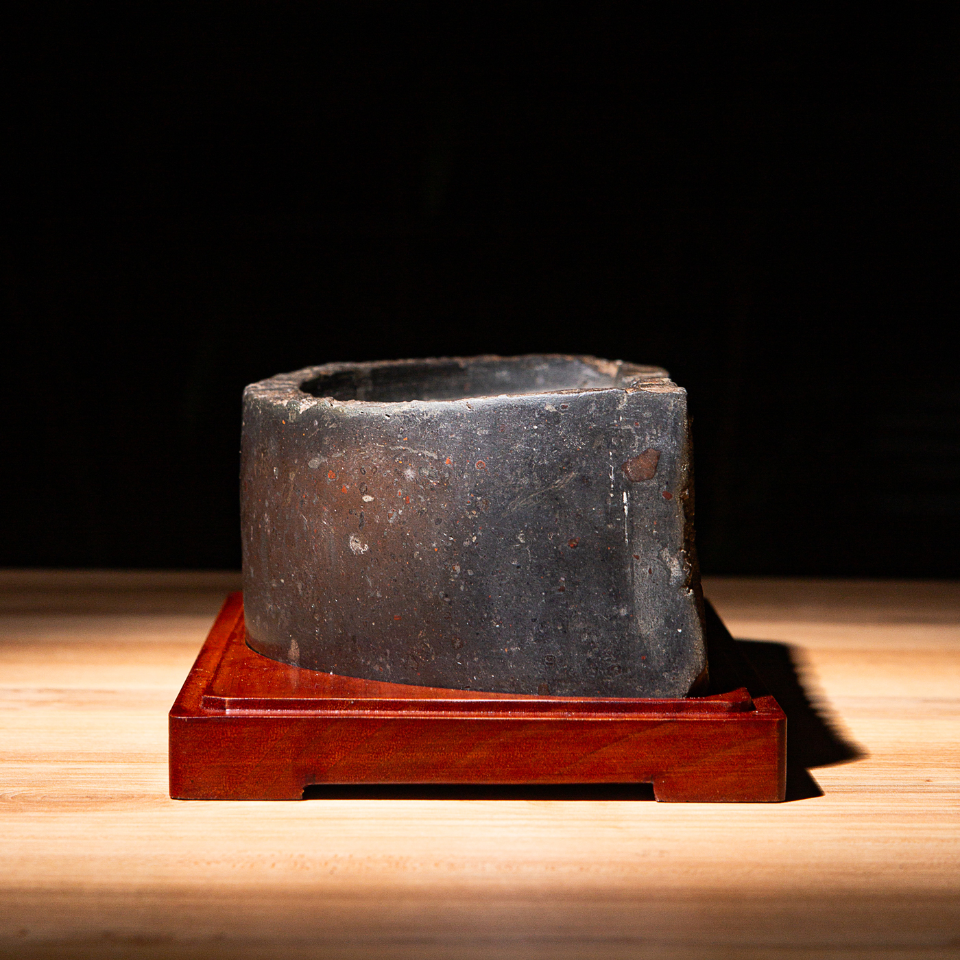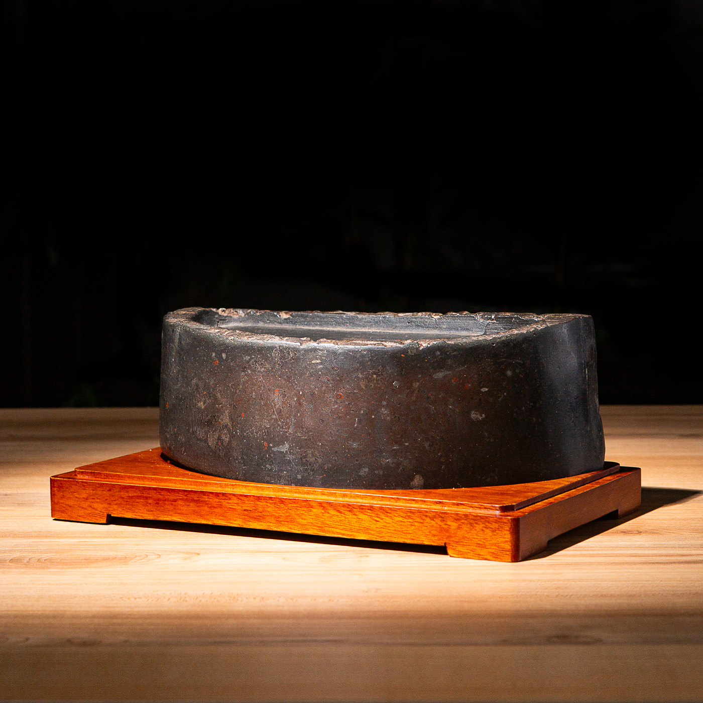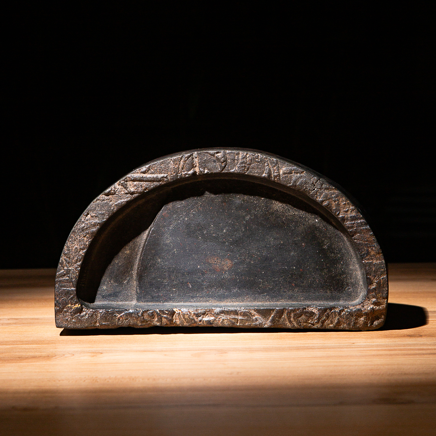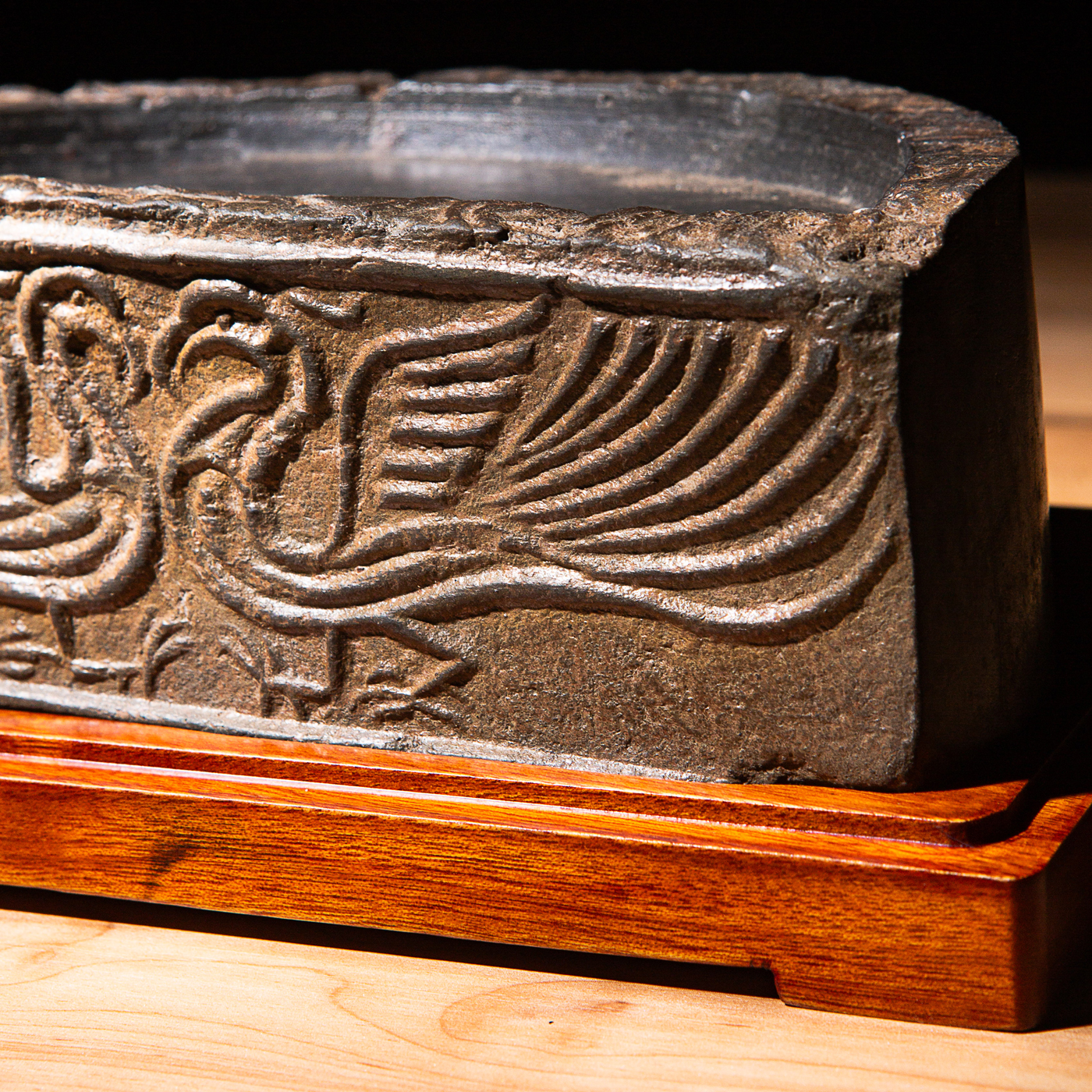 “双神雀”古砖制砚。神雀纹饰赋有神韵,精美华丽,气息古朴。砚之器型端庄典雅,胎质坚实细腻,且配有手工精制刻字木盒。此砚为文人案头之佳品。
