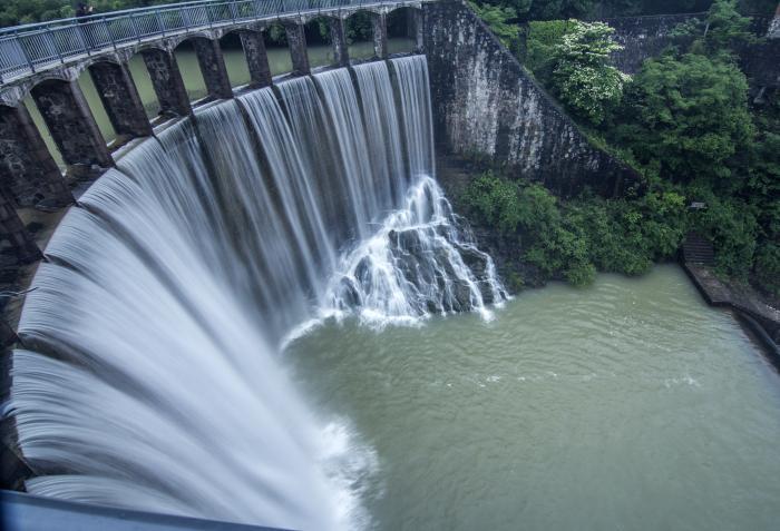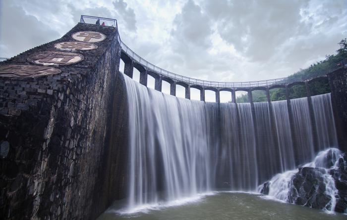 每当发水季节,山水浩荡涌来,从溢流孔中倾泻而下