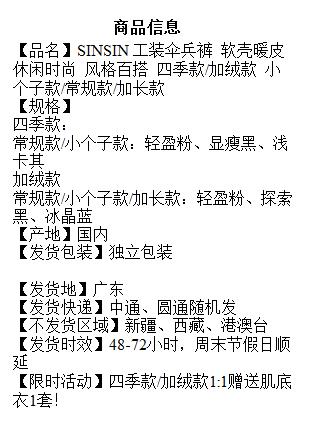 SINSIN 工装伞兵裤 软壳暖皮 休闲时尚 风格百搭 四季款/加绒款 小个子款/常规款/加长款