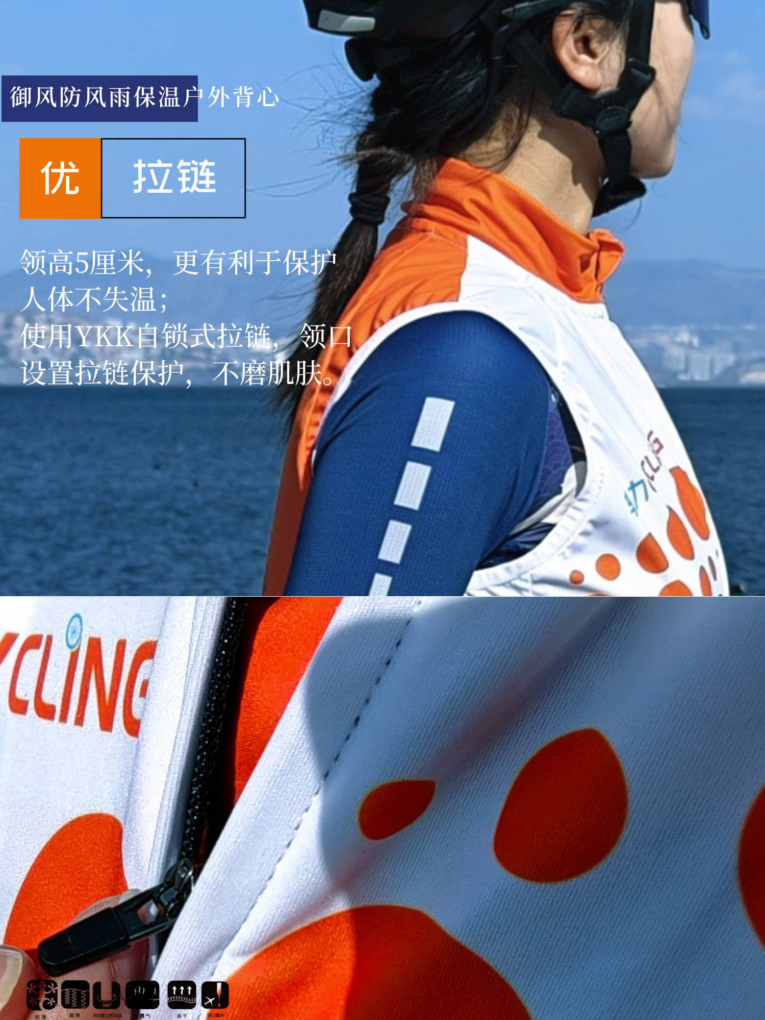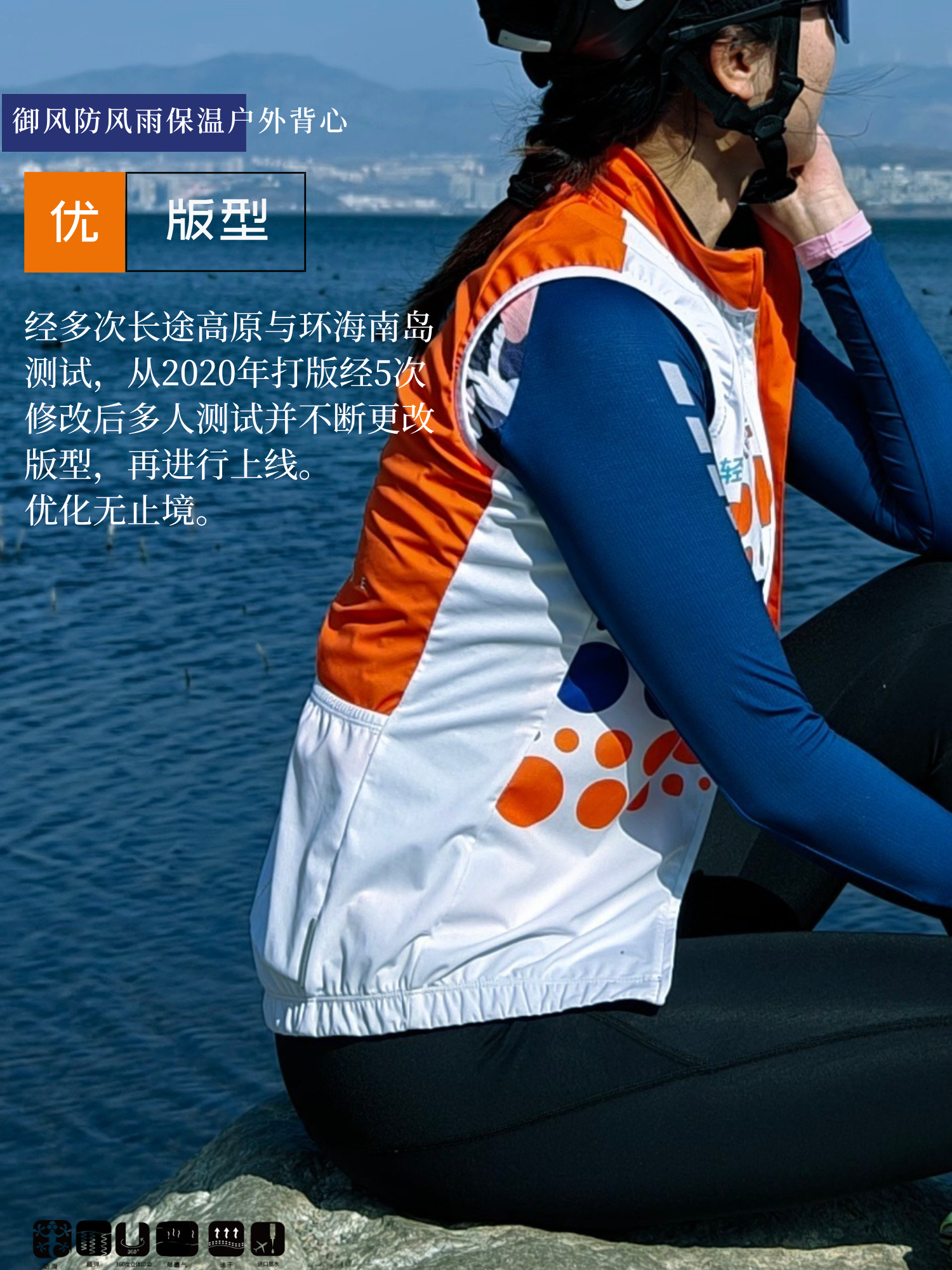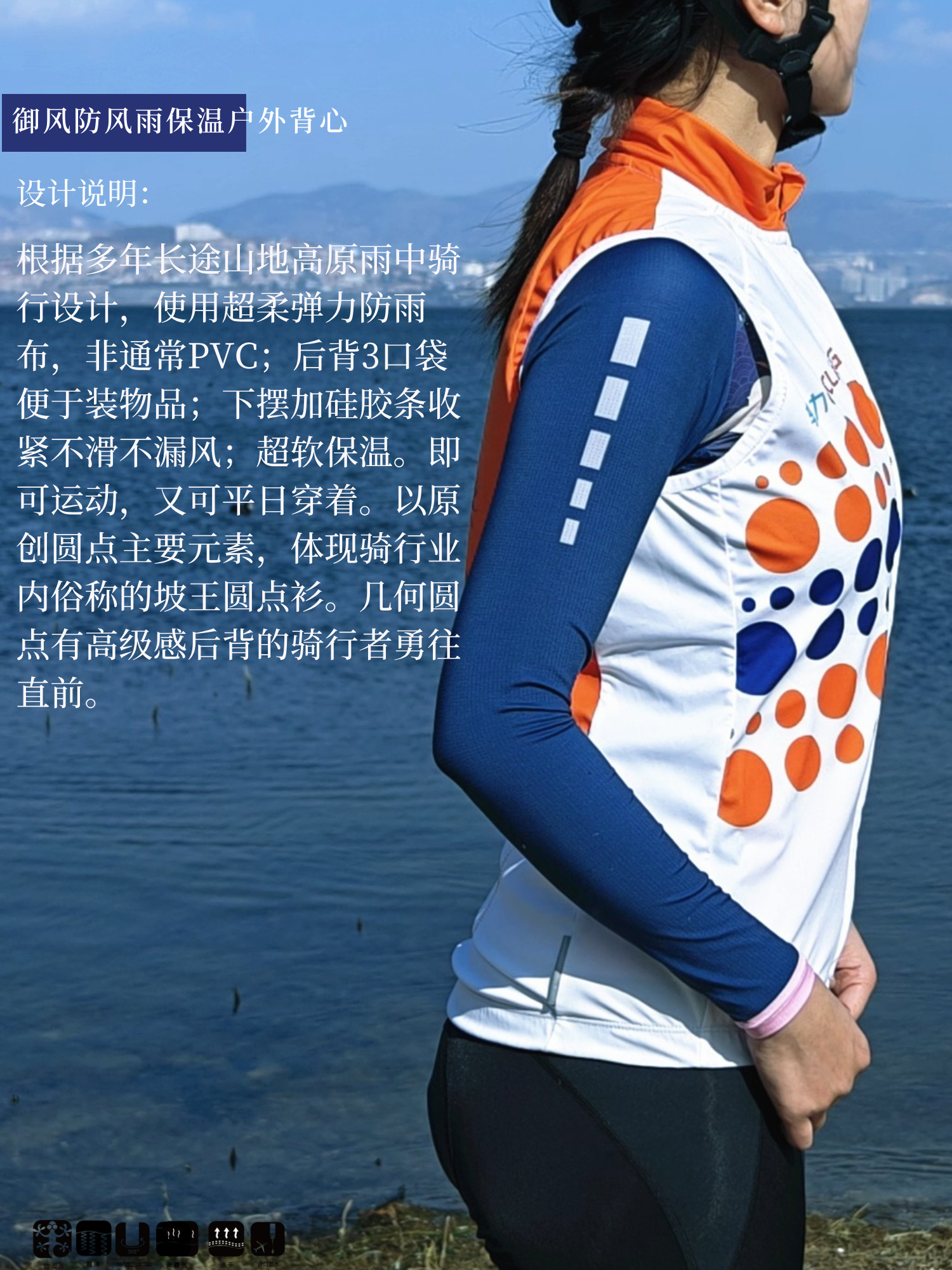 根据多年长途山地高原雨中户外运动与骑行设计,使用超柔弹力防雨布,非通常PVC;后背3口袋便于装物品;下摆加硅胶条收紧不滑不漏风;超软保温。即可运动,又可平日穿着。以原创圆点主要元素,几何圆点有高级感。