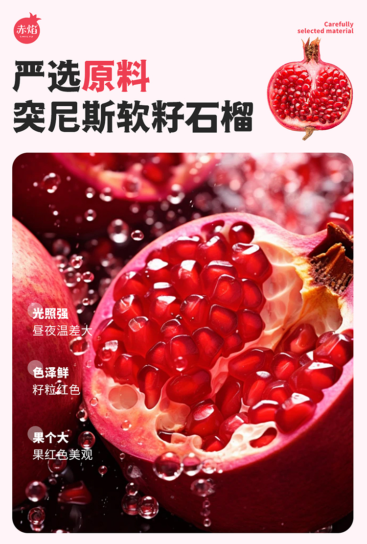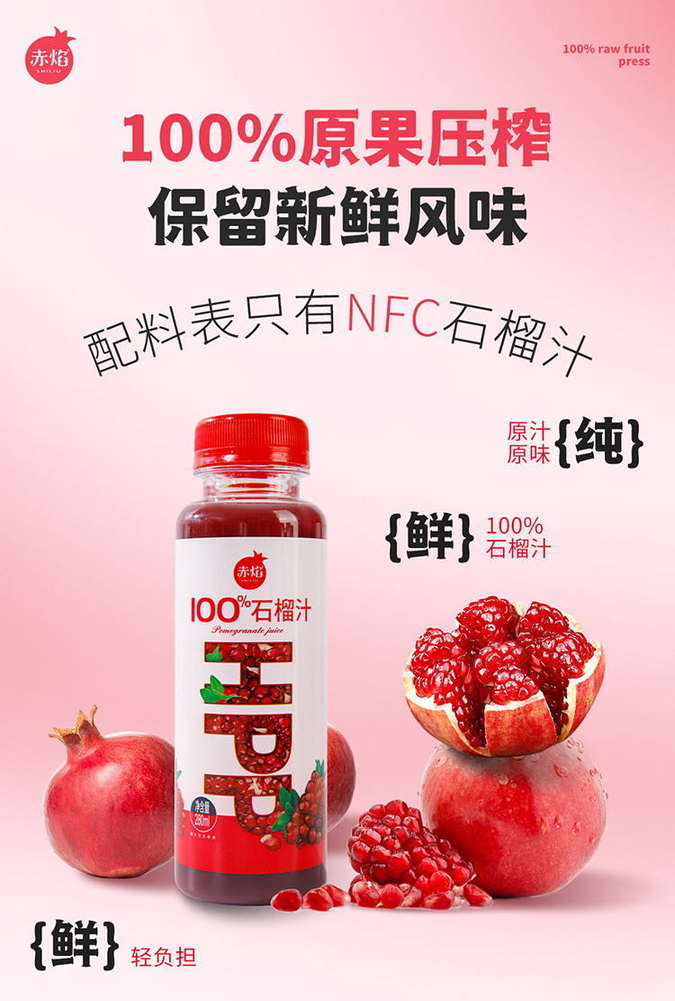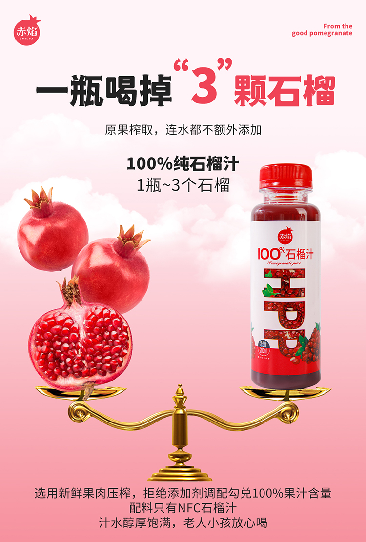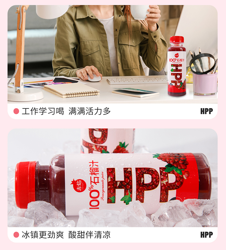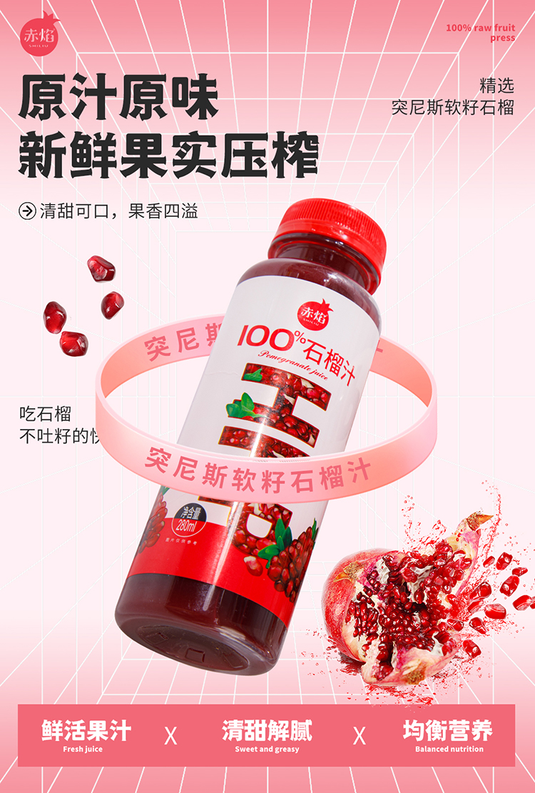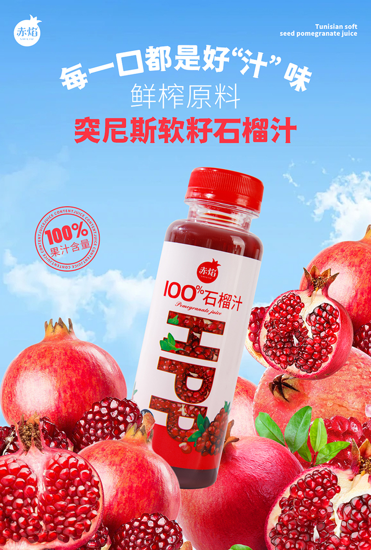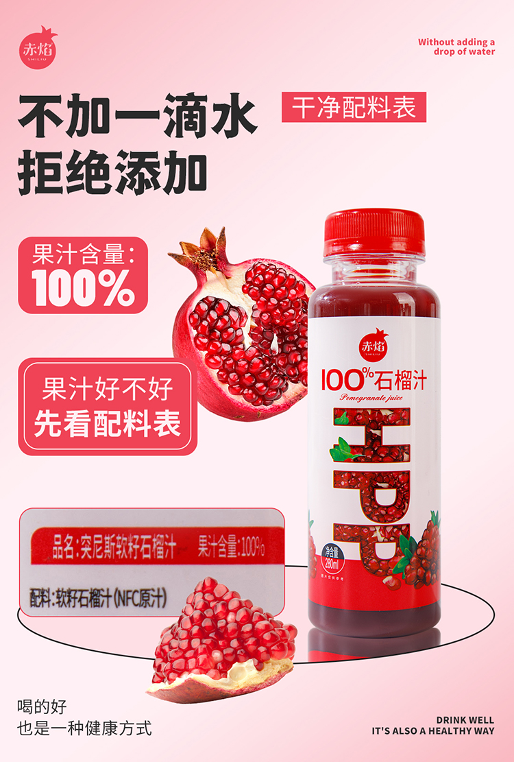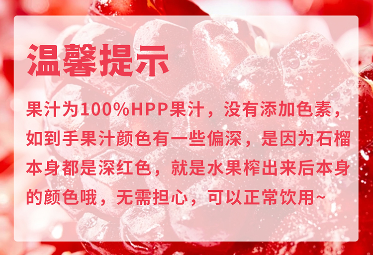 【突尼斯软籽石榴汁】软籽石榴原果榨取,保留新鲜, 100%石榴鲜榨果汁,品质可靠有保障,酸甜交织,清新可口,口感层次丰富, 富含维生素C,感恩大自然的馈赠