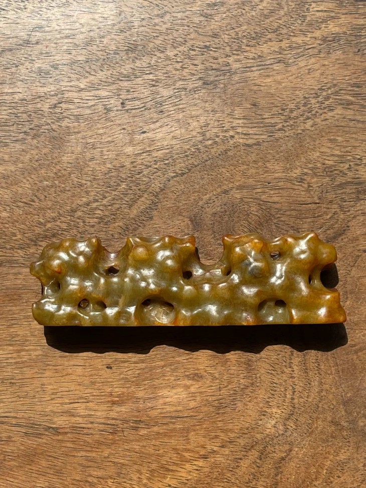 此黄沁籽料白玉镂雕太湖石形笔搁/山子摆件,除玉石天然石纹线外,保存完好无损,表面包浆皮壳温润细腻。