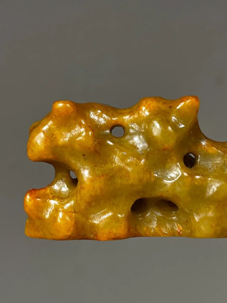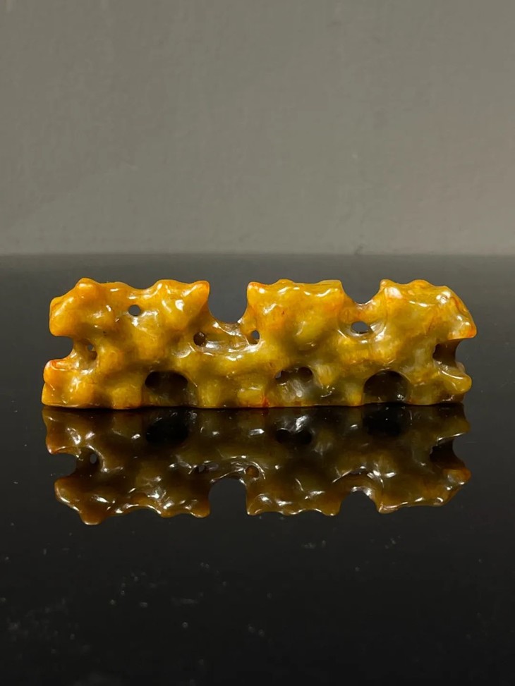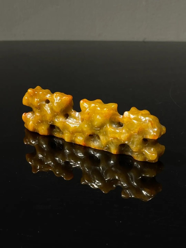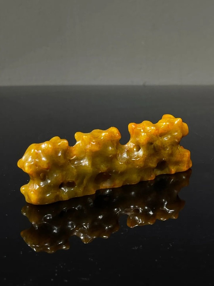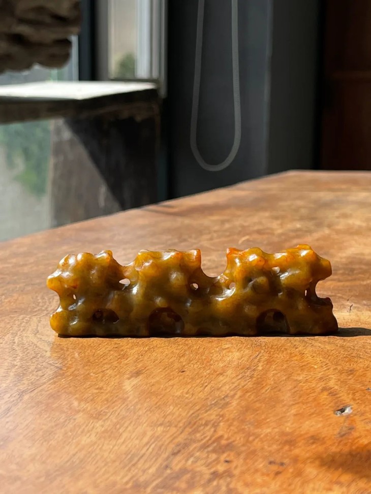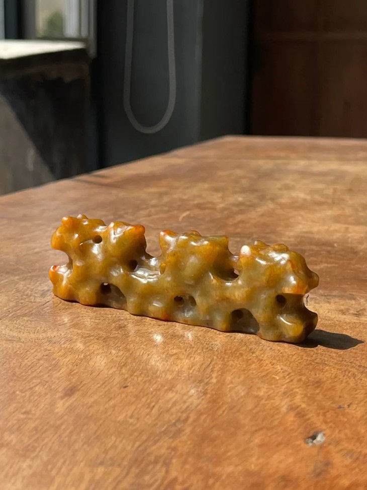 这是一件以质量上好的新疆和田黄沁籽料白玉镂空透雕而成的仿太湖奇石型文人案头山子摆件笔搁。古代文人除了将大型的奇石与奇木摆放于庭园观赏外,尺寸合适置于文房几案上当陈设品的小奇石摆件称为山子,唐宋以来,山子一直是文房雅玩之重要品类。基本上,山子就是取于大自然的奇石或怪木,或是以玉石、竹木、陶瓷等可雕塑材质仿奇石,配上底座置于案头的摆设。