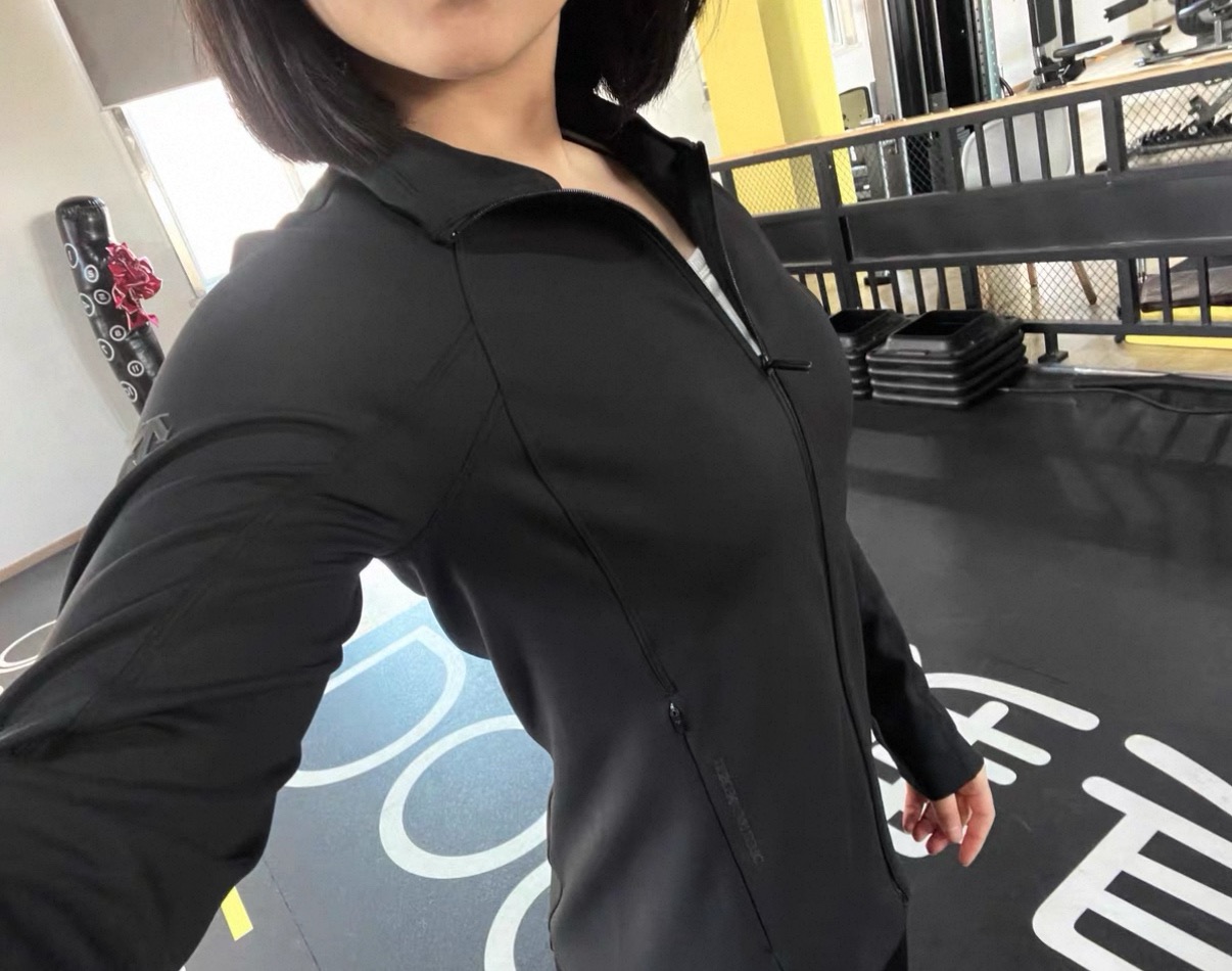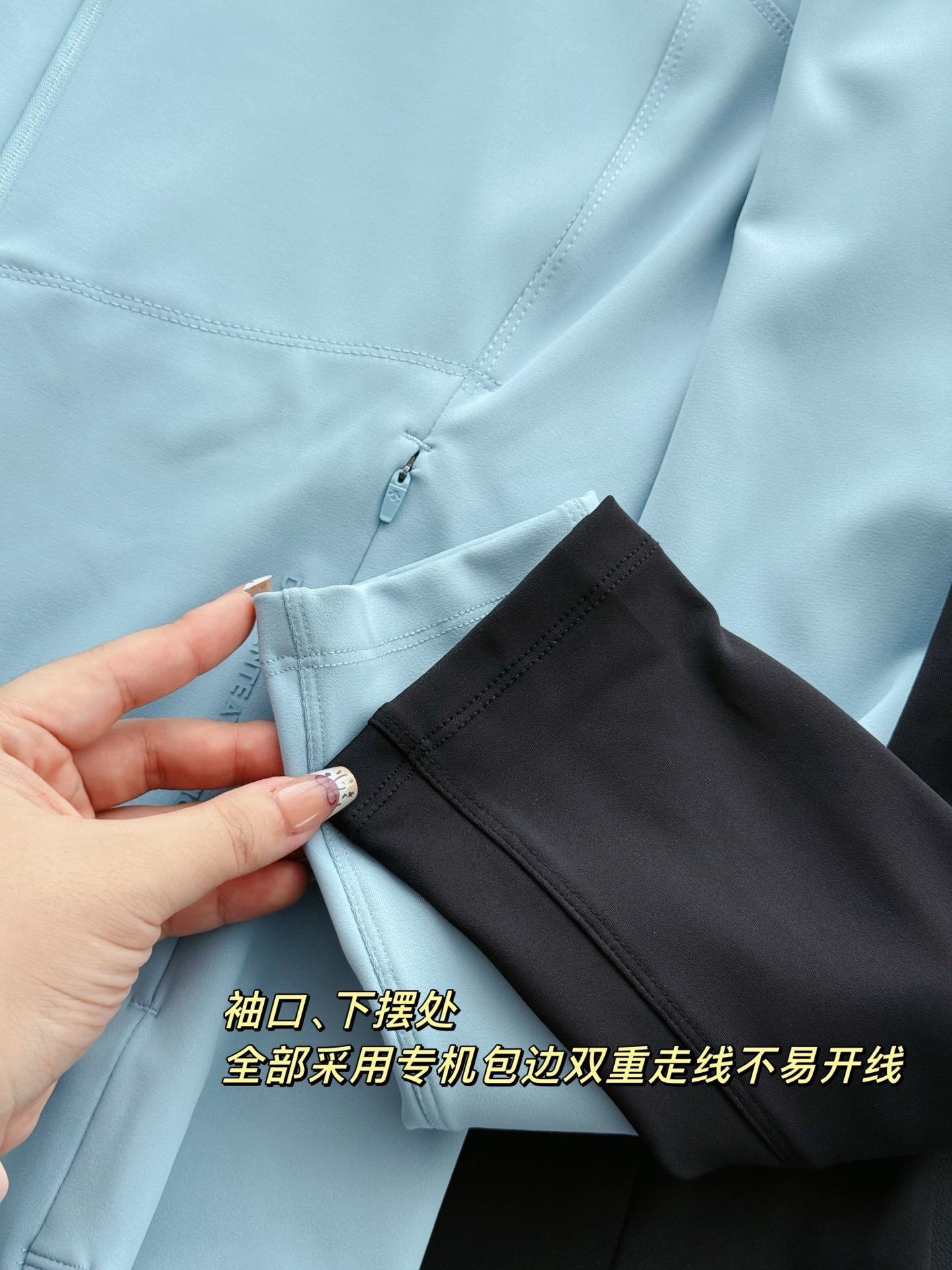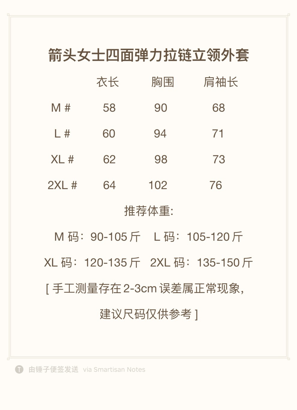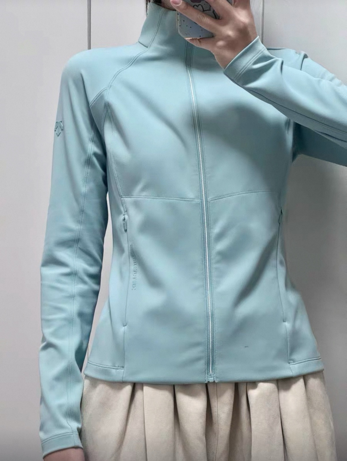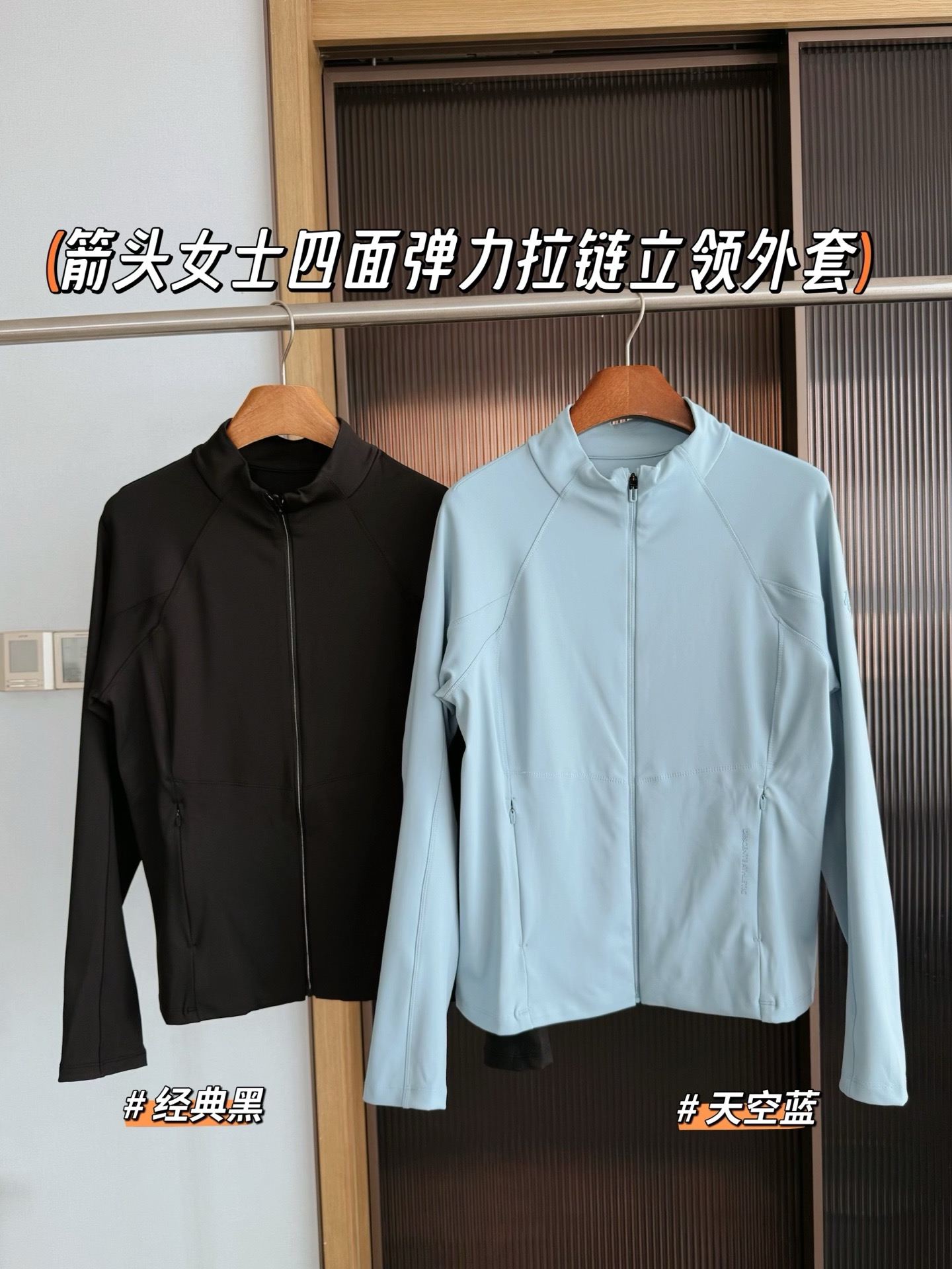 垂坠感很好,整个线条流畅,属于超柔软且高弹类型的,贴身贼舒服!箭头女士四面弹力拉链立领外套