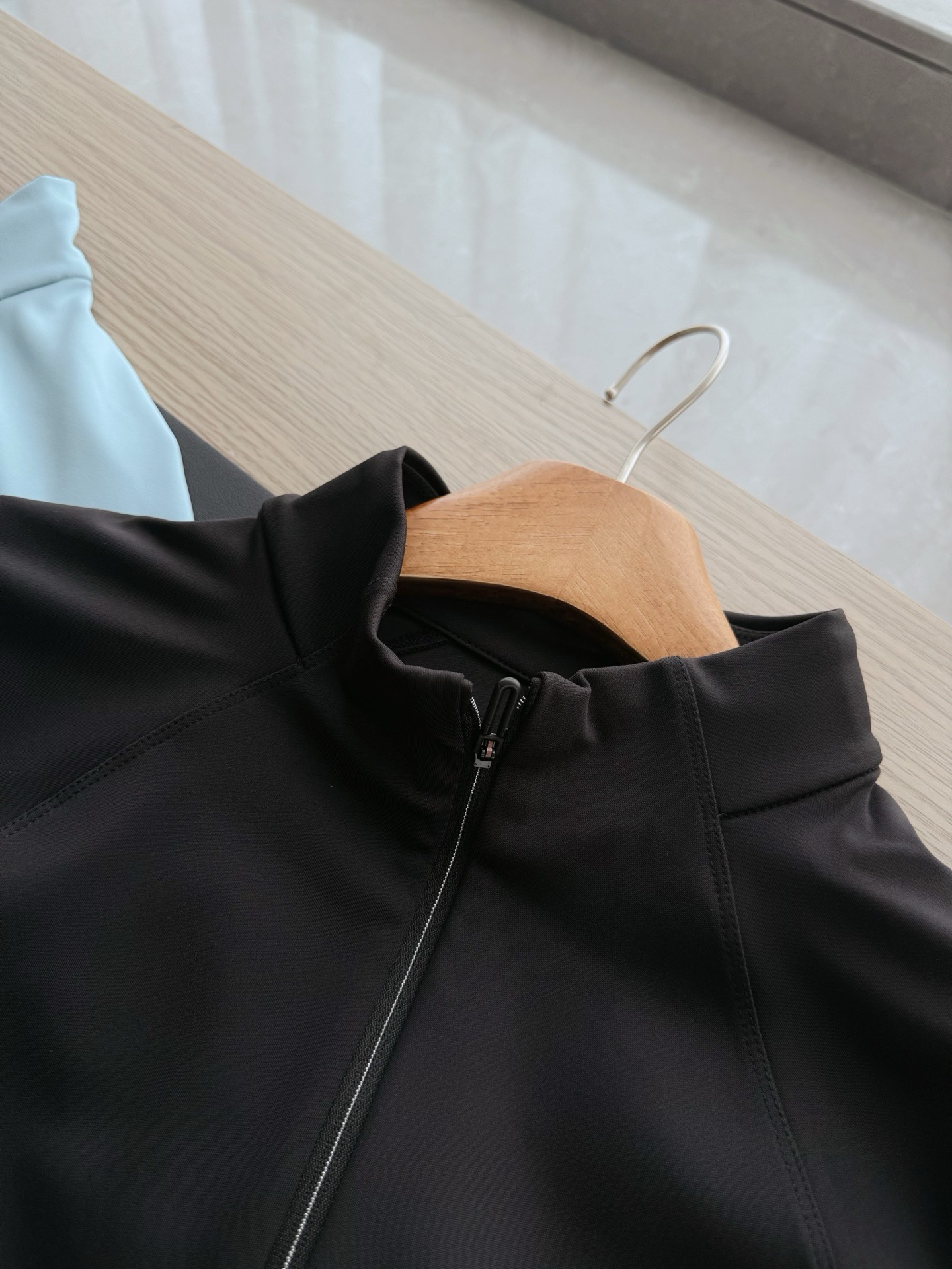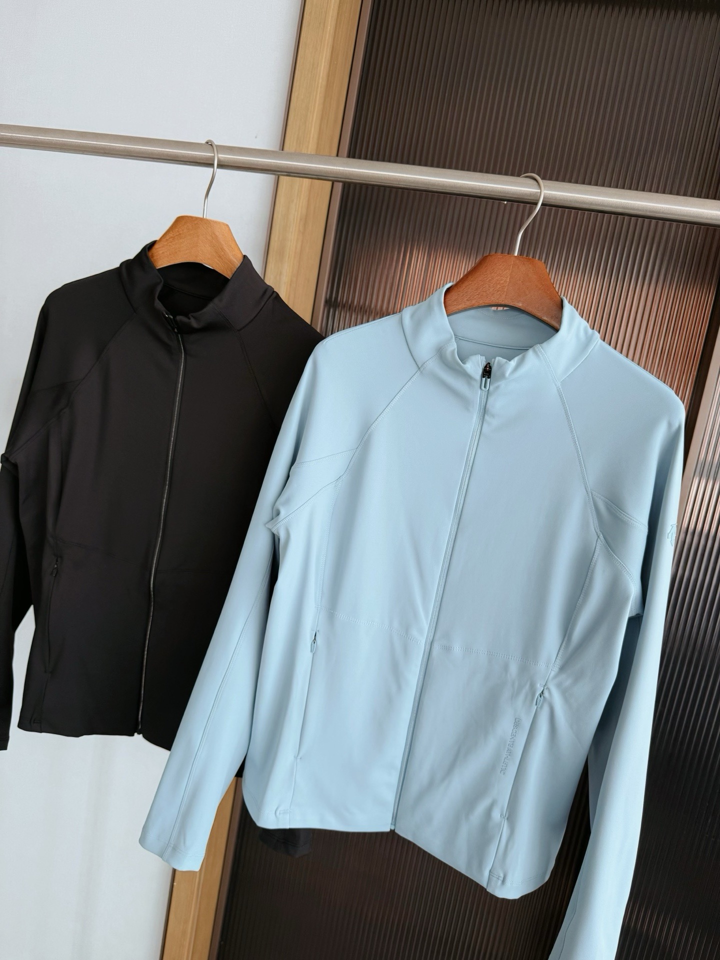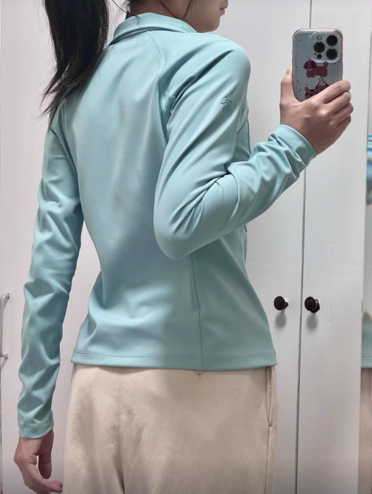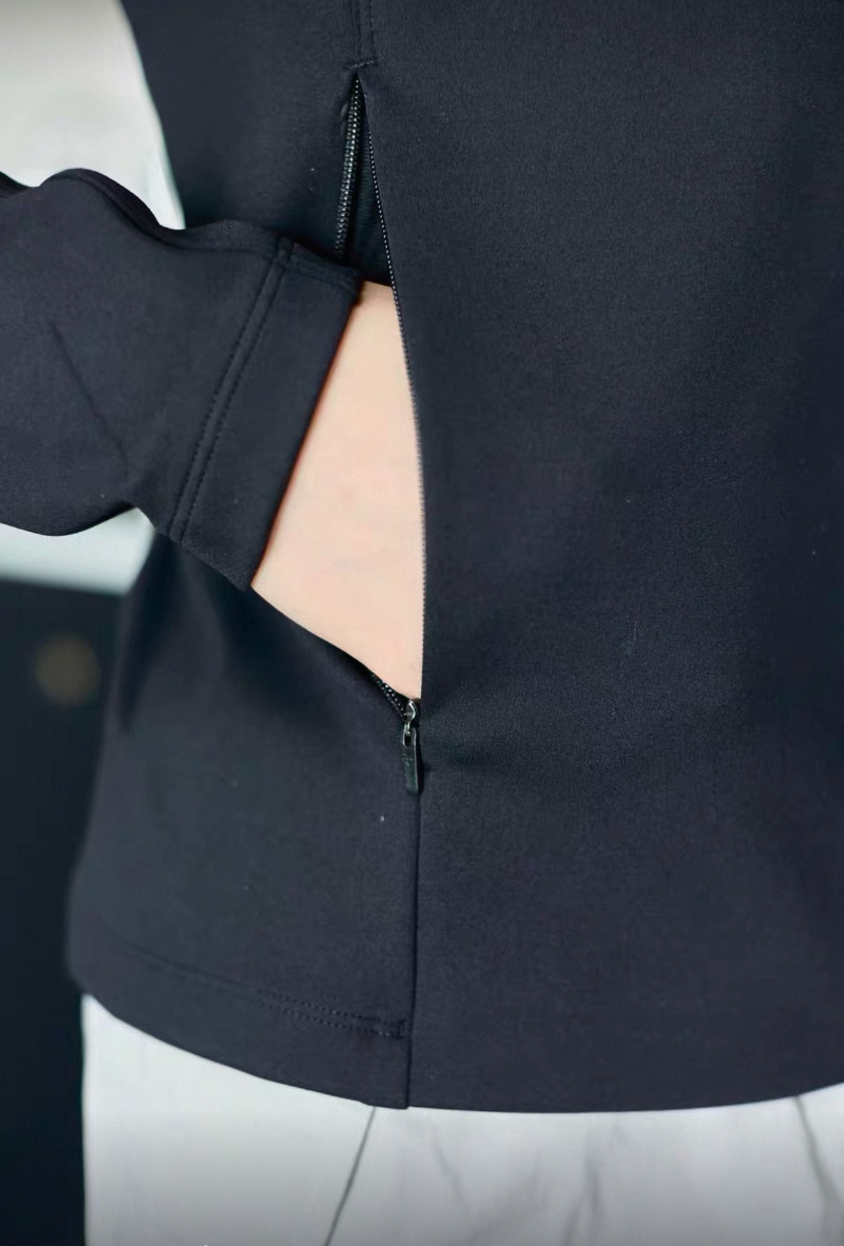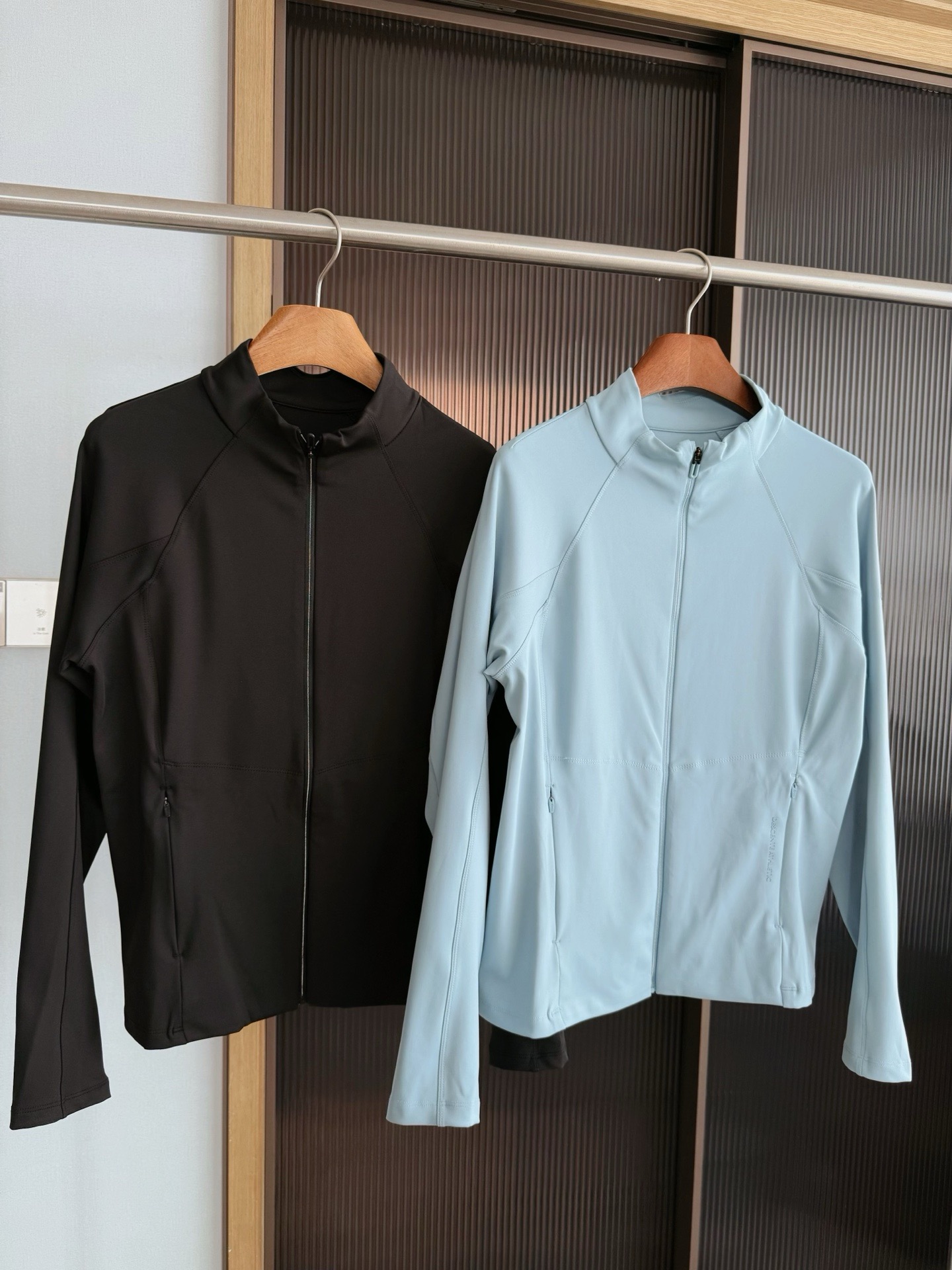 垂坠感很好,整个线条流畅,属于超柔软且高弹类型的,贴身贼舒服!箭头女士四面弹力拉链立领外套
