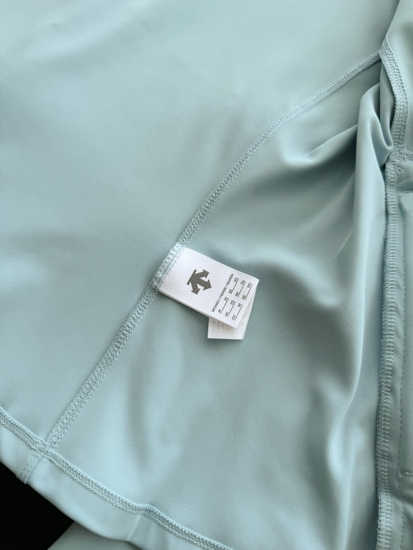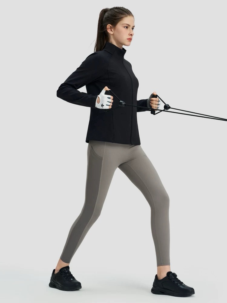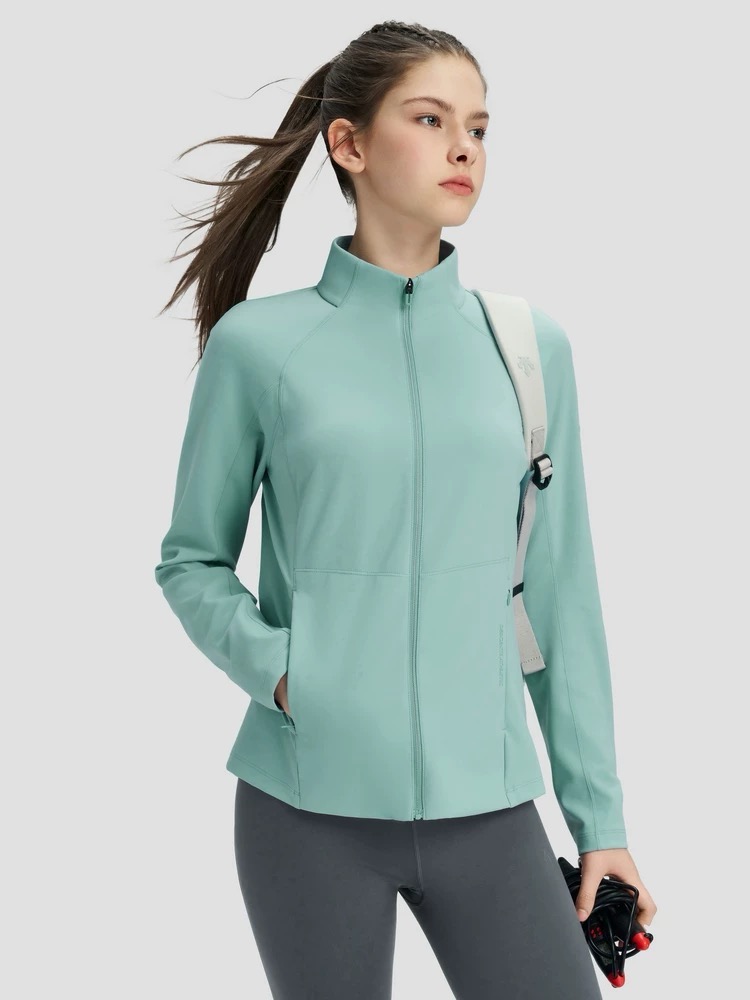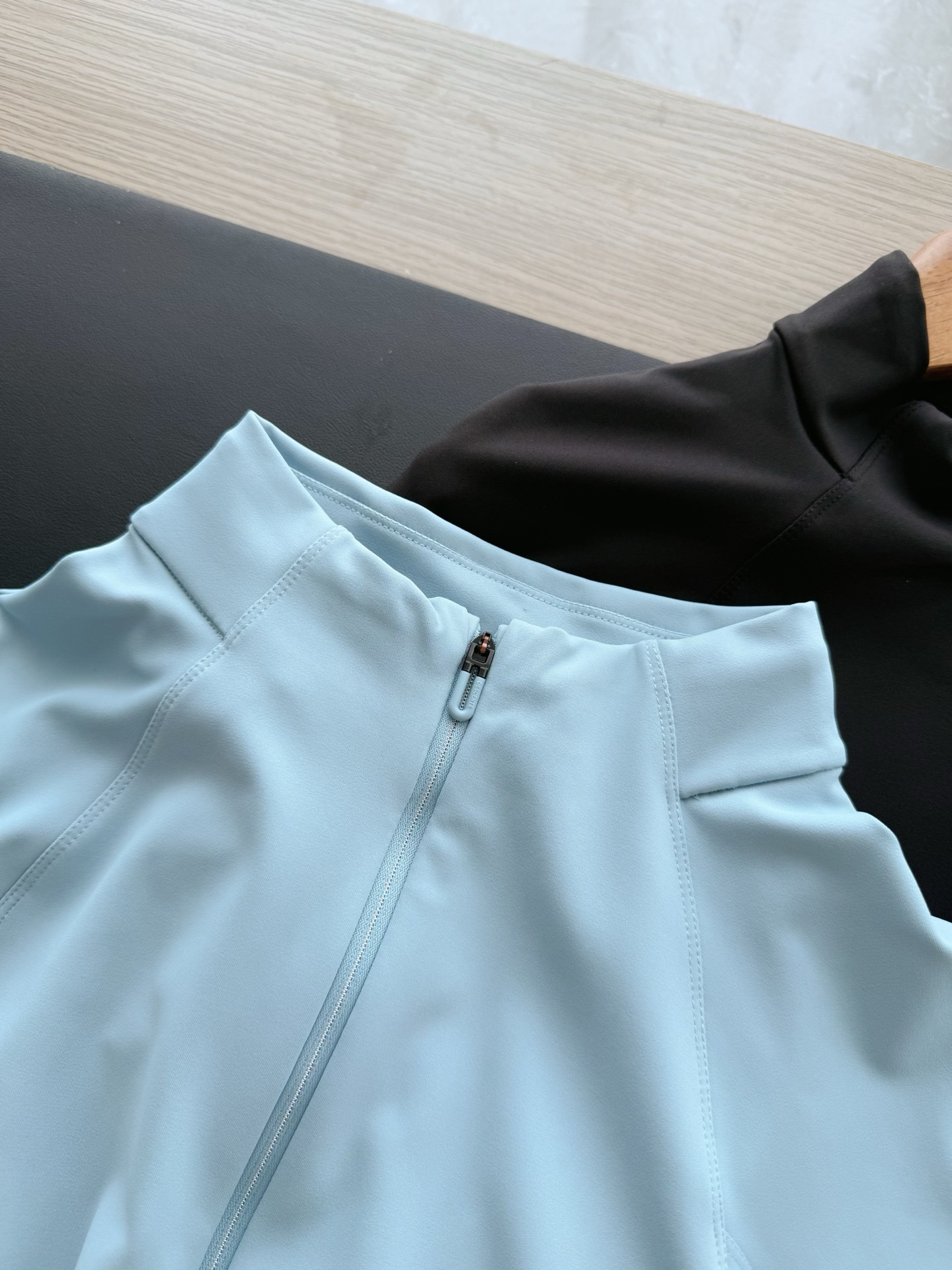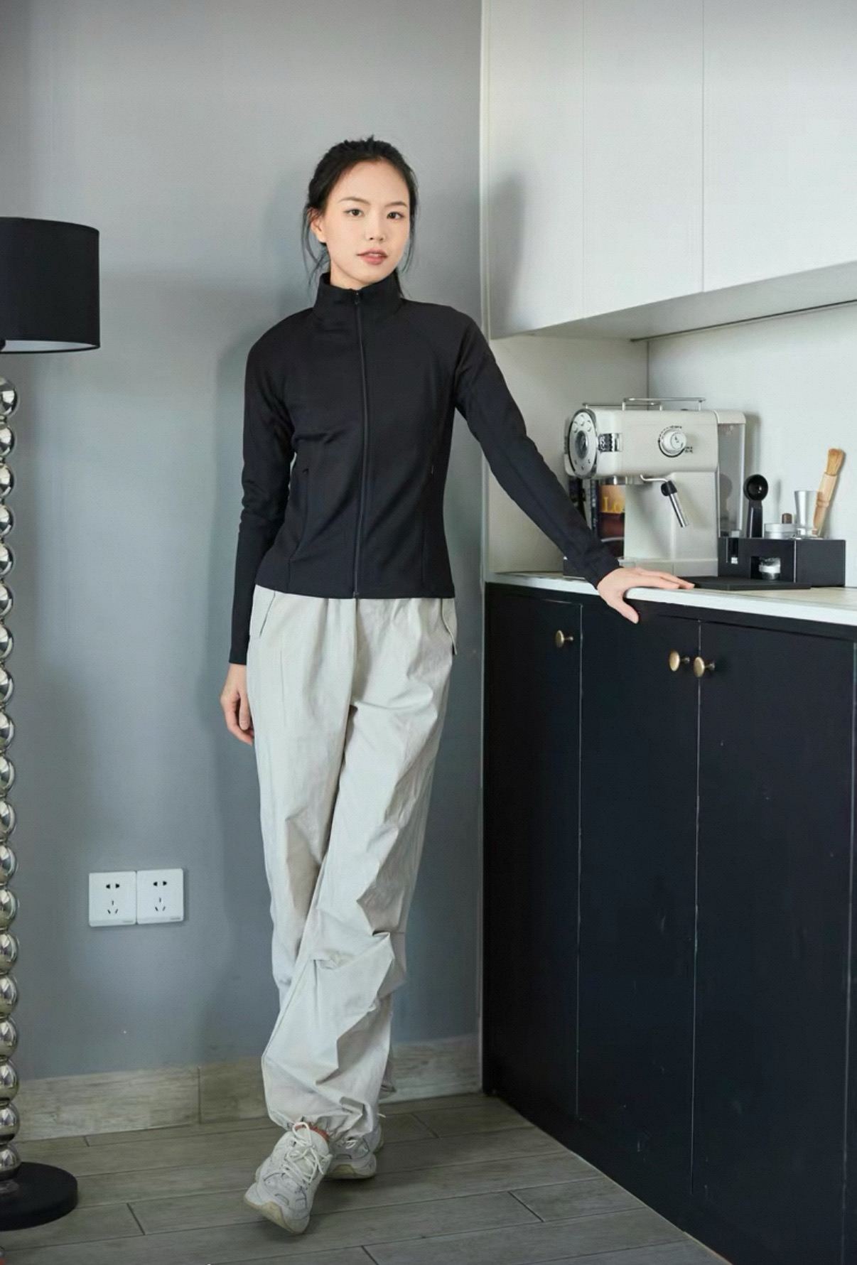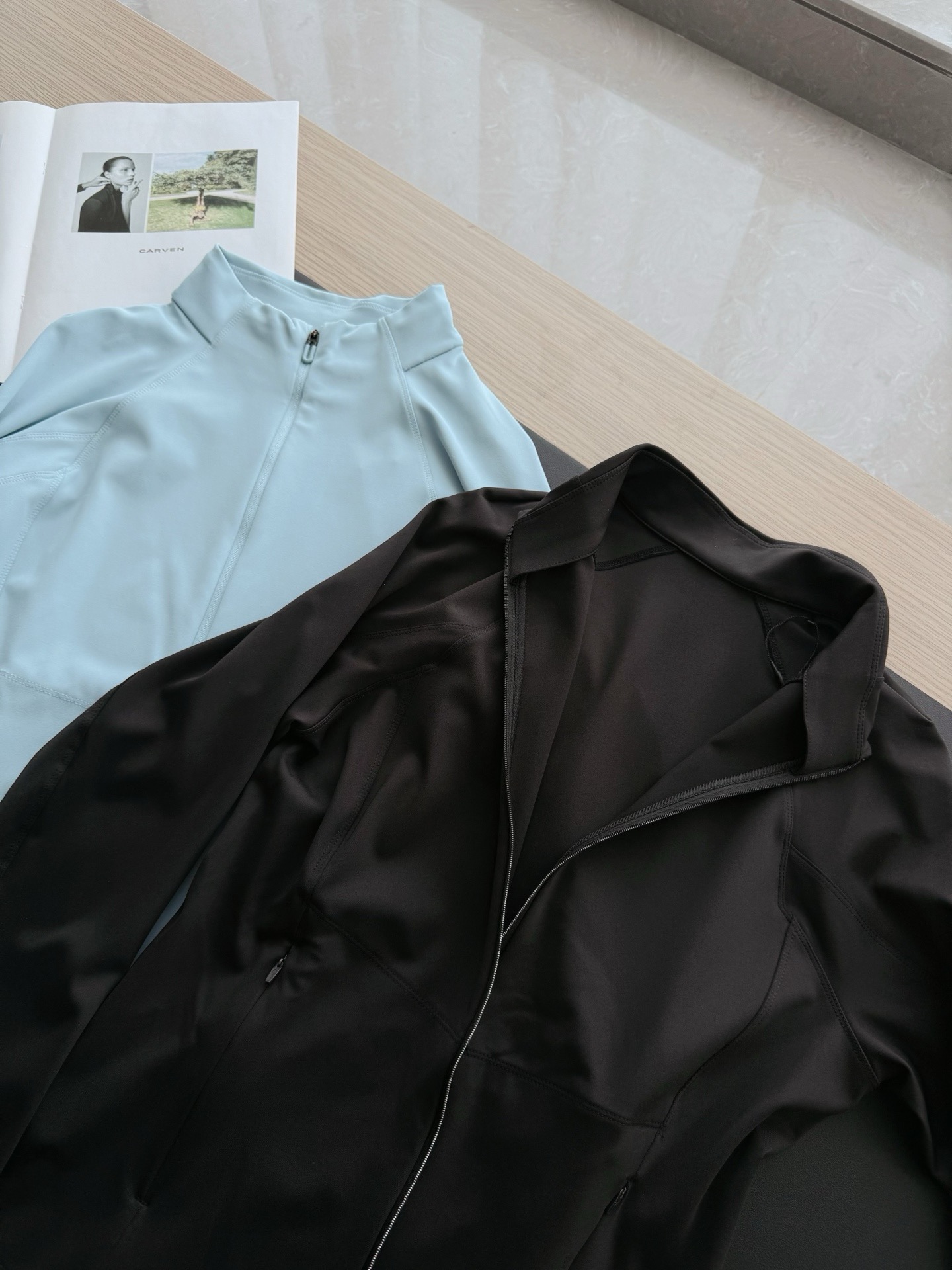 垂坠感很好,整个线条流畅,属于超柔软且高弹类型的,贴身贼舒服!箭头女士四面弹力拉链立领外套