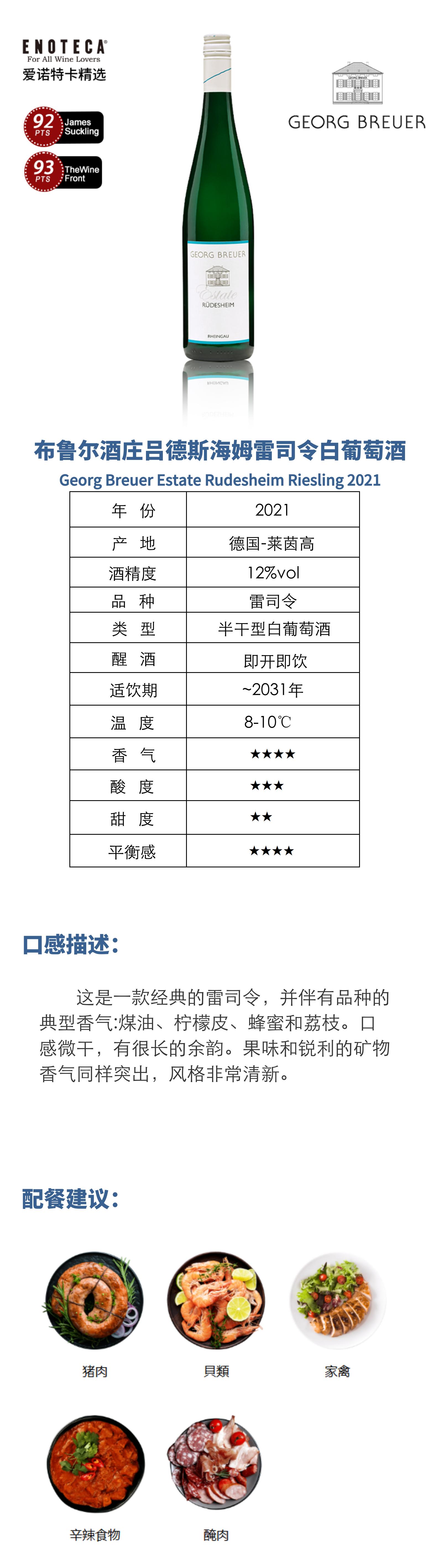 【莱茵高五星雷司令】Georg Breuer Estate Rudesheim Riesling 2021 750Ml 布鲁尔酒庄吕德斯海姆雷司令白葡萄酒